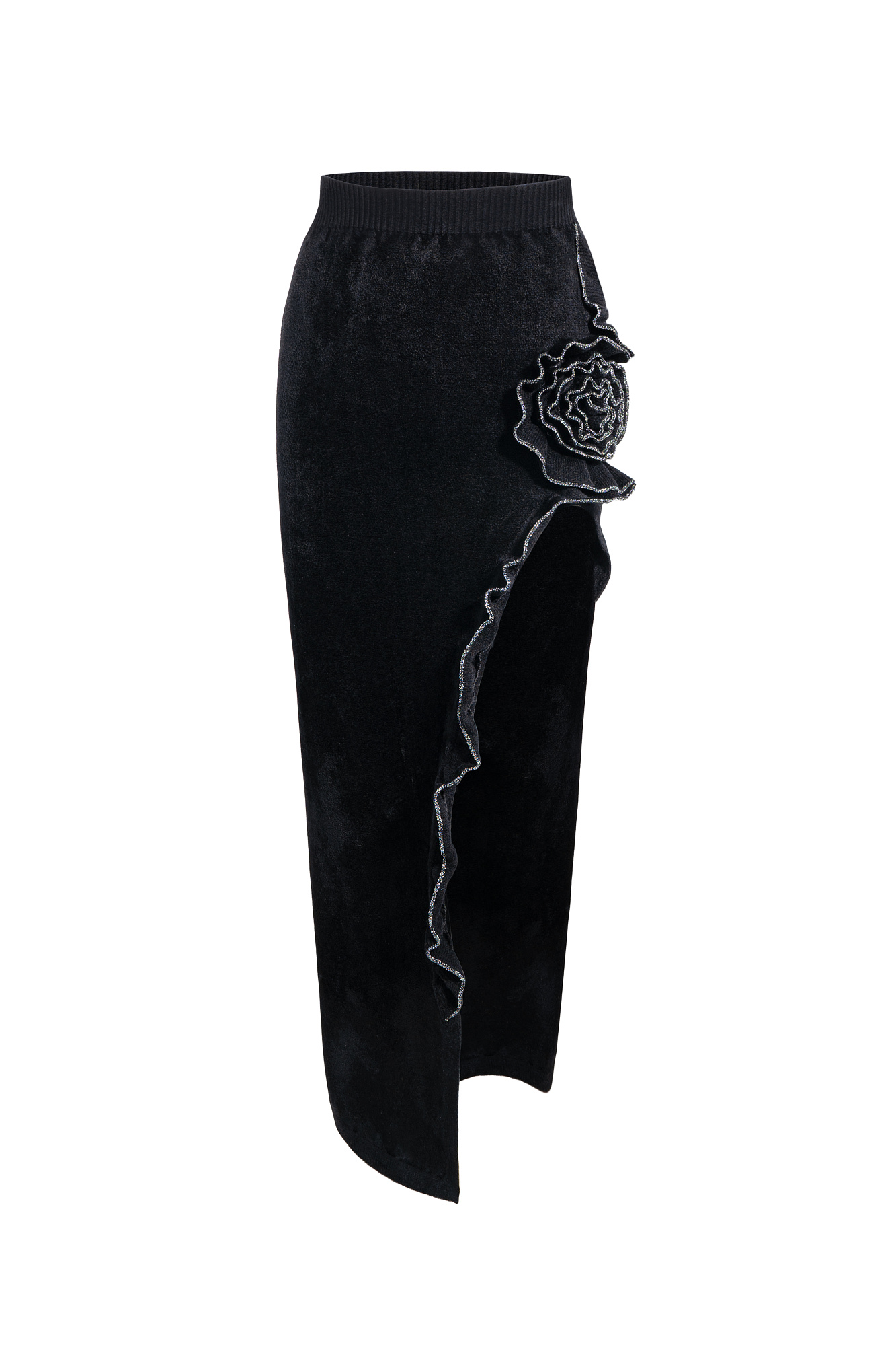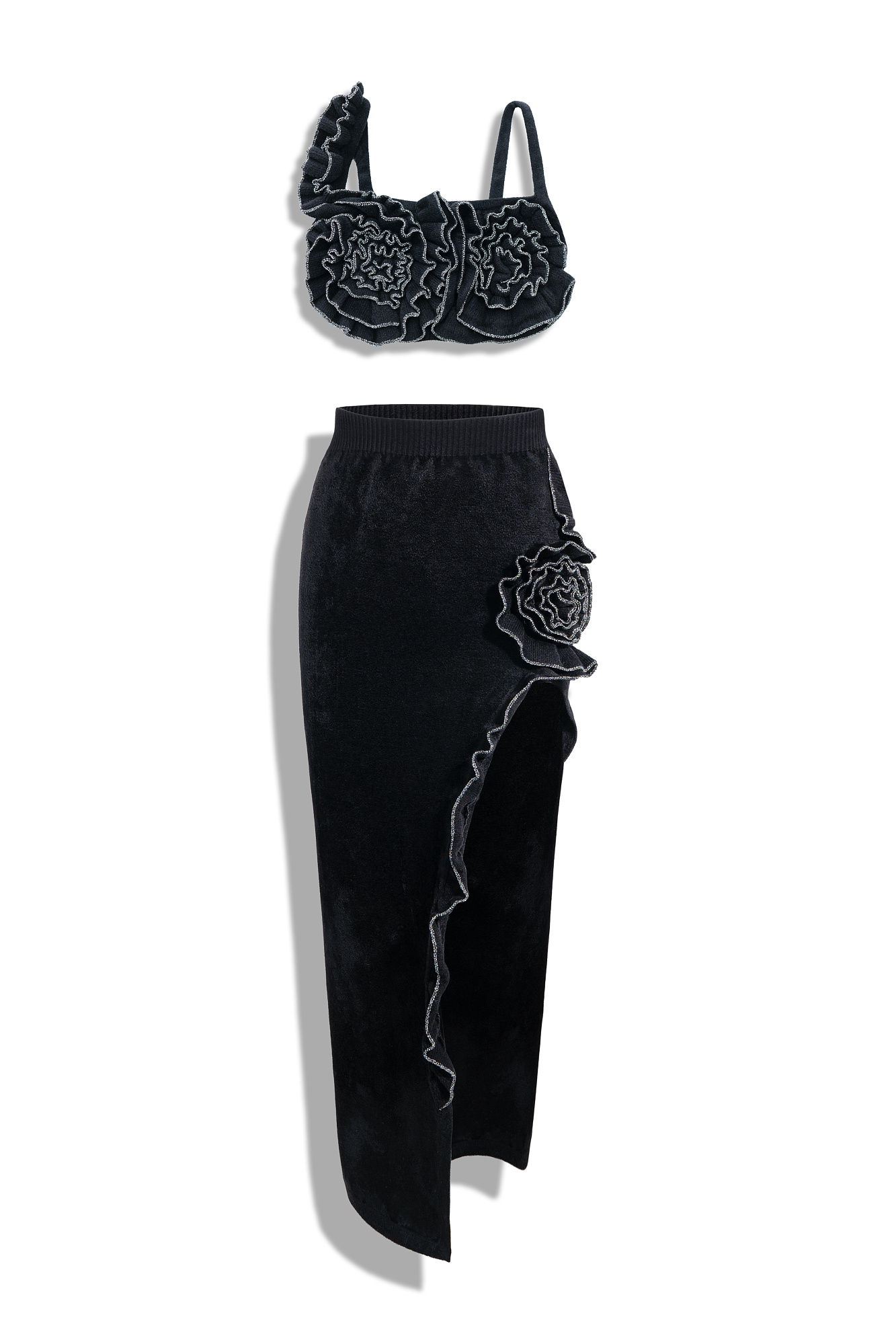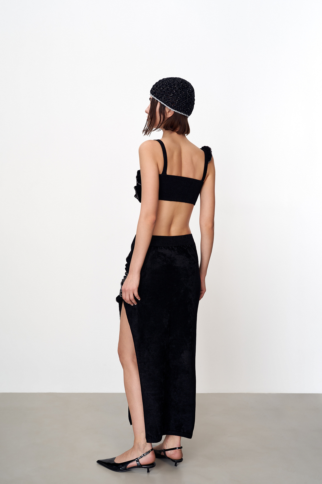 Трикотажный комплект из мягкой бархатистой вискозы, декорированный воланами с серебряным краем. Топ на тонких бретелях с эластичной резинкой на спине. Юбка длины макси с высоким боковым разрезом и эластичным поясом в рубчик.