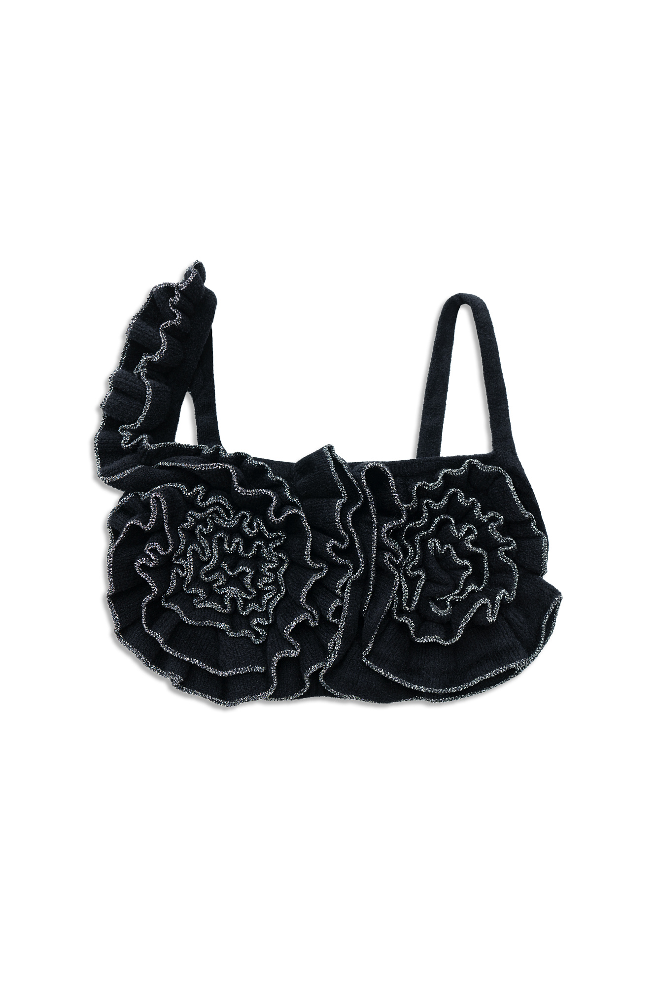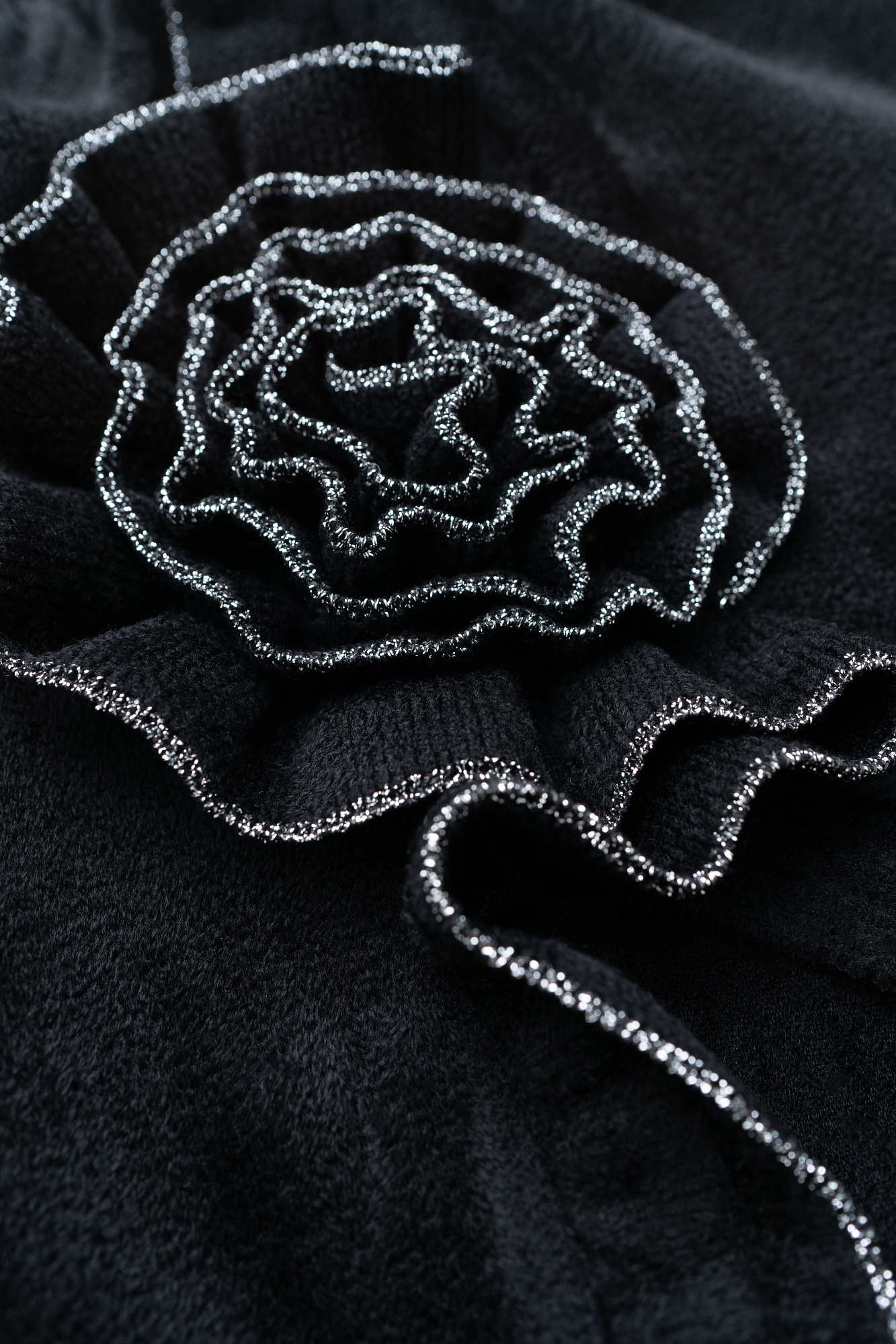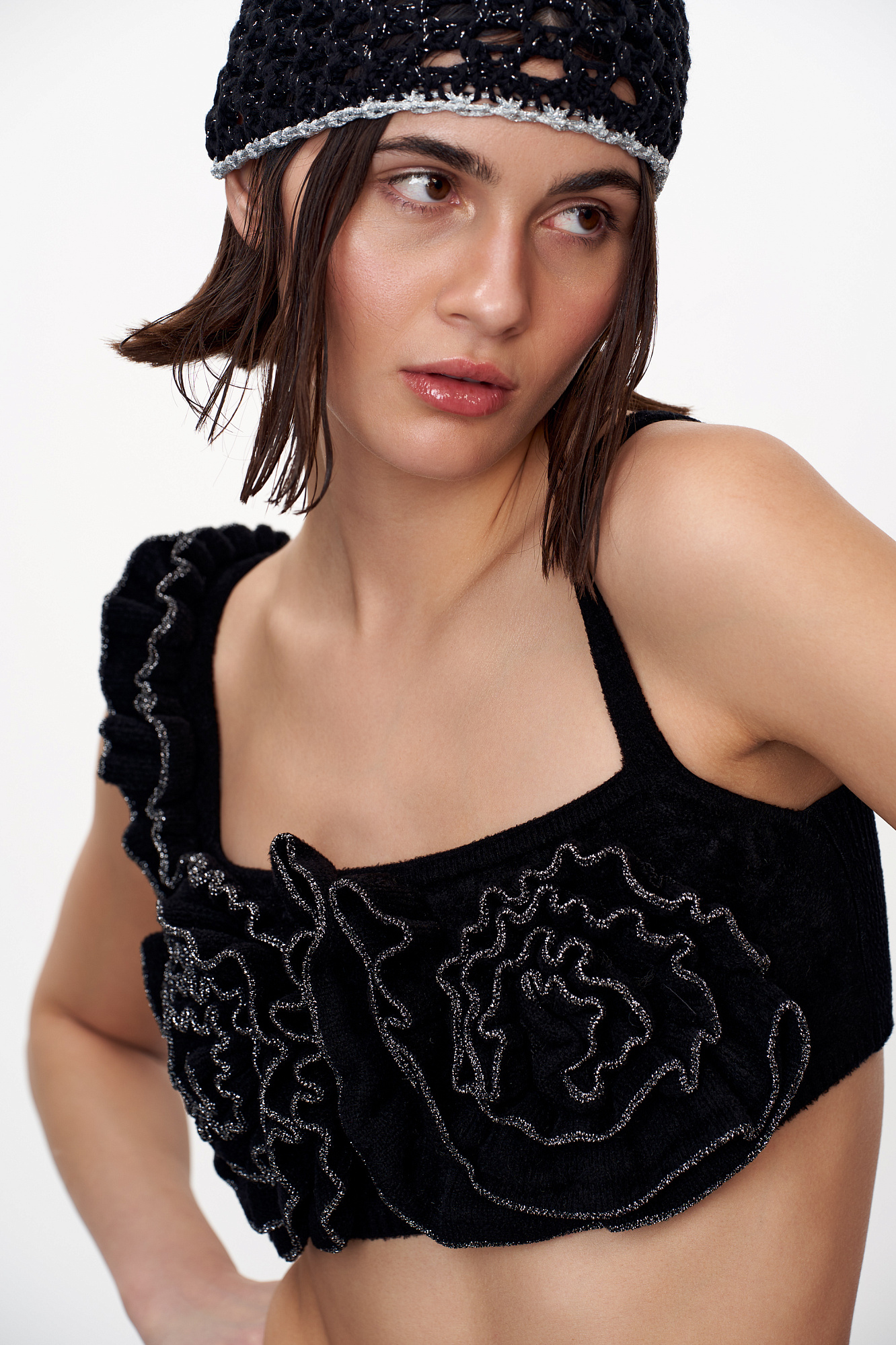 Трикотажный комплект из мягкой бархатистой вискозы, декорированный воланами с серебряным краем. Топ на тонких бретелях с эластичной резинкой на спине. Юбка длины макси с высоким боковым разрезом и эластичным поясом в рубчик.