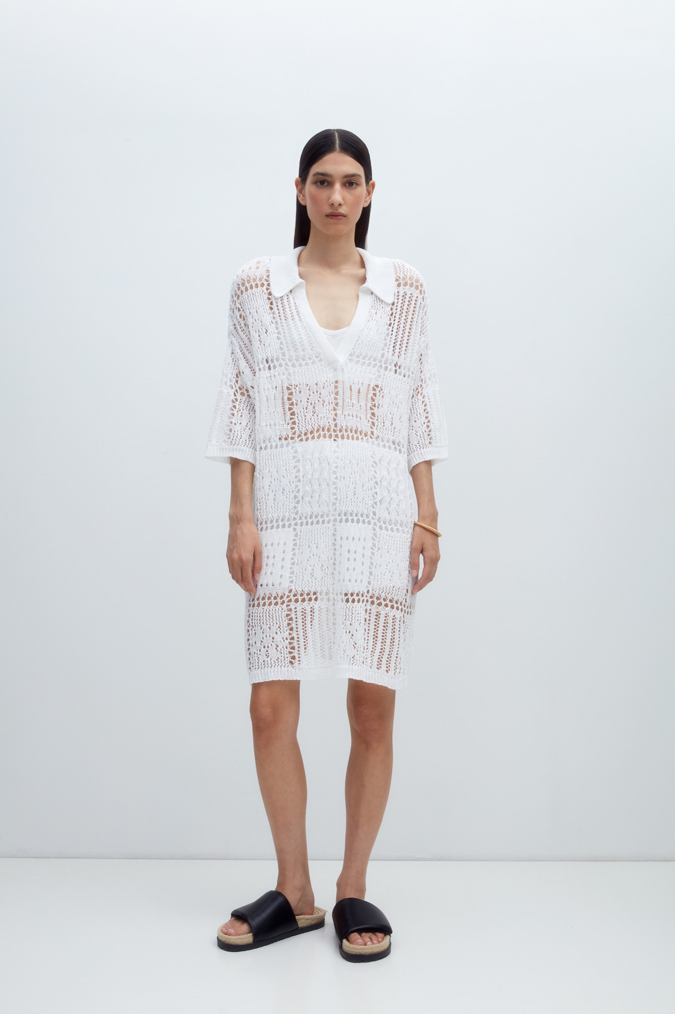 Трикотажный комплект из 100% льна, состоящий из платья длины мини и шорт. Ажурное платье со спущенной линией плеч, рукавом 3/4, V-образным вырезом и отложным воротником. Шорты прямого кроя с эластичным поясом. Края изделия выполнены в рубчик.