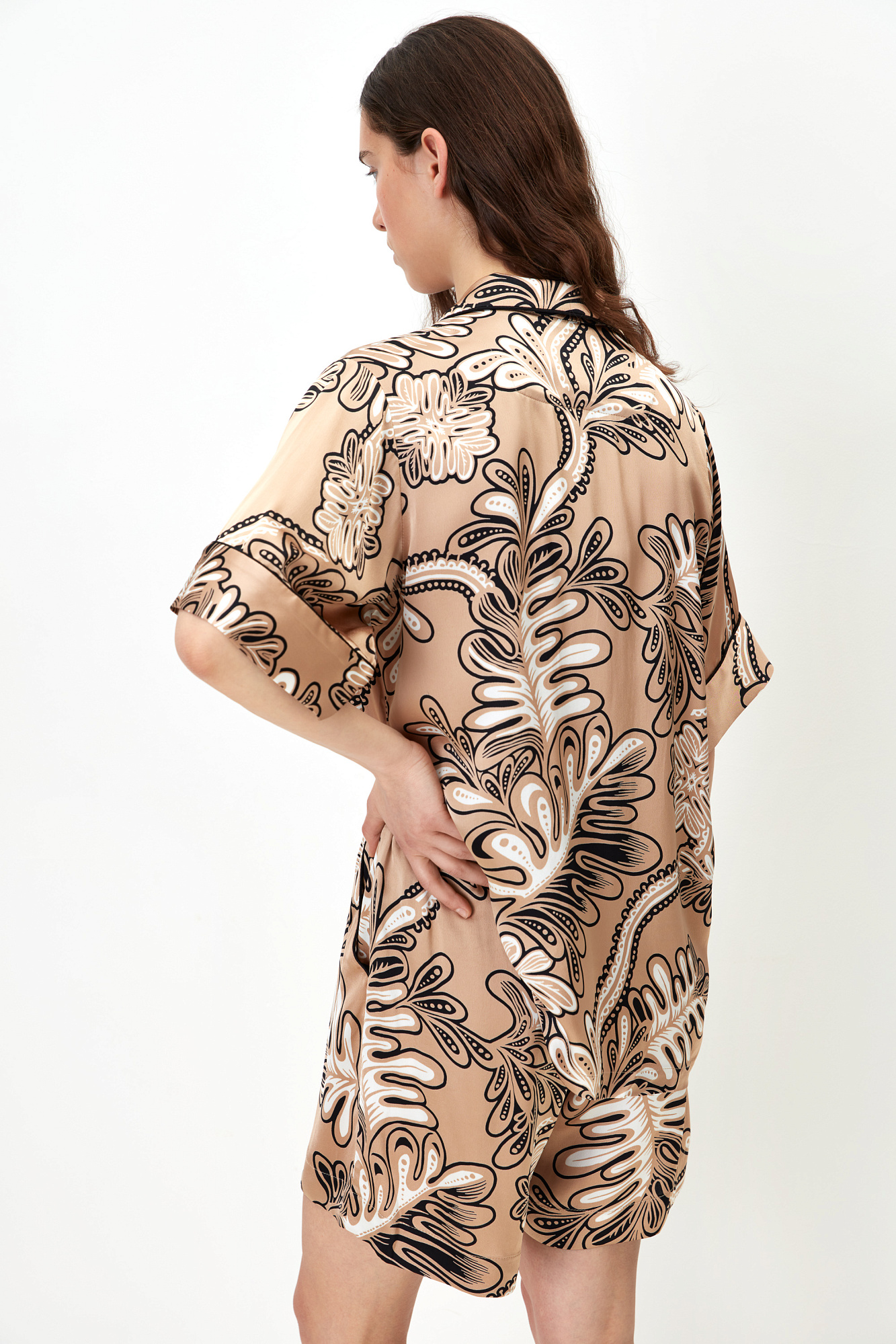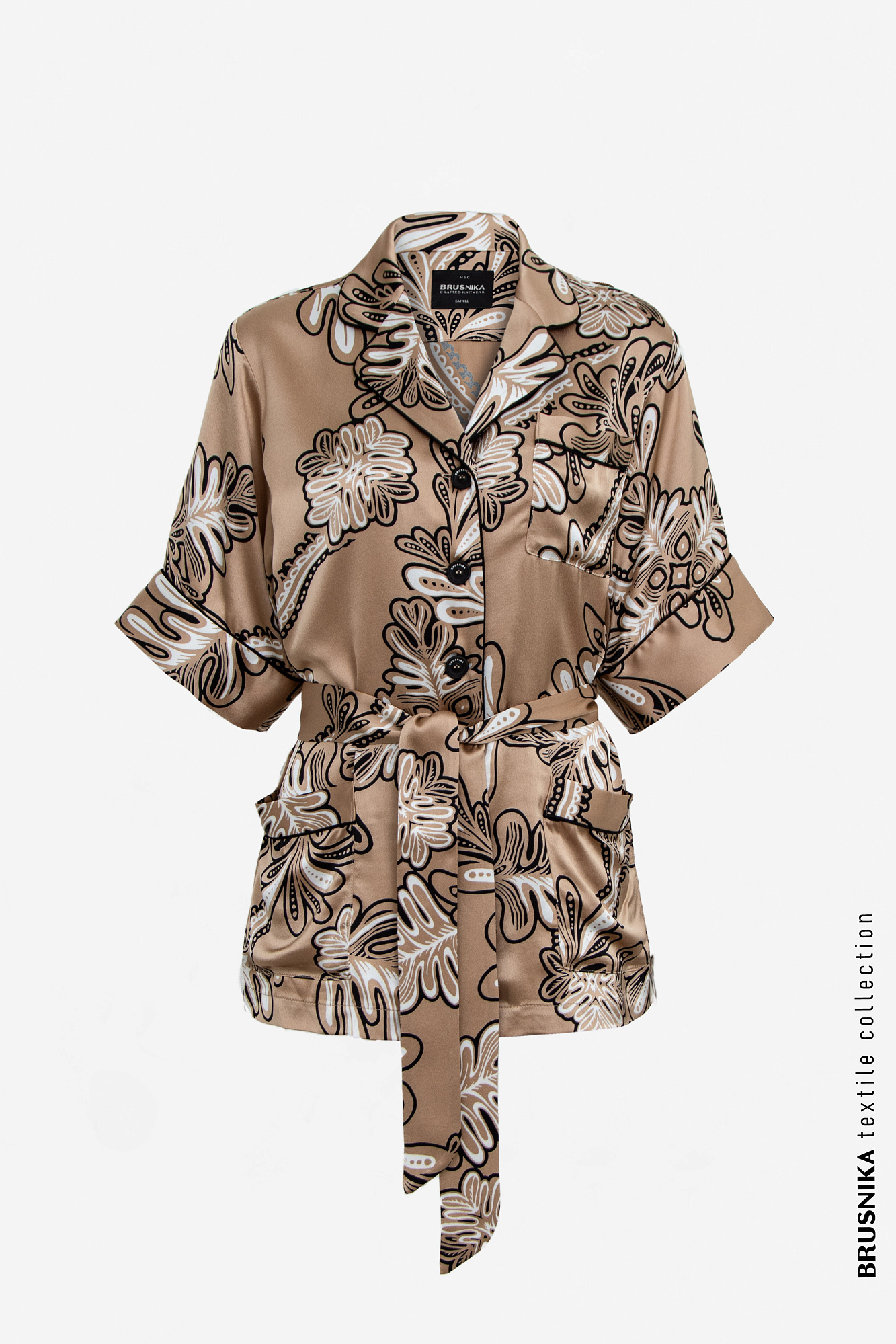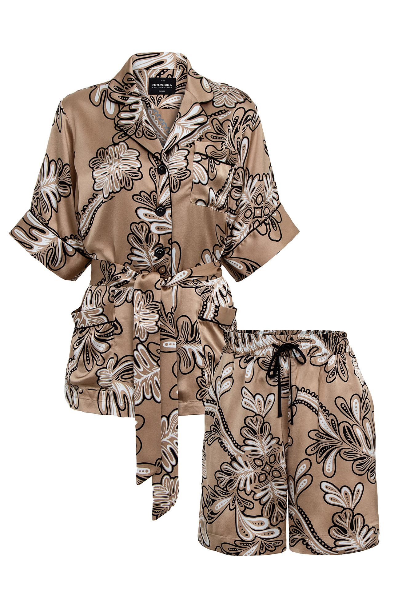 Атласный, принтованный костюм. Рубашка на пуговицах с поясом и накладными карманами. Шорты на резинке с боковыми карманами.