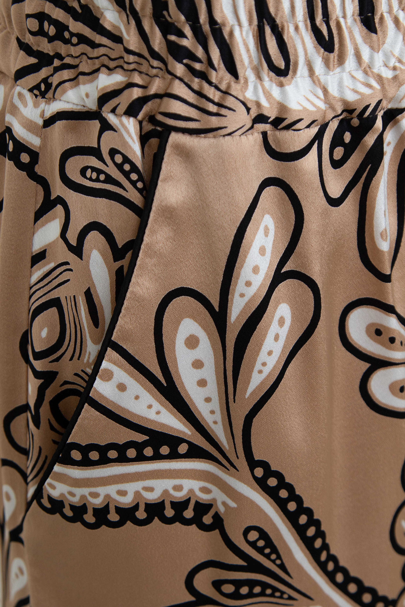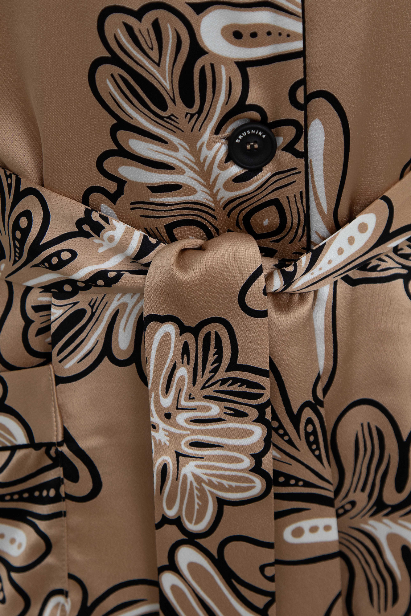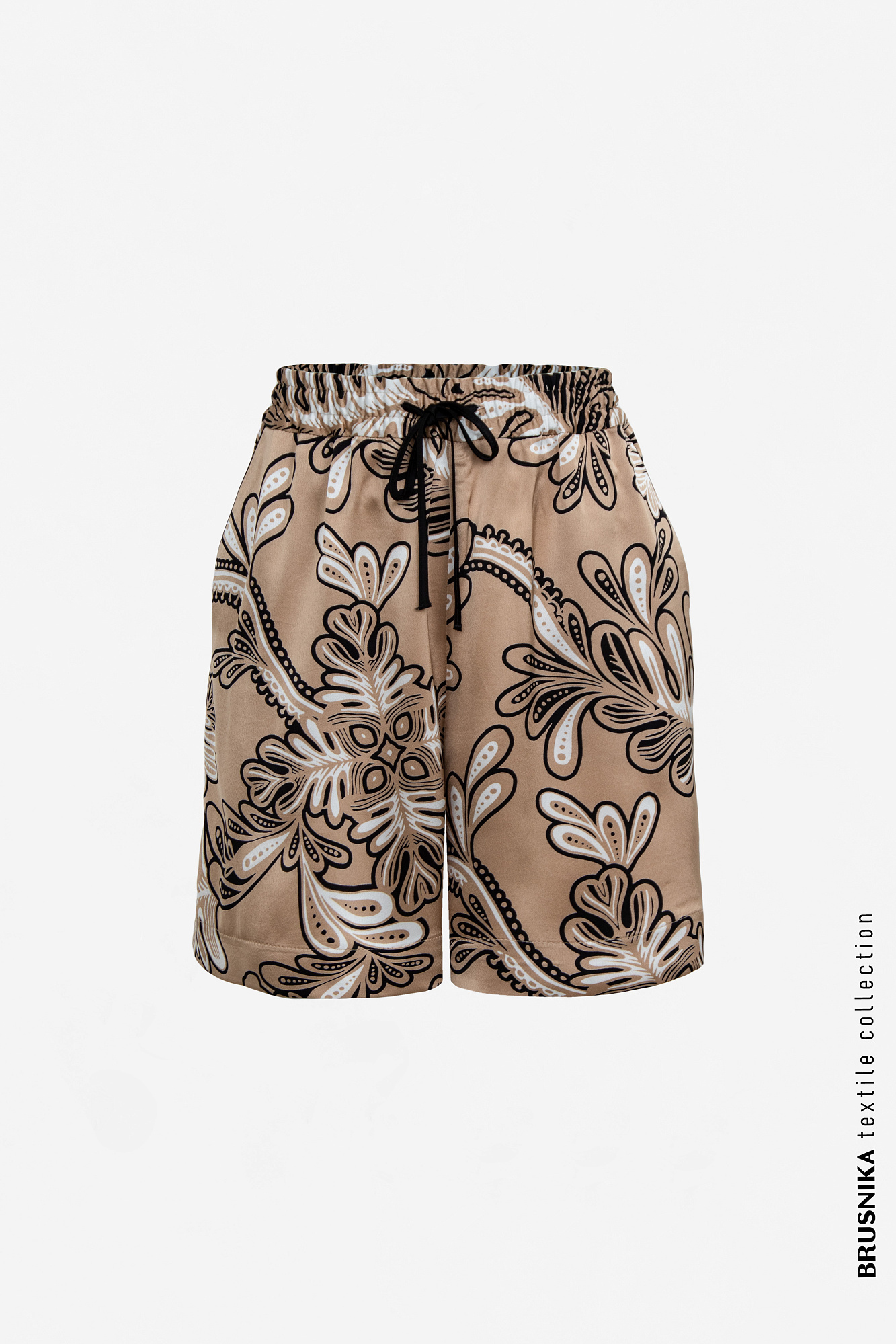 Атласный, принтованный костюм. Рубашка на пуговицах с поясом и накладными карманами. Шорты на резинке с боковыми карманами.