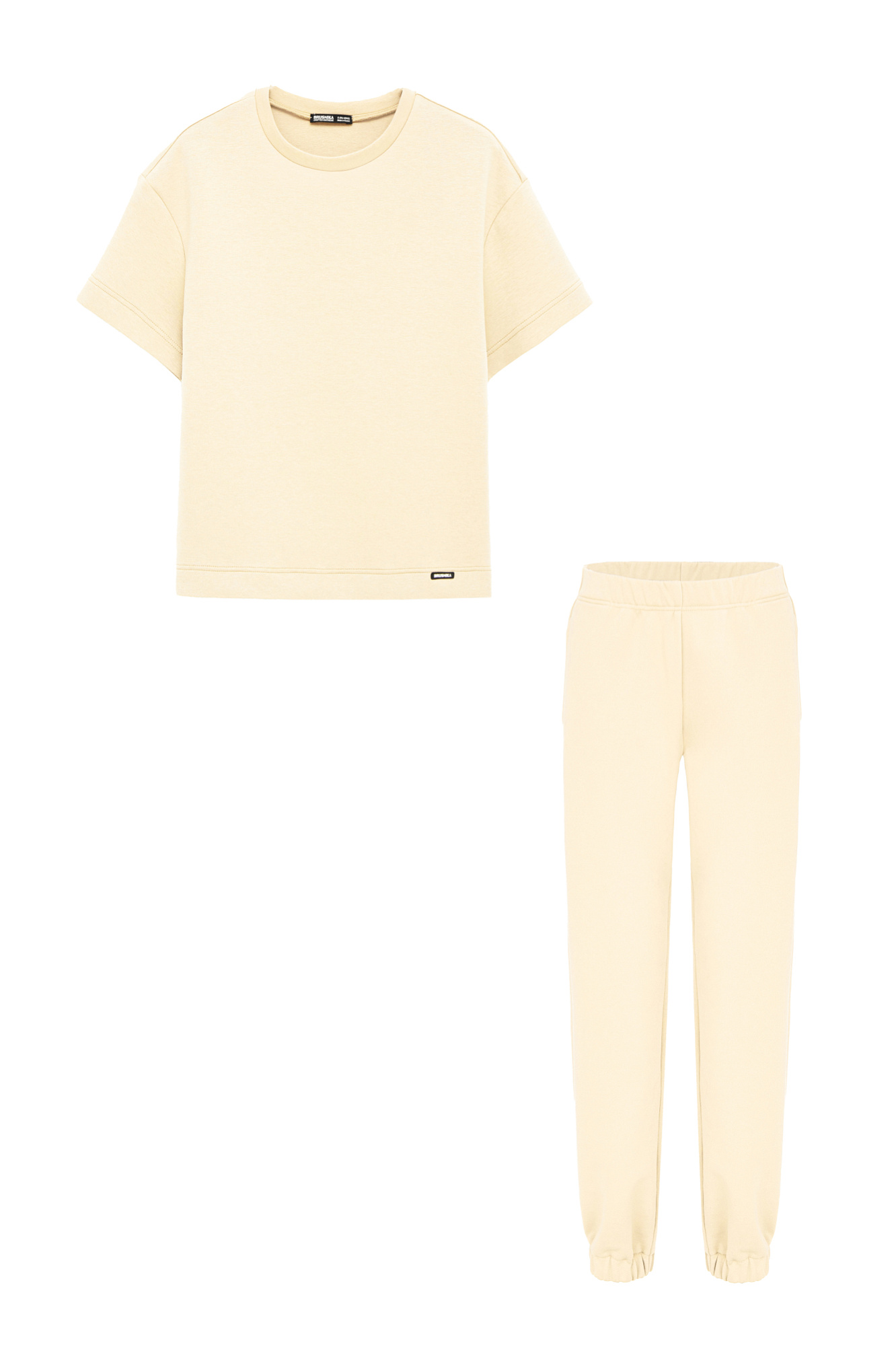 Футерный костюм из хлопка, состоящий из футболки и брюк. Футболка свободного кроя, с короткими рукавами и круглым вырезом горловины. Брюки прямого кроя, с эластичным поясом на резинке, манжеты штатин также выполнены на резинке.