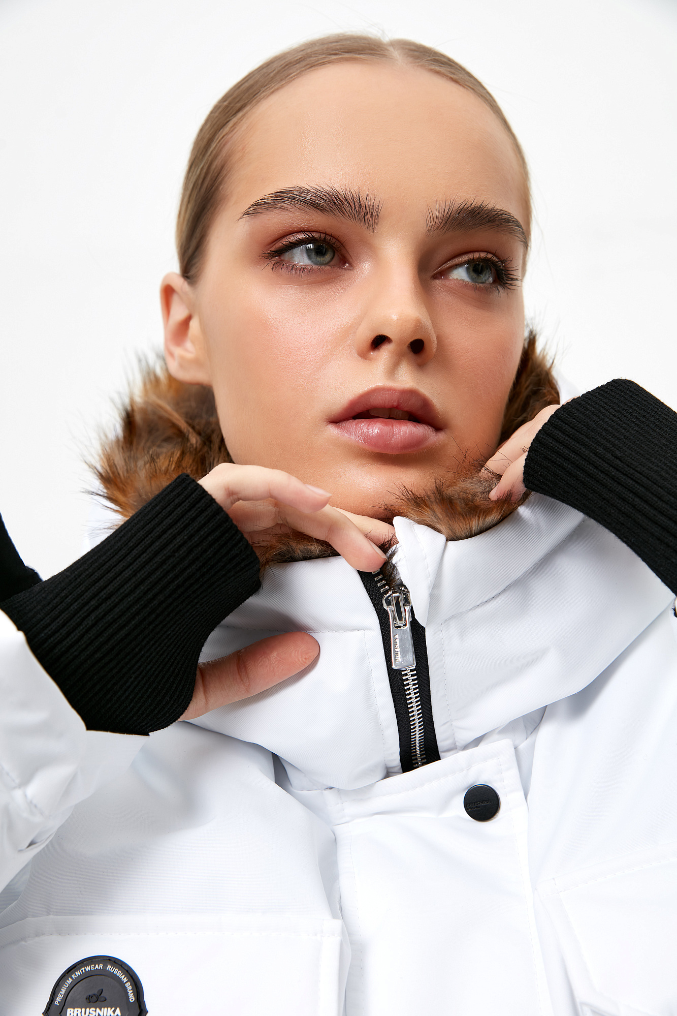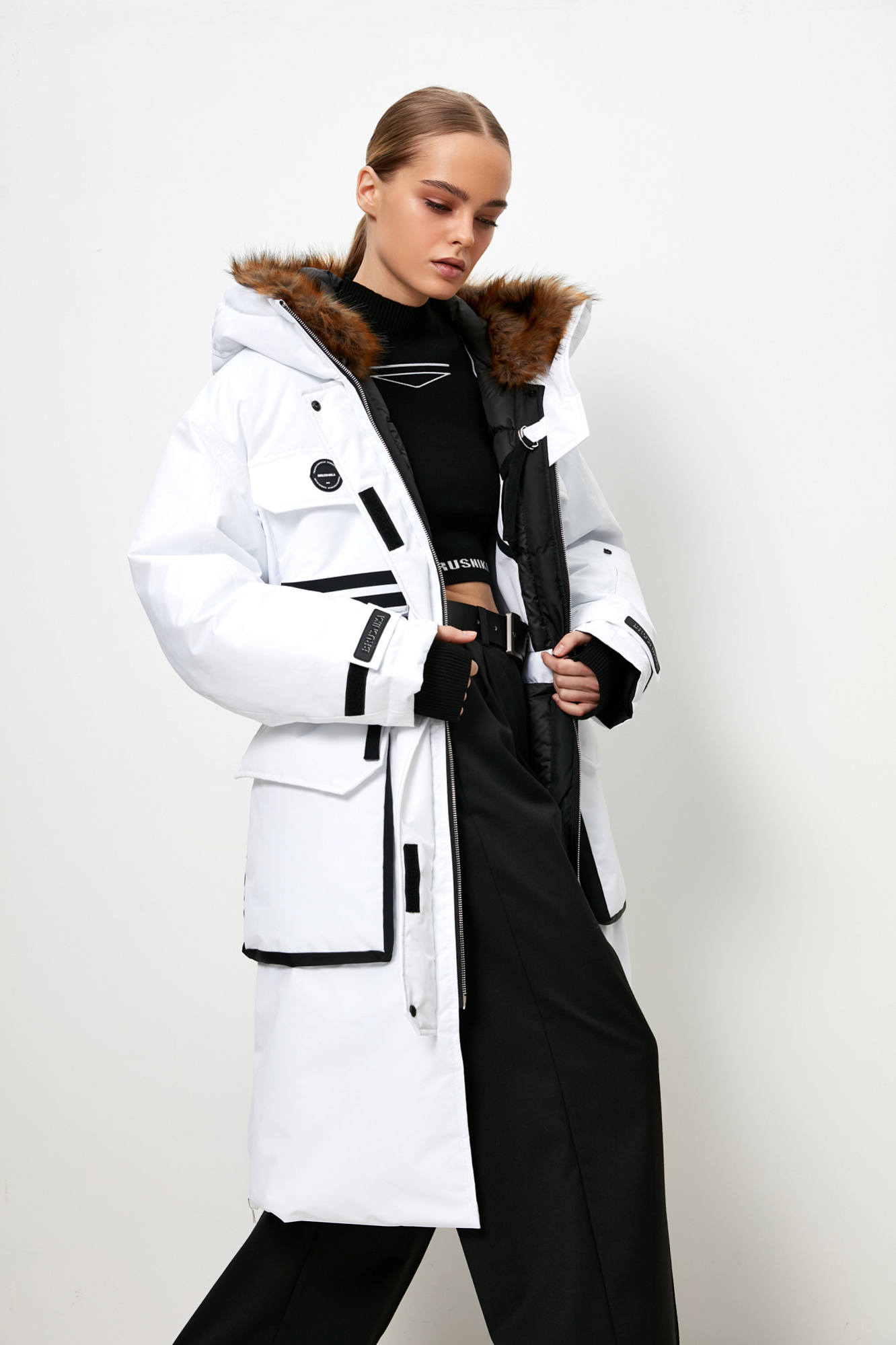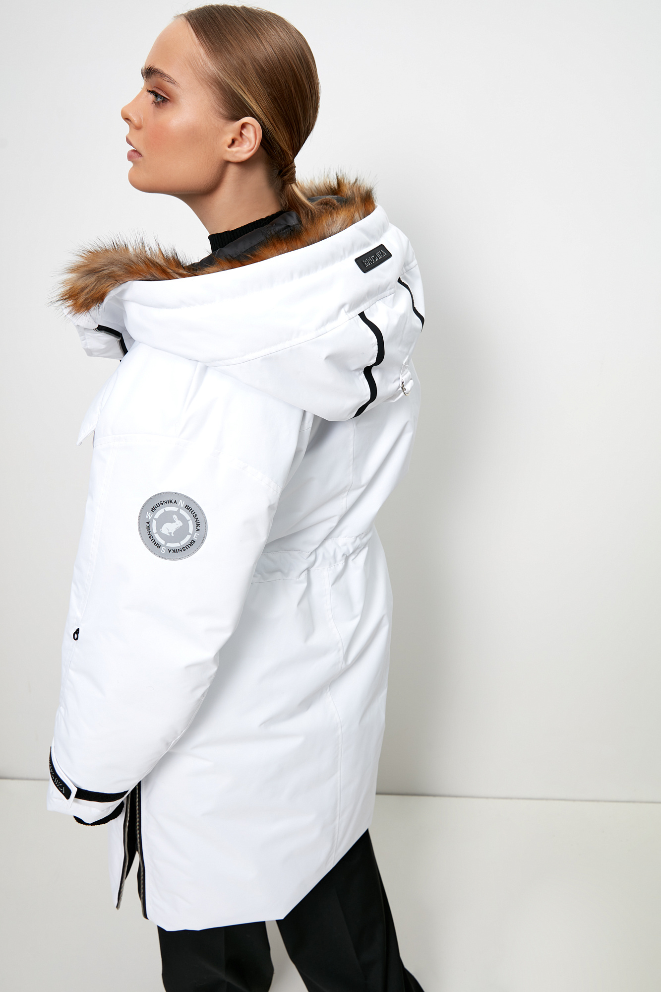 Удлиненная куртка на молнии с капюшоном из экомеха, наполнитель пух-перо, внутренняя кулиска на талии, накладные карманы спереди, фиксаторами на манжетах. Хороший показатель водонепроницаемости, выдержит слабый дождь и мокрый снег.