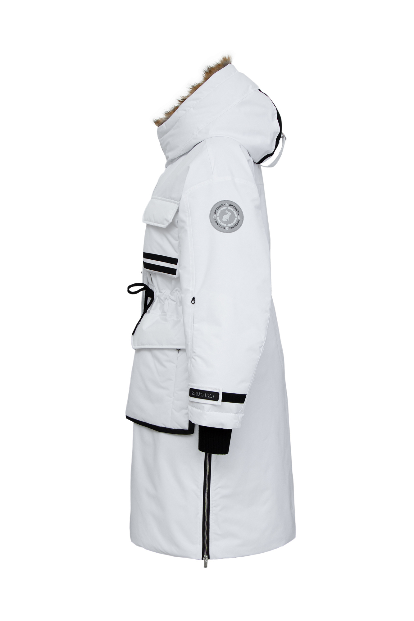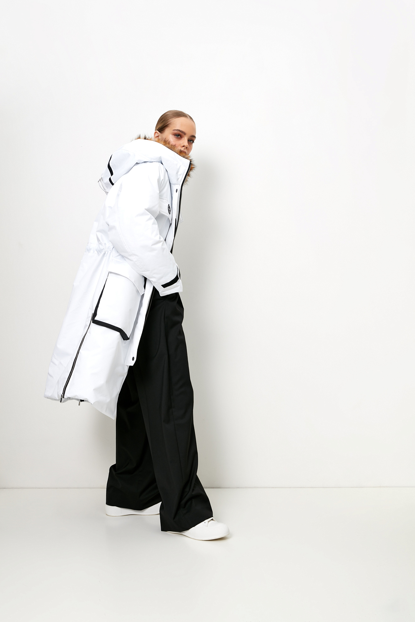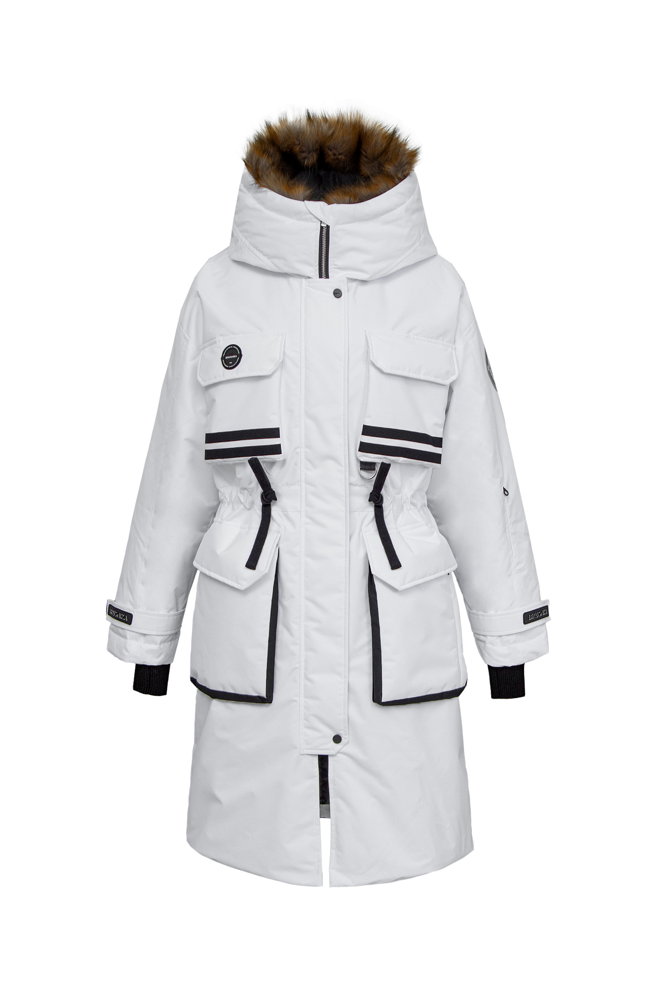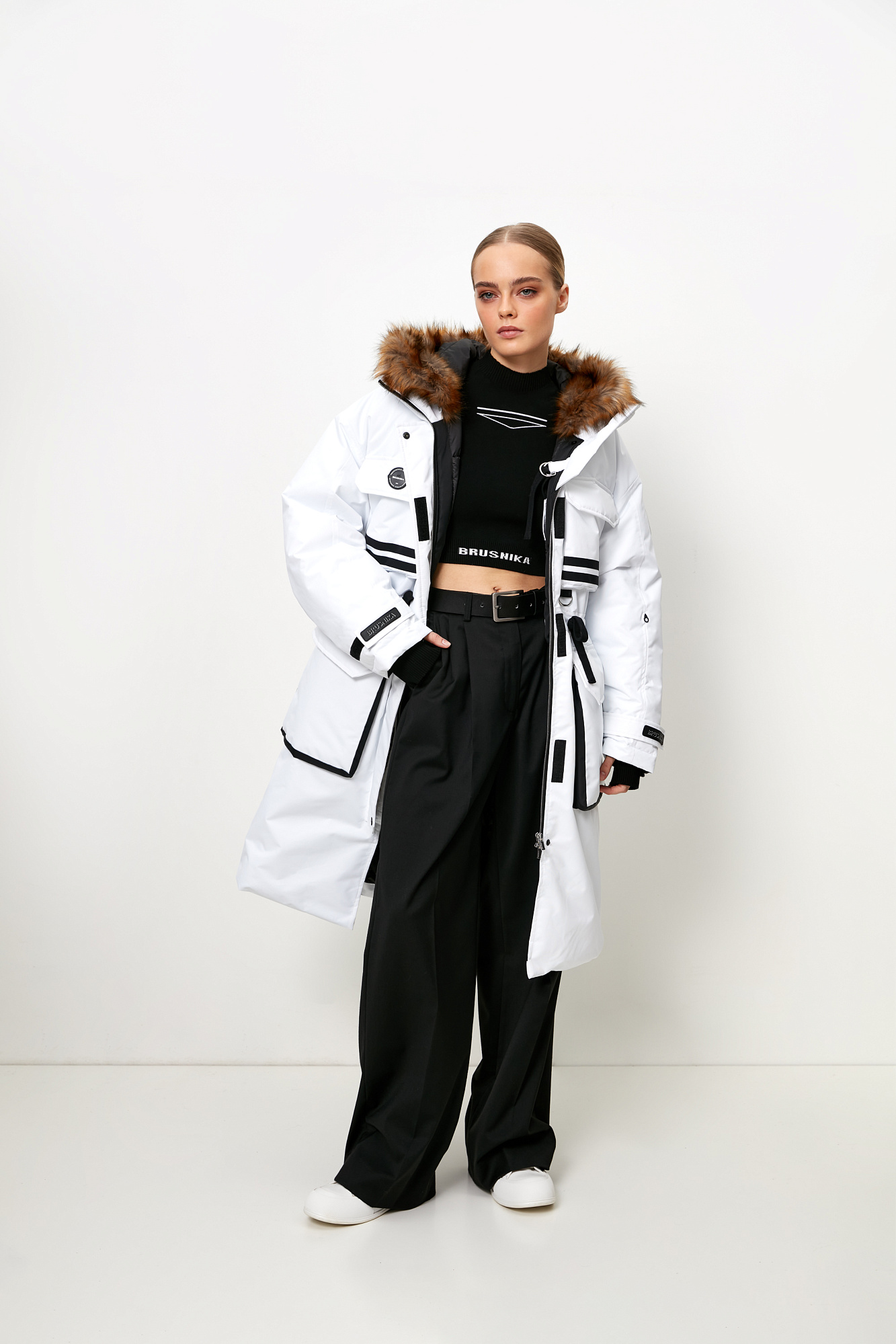Удлиненная куртка на молнии с капюшоном из экомеха, наполнитель пух-перо, внутренняя кулиска на талии, накладные карманы спереди, фиксаторами на манжетах. Хороший показатель водонепроницаемости, выдержит слабый дождь и мокрый снег.