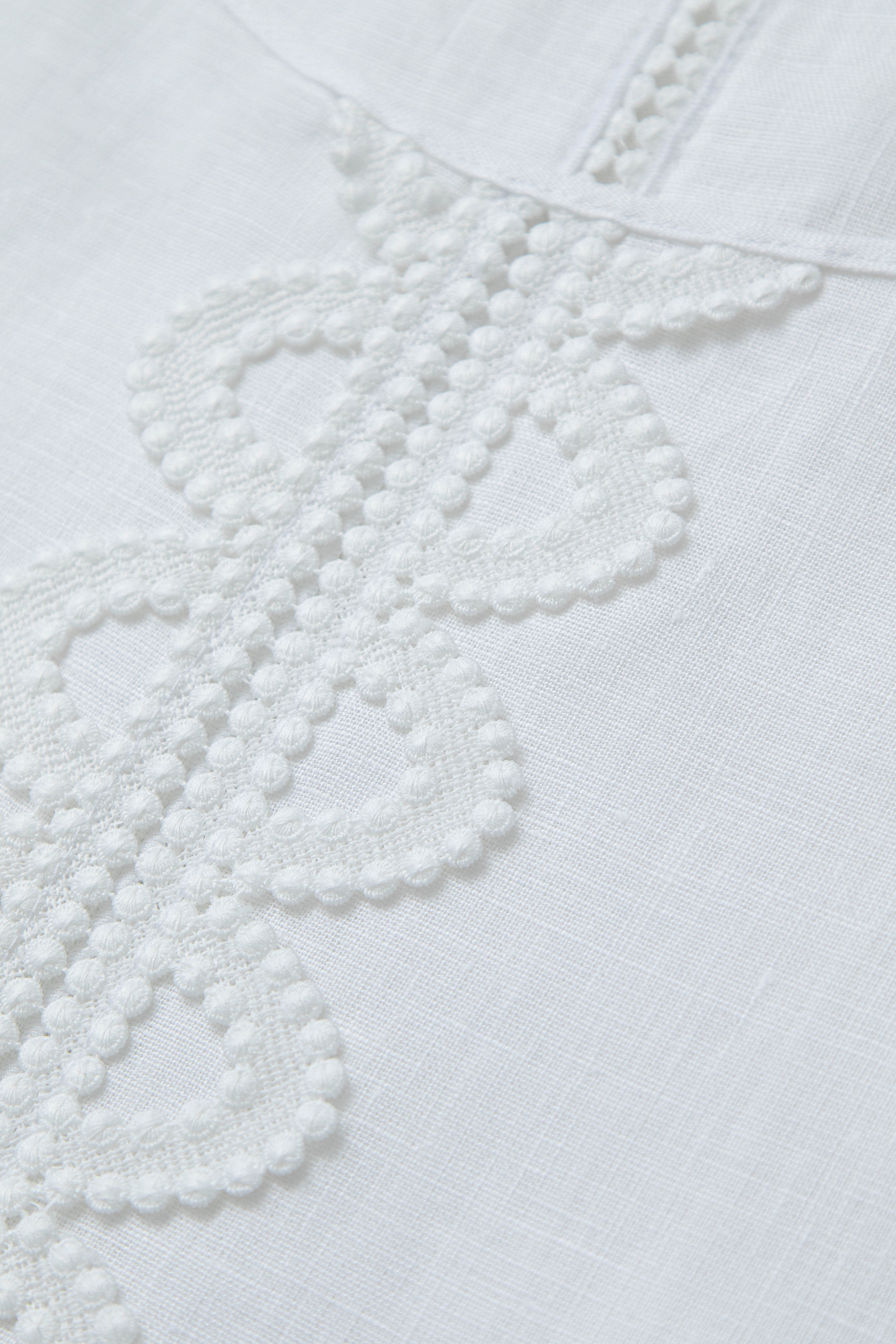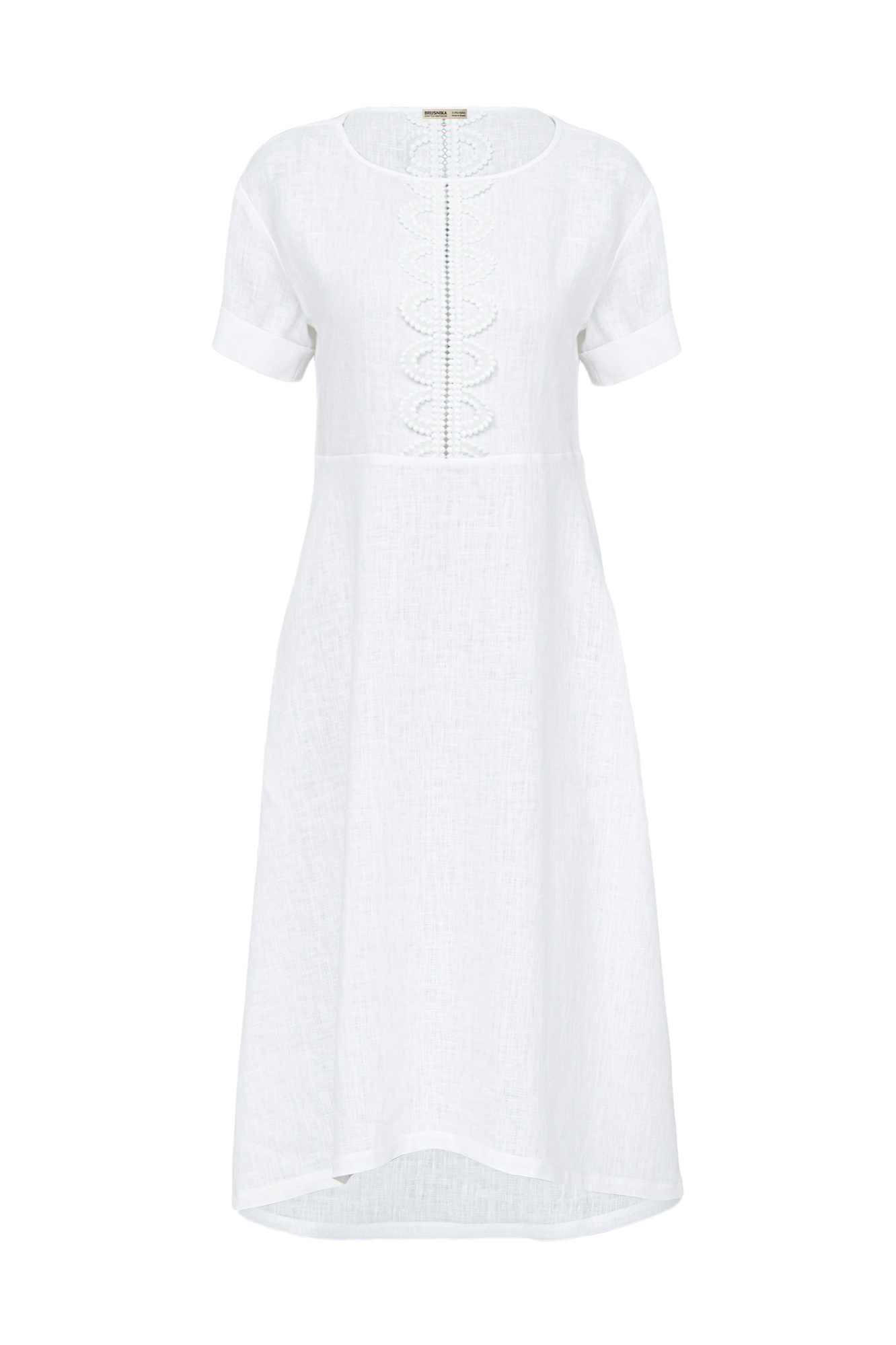 Платье длины миди из 100% льна. Модель с коротким рукавом и круглым вырезом горловины. Изделие декорировано кружевом.