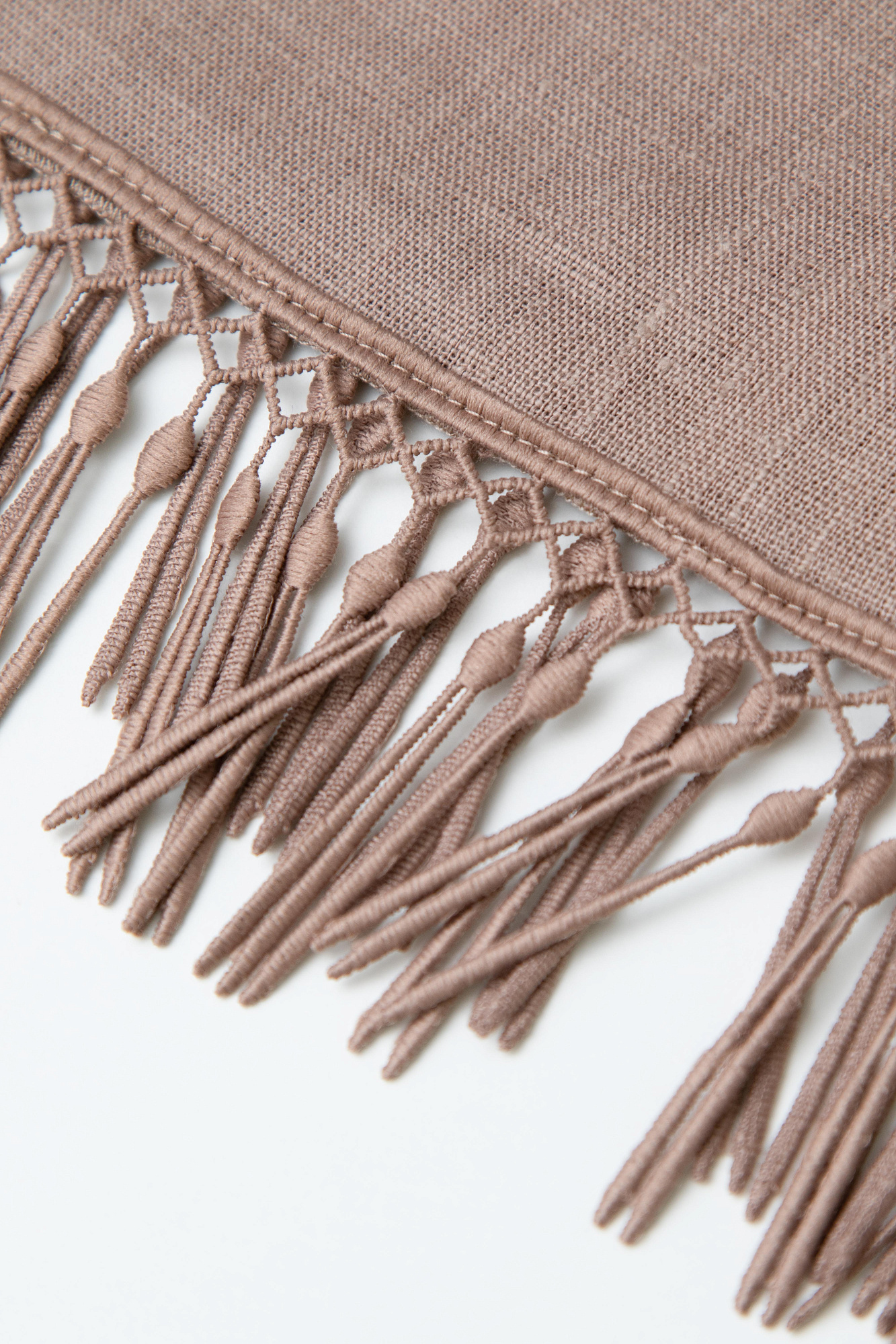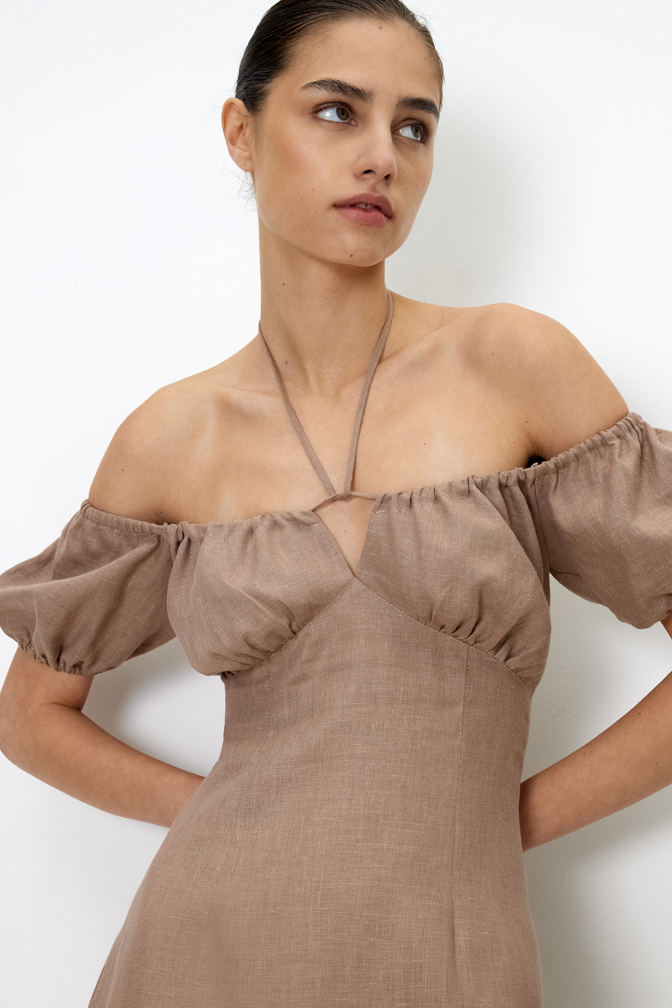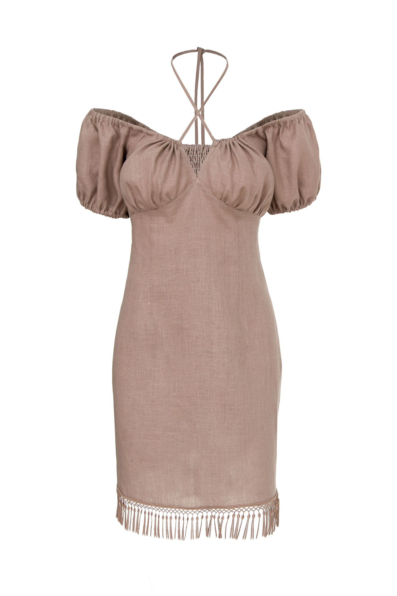 Платье из 100% льна с бахромой и на тонкой кулиске вокруг шеи.