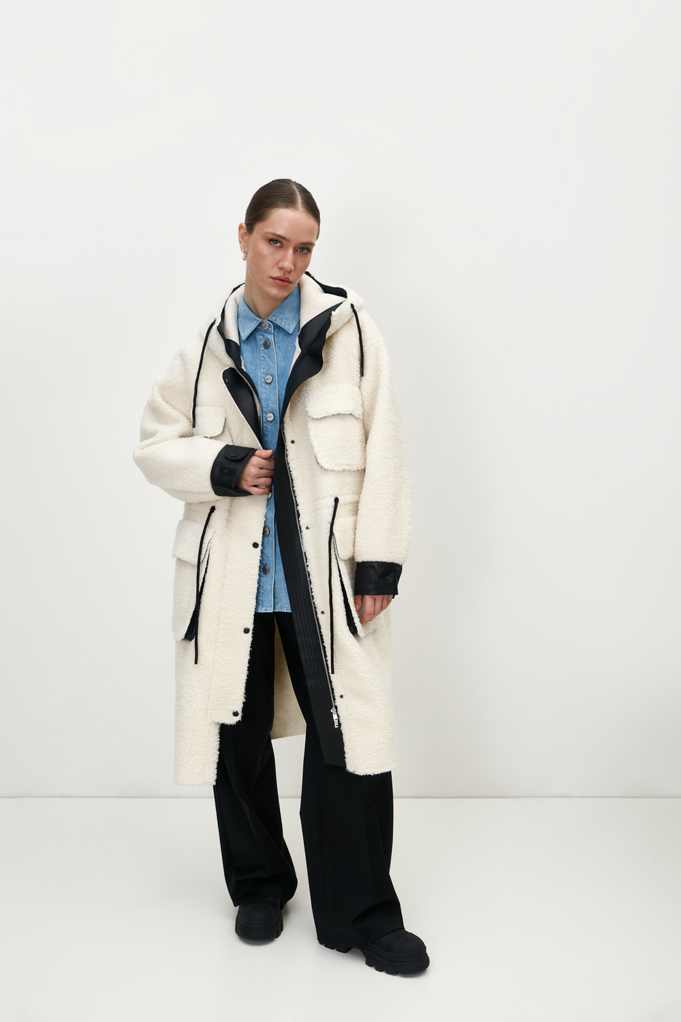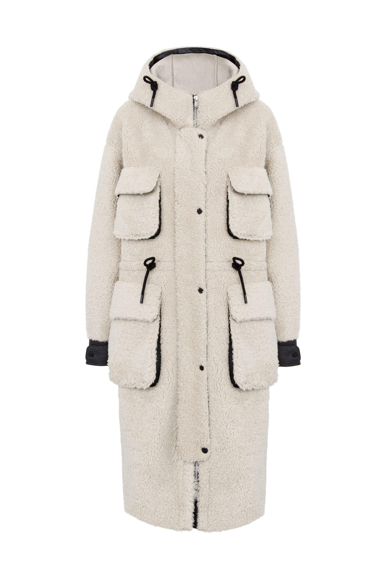 Меховое пальто из натуральной шерсти с большими накладными карманами. Застежка на молнии и кнопках. Вставки выполнены из эко-кожи.