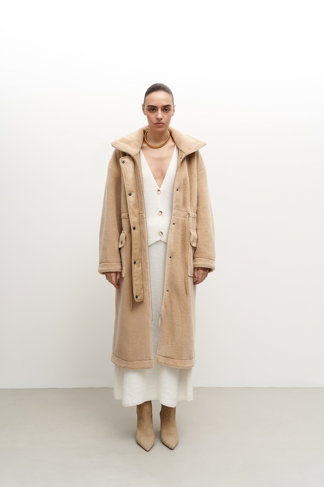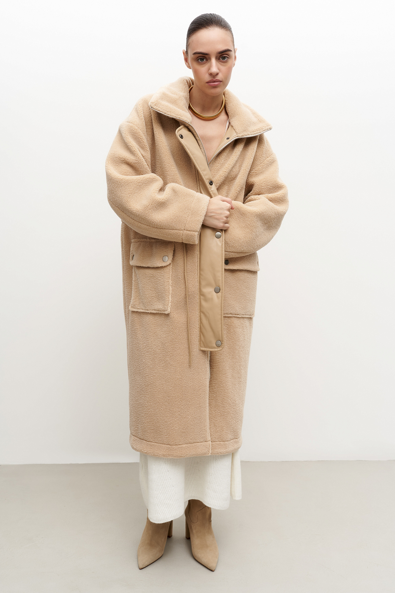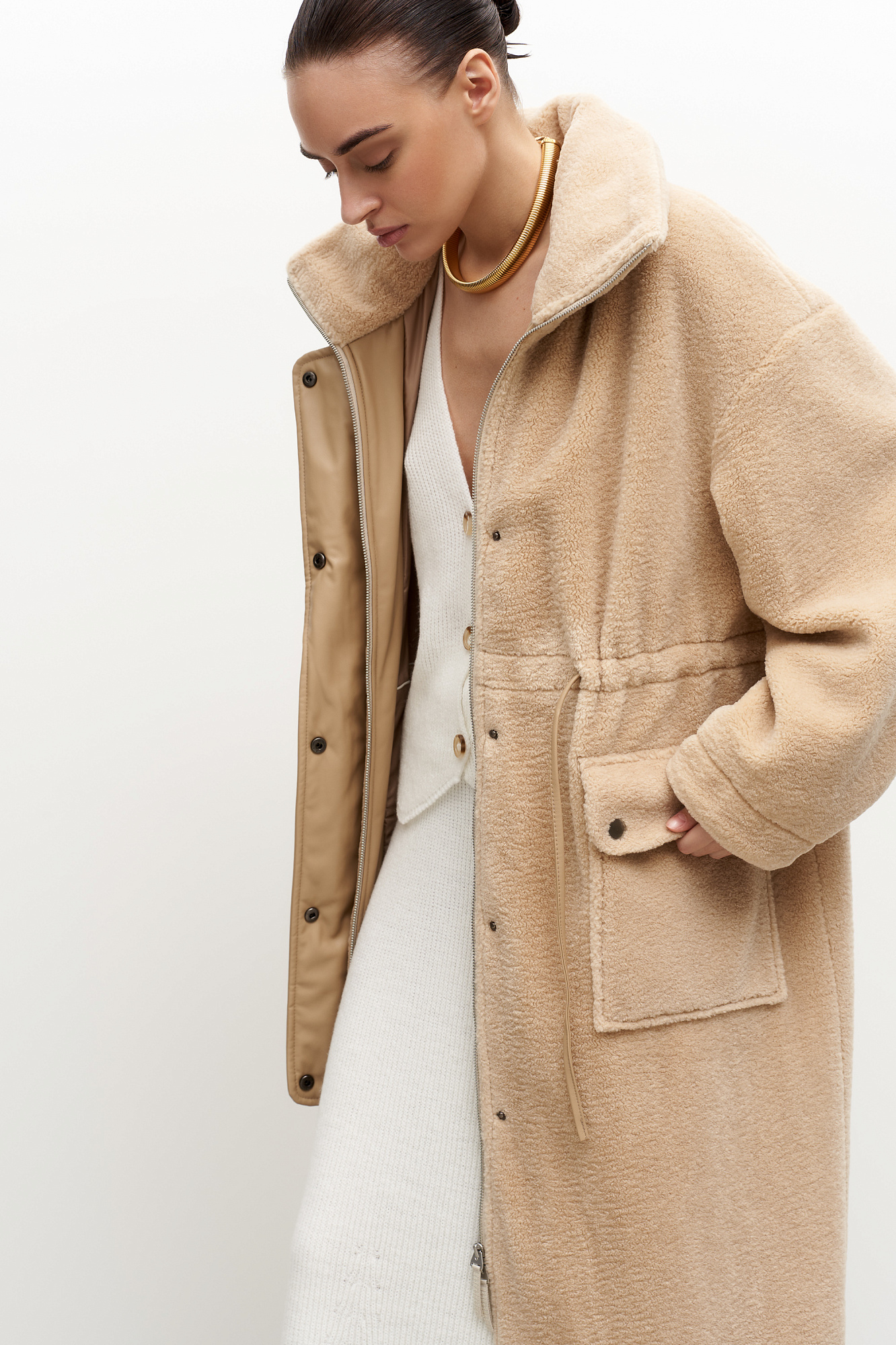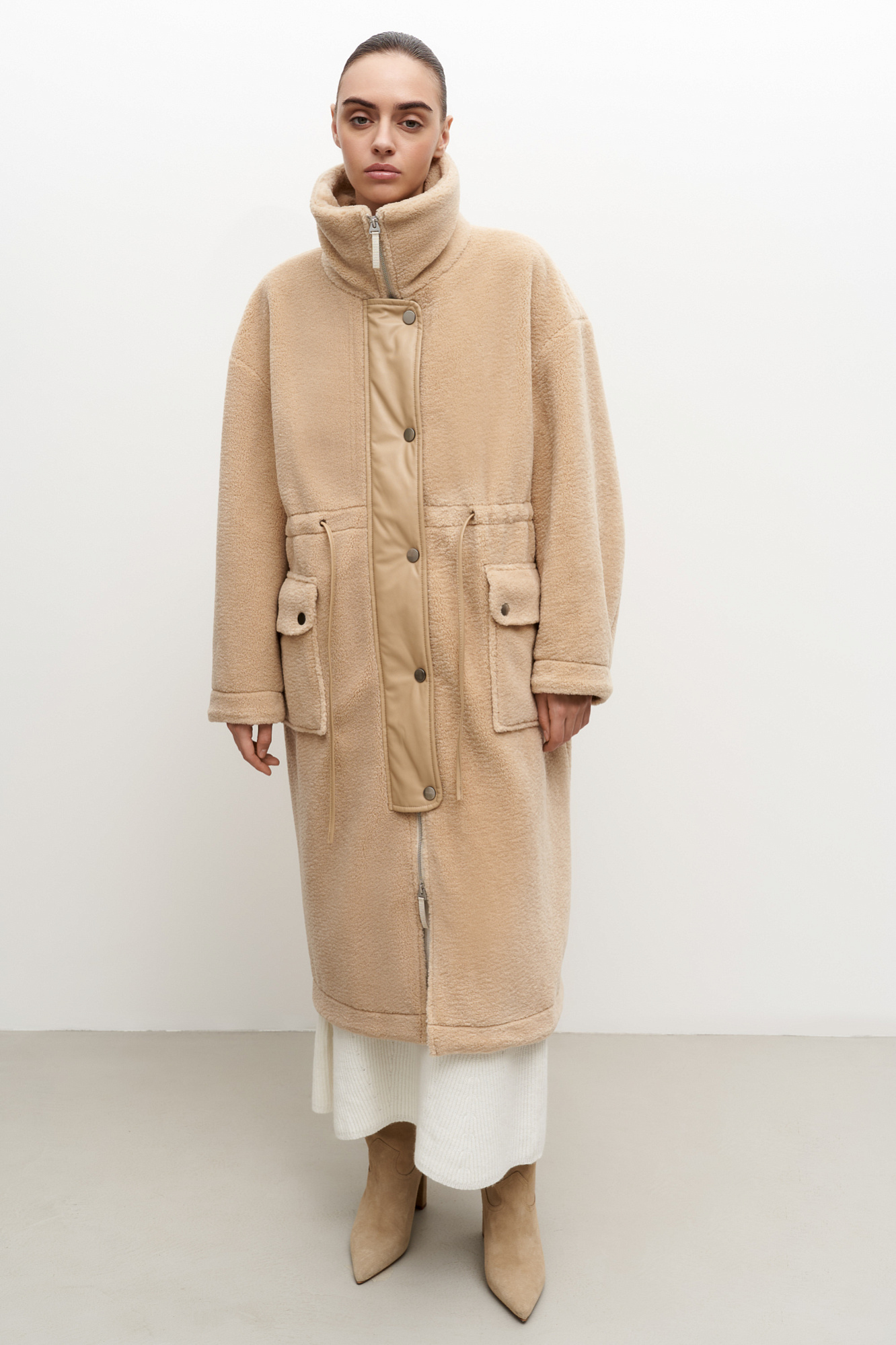 Утепленное пальто из экомеха с декоративными вставками из экокожи. Модель свободного силуэта с накладными карманами и воротником-стойкой. Пояс на кулиске. Застежка на молнию и кнопки.
