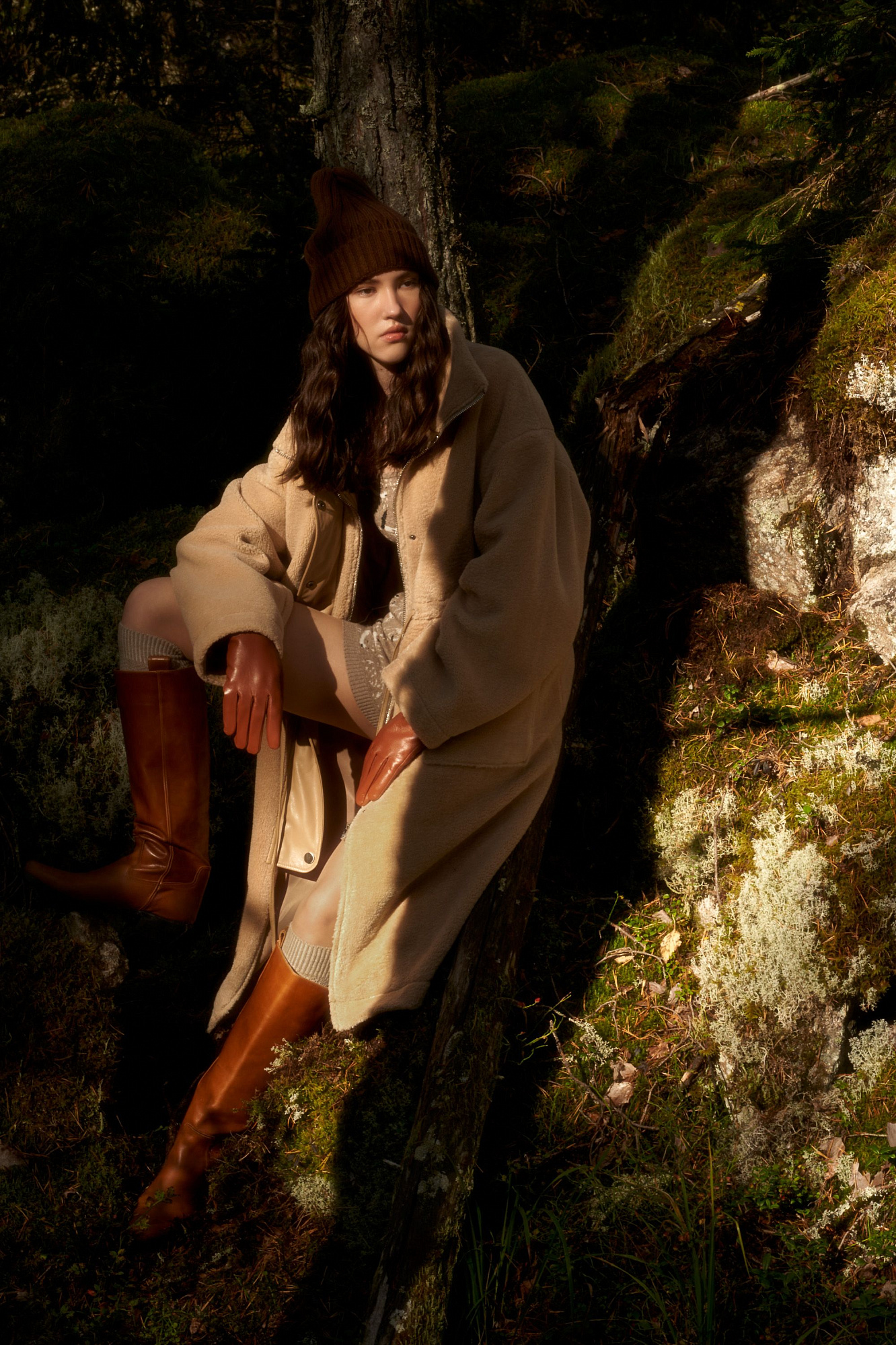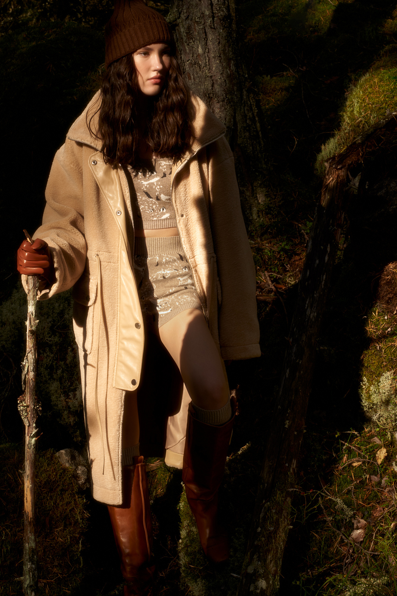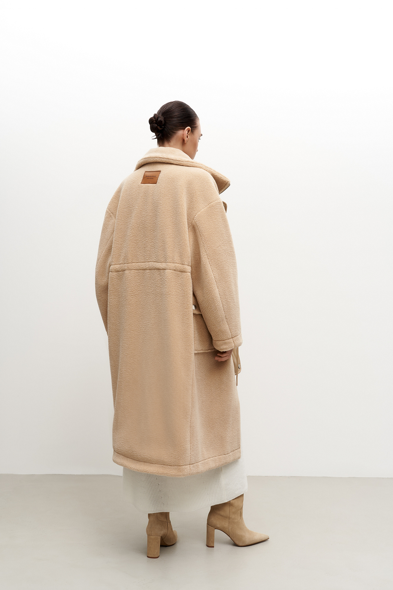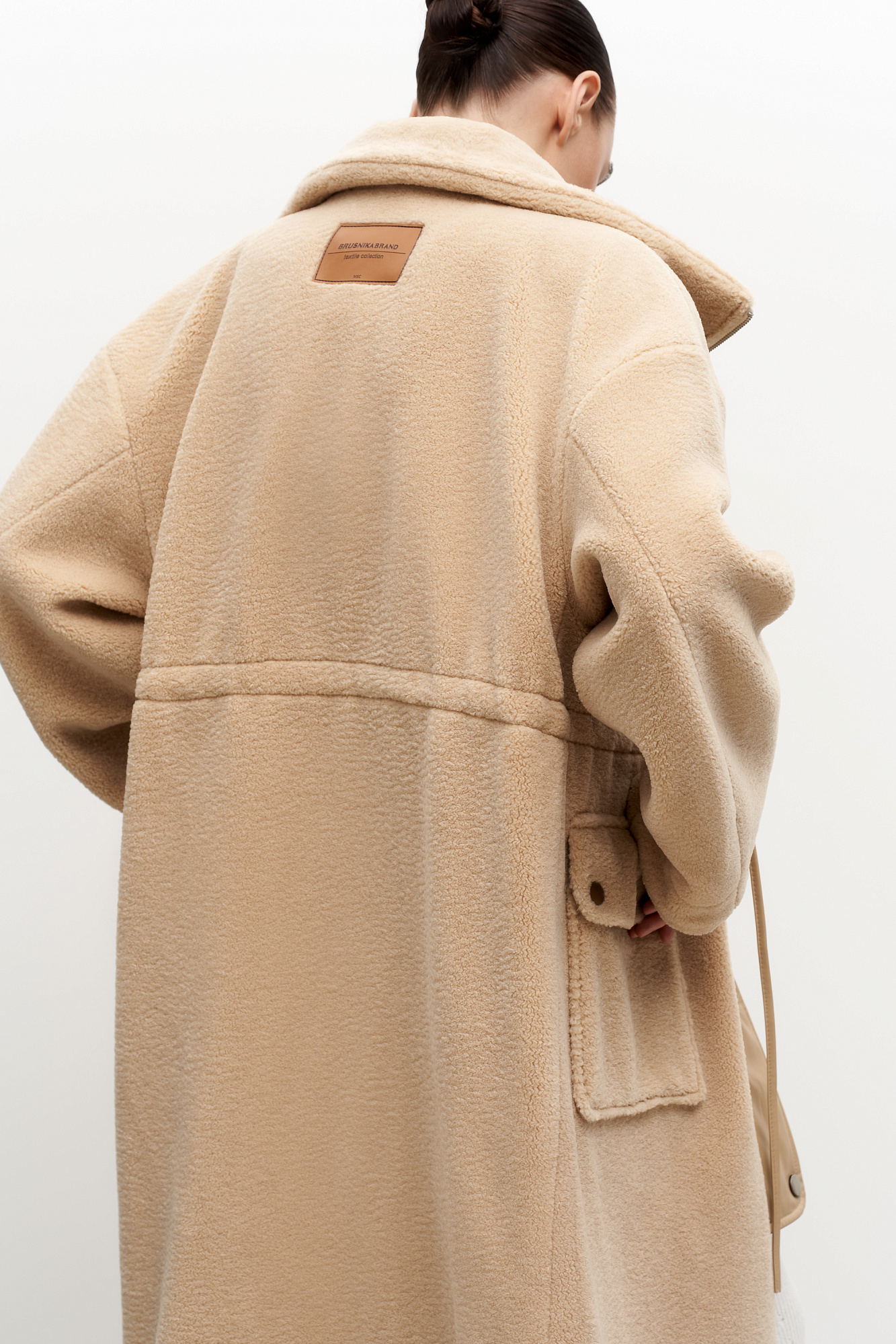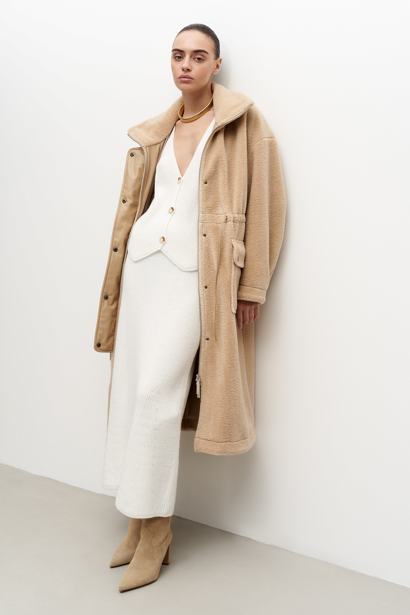Утепленное пальто из экомеха с декоративными вставками из экокожи. Модель свободного силуэта с накладными карманами и воротником-стойкой. Пояс на кулиске. Застежка на молнию и кнопки.