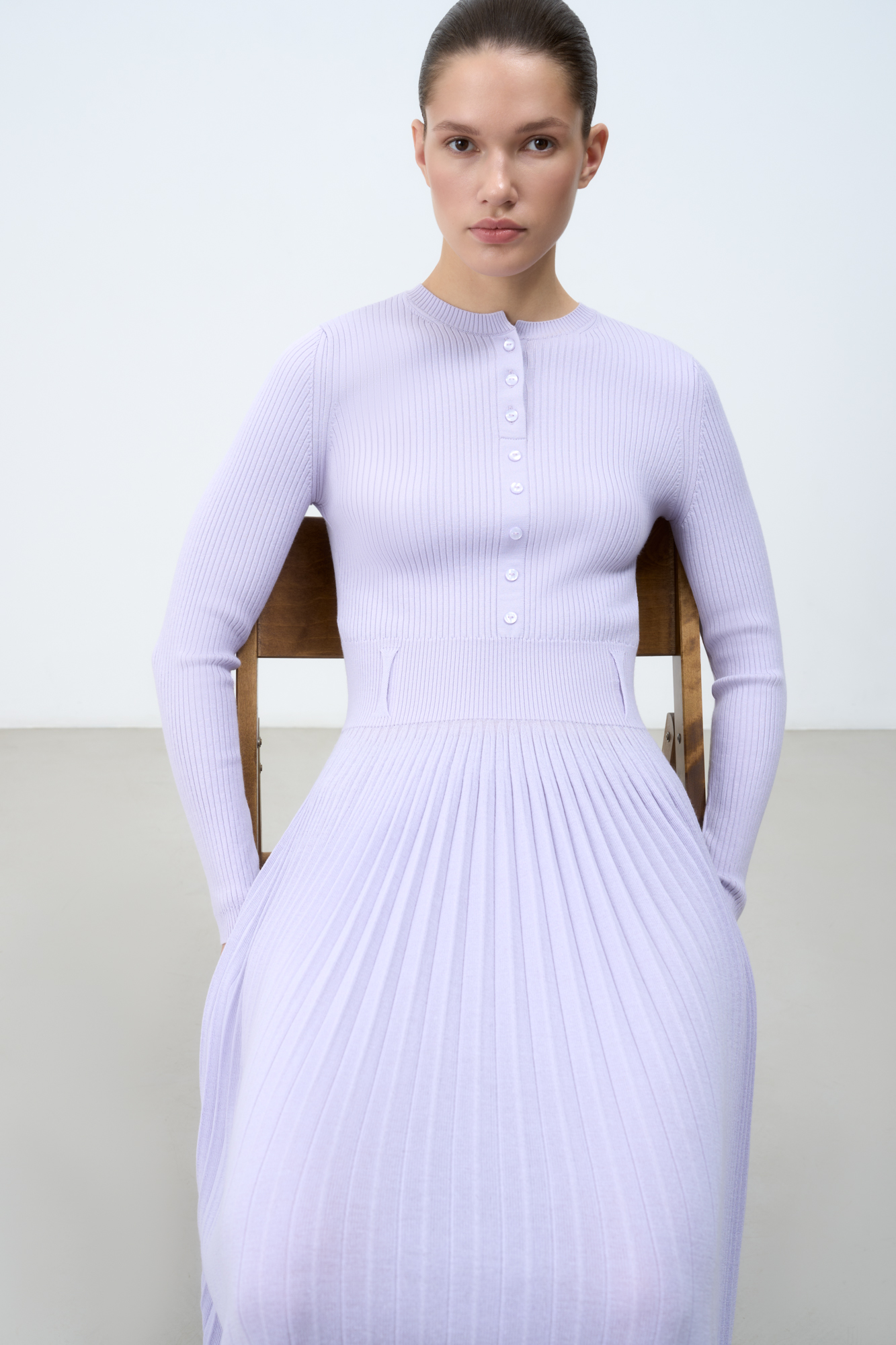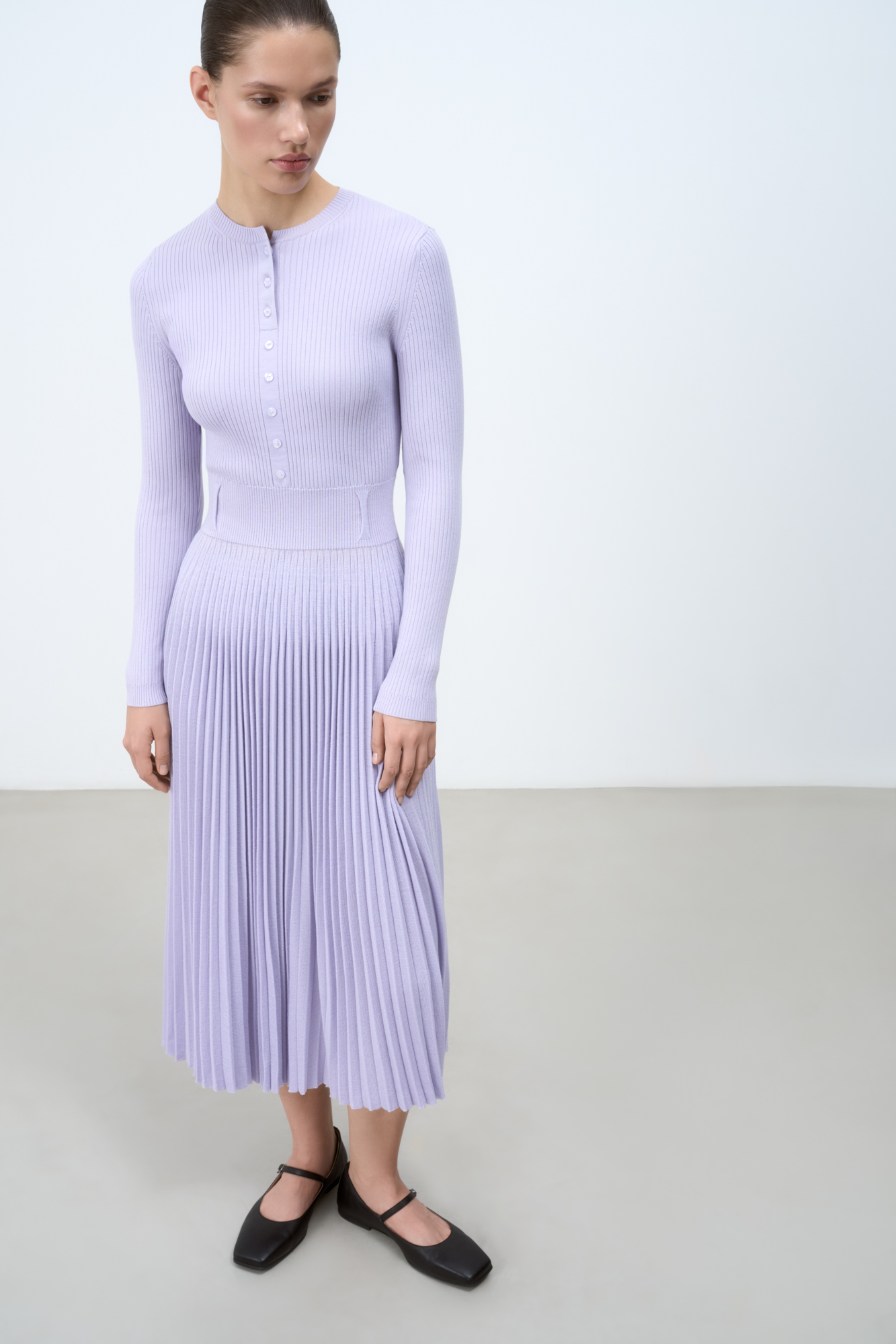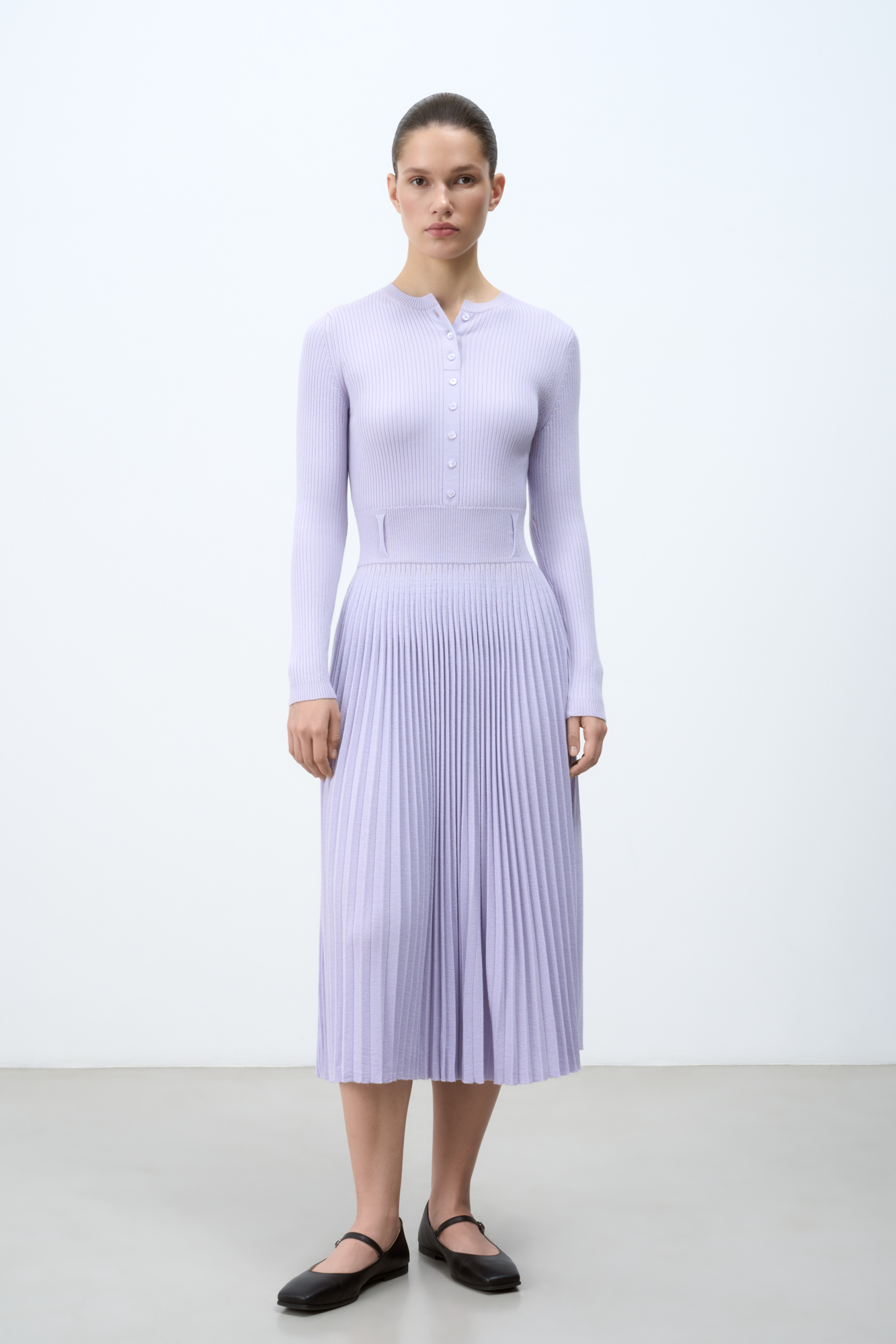 Платье из шерсти и вискозы миди длины с юбкой-плиссе и планкой с пуговицами на груди. Имеется подъюбник.