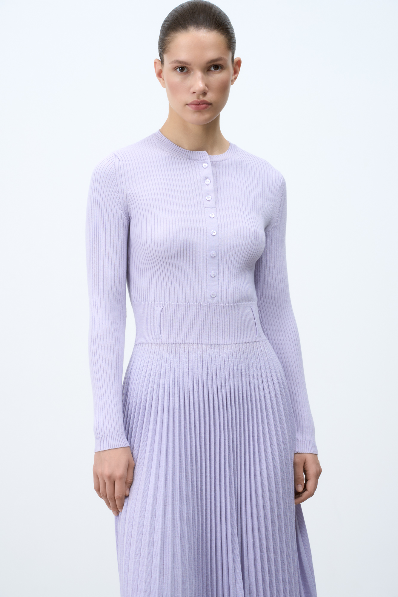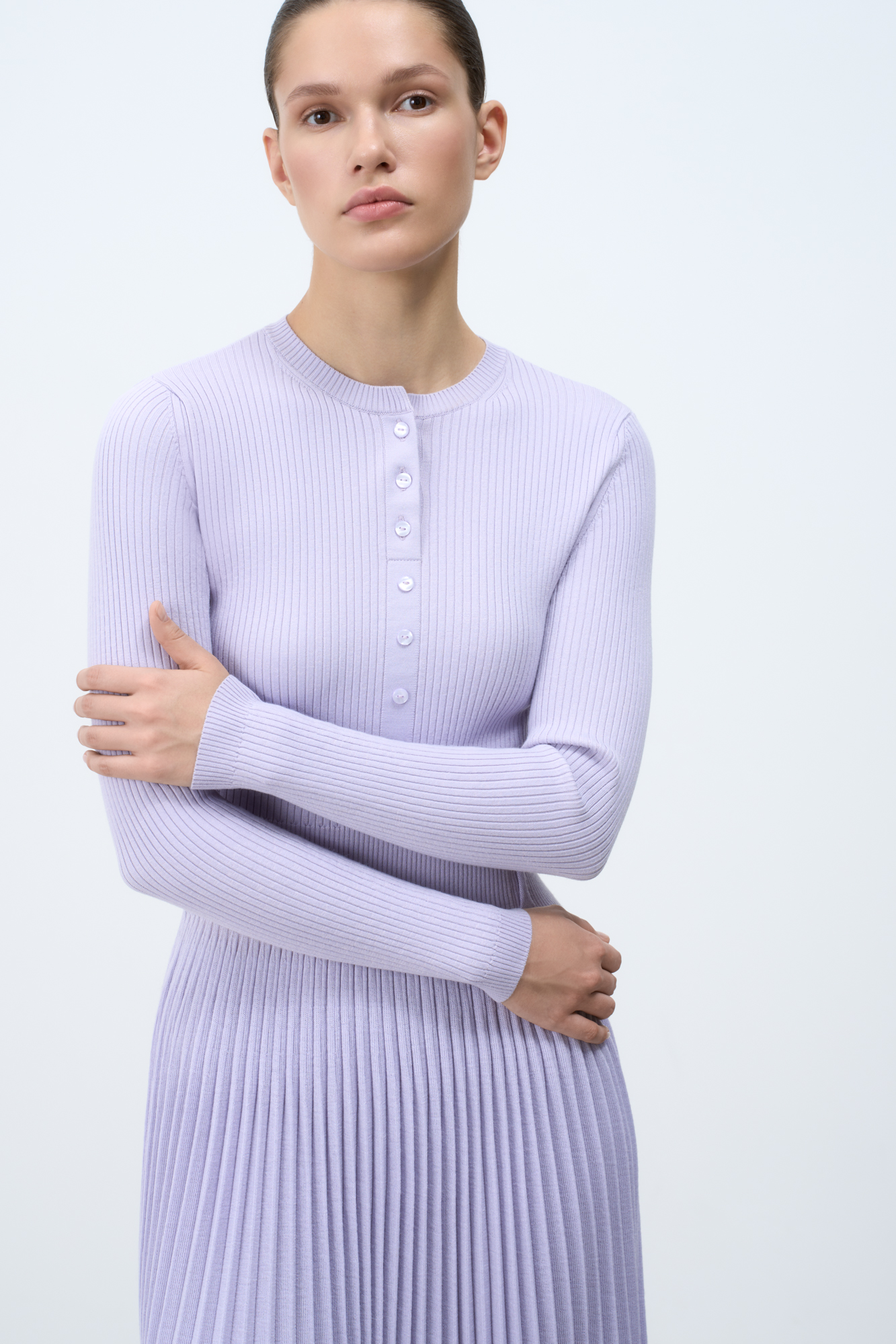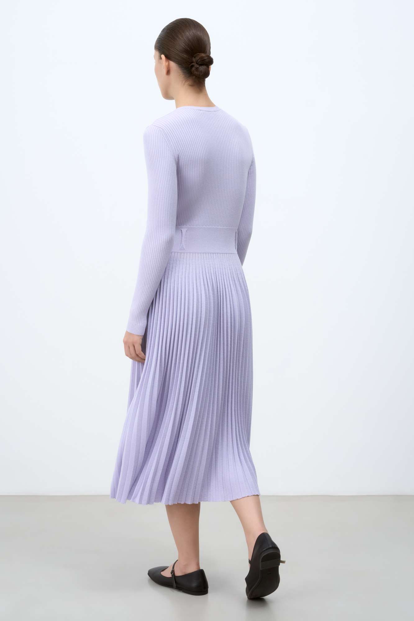 Платье из шерсти и вискозы миди длины с юбкой-плиссе и планкой с пуговицами на груди. Имеется подъюбник.