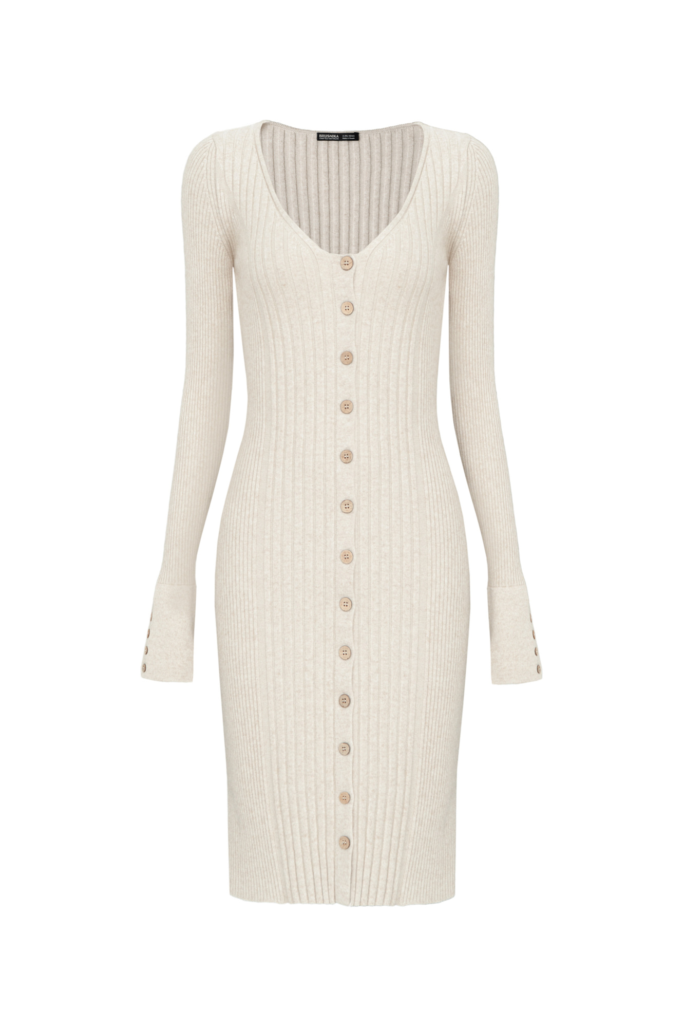 Трикотажное платье из шерсти с добавлением кашемира. Модель приталенного силуэта с V-образным вырезом и застежкой на пуговицы.