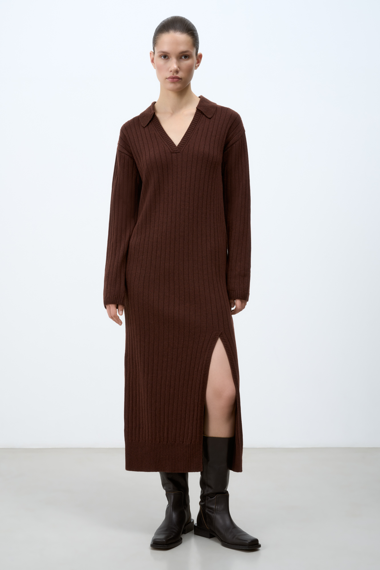 Трикотажное платье из смесовой шерсти с V-образным вырезом. Модель свободного силуэта длины миди. Длинный рукав и разрез на ноге.
