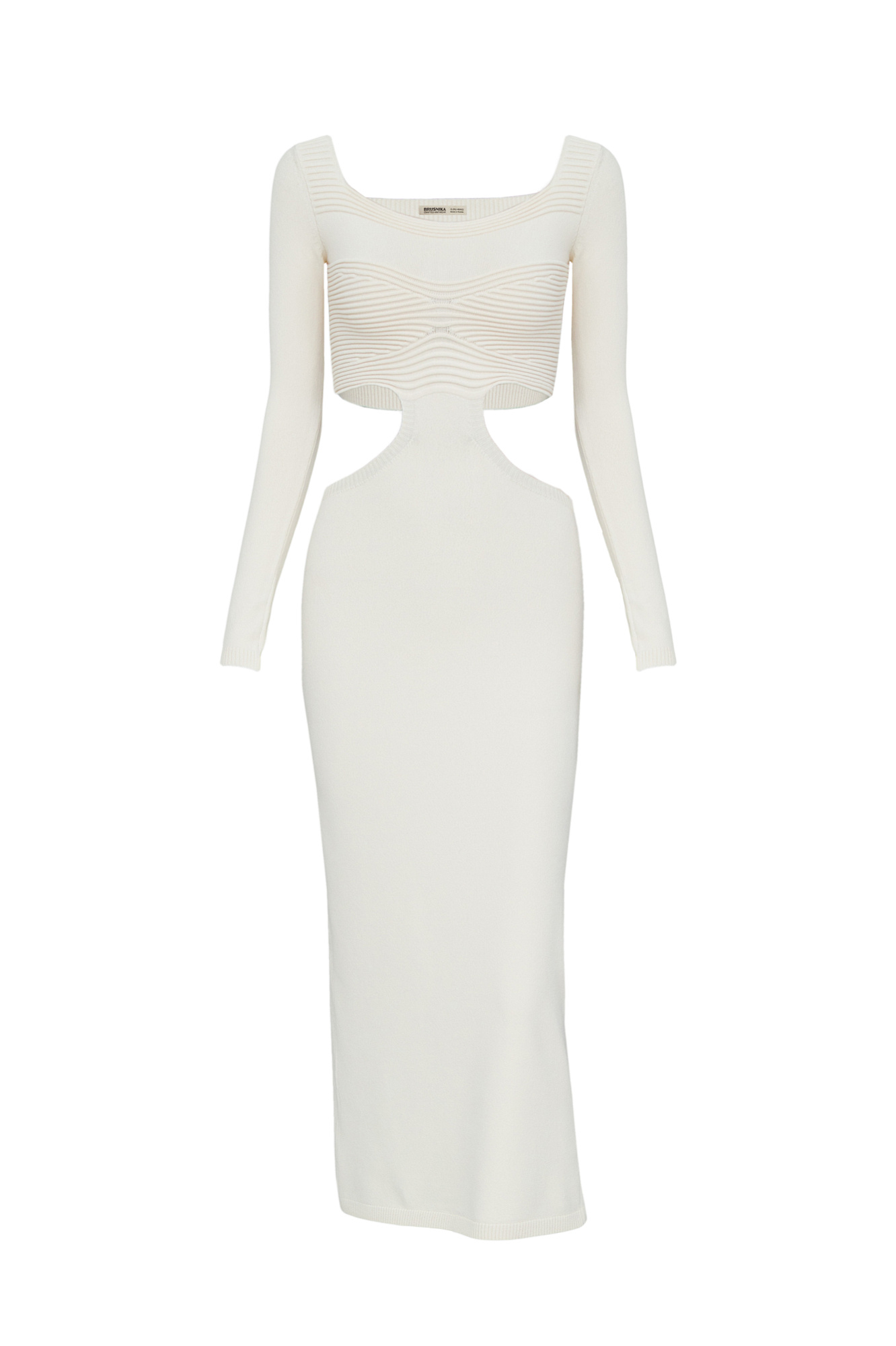 Трикотажное платье из вискозы. Модель приталенного силуэта длины миди. Верх изделия с разрезами по бокам и открытой спинкой.