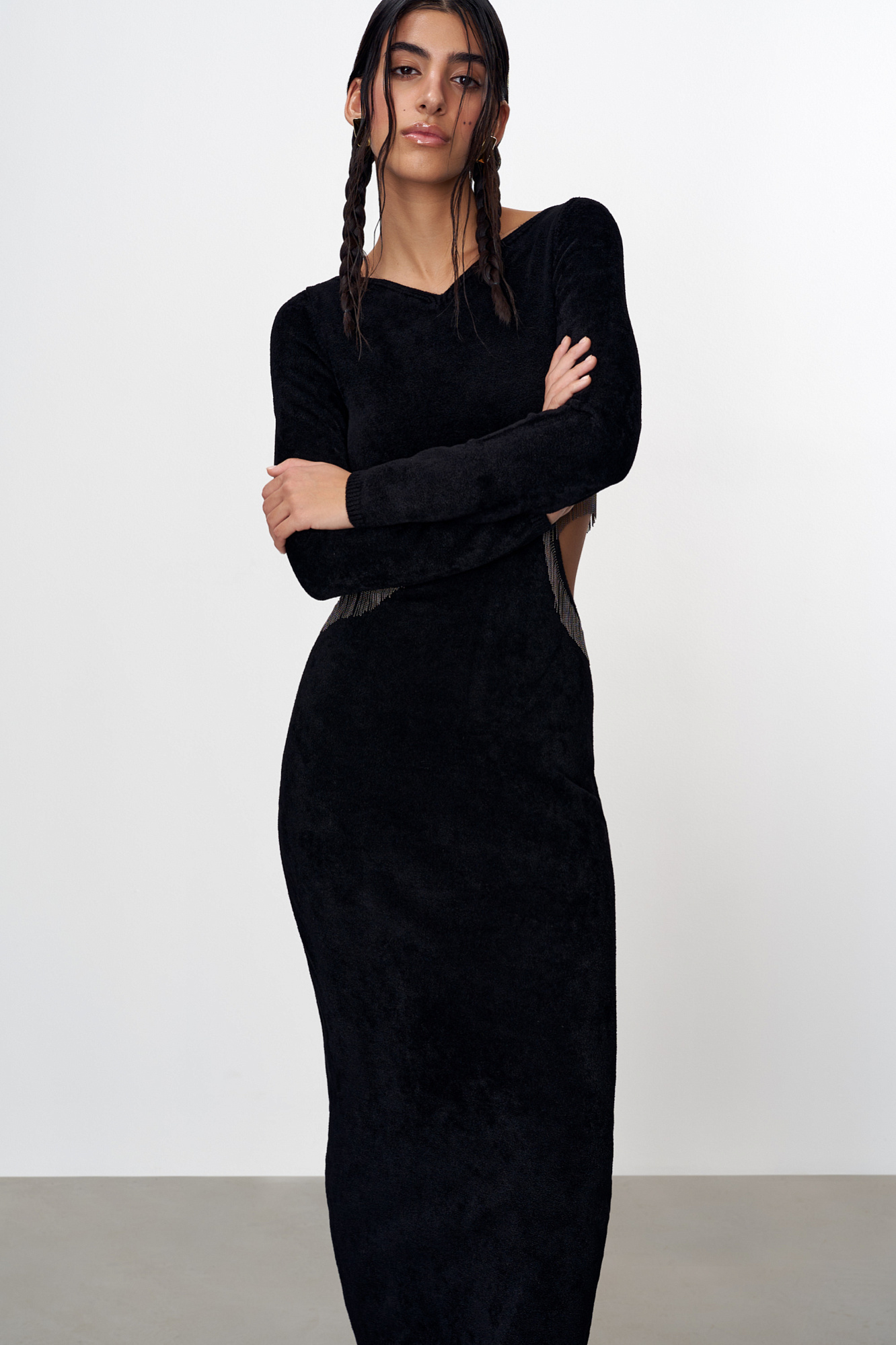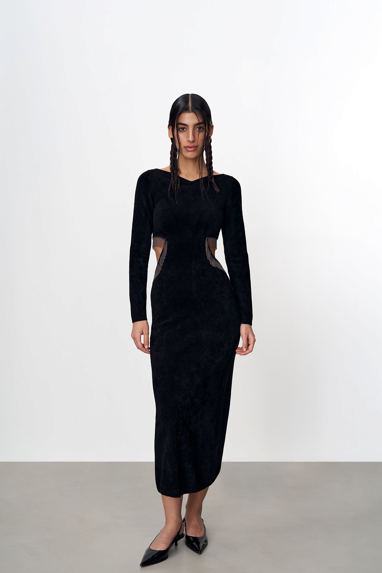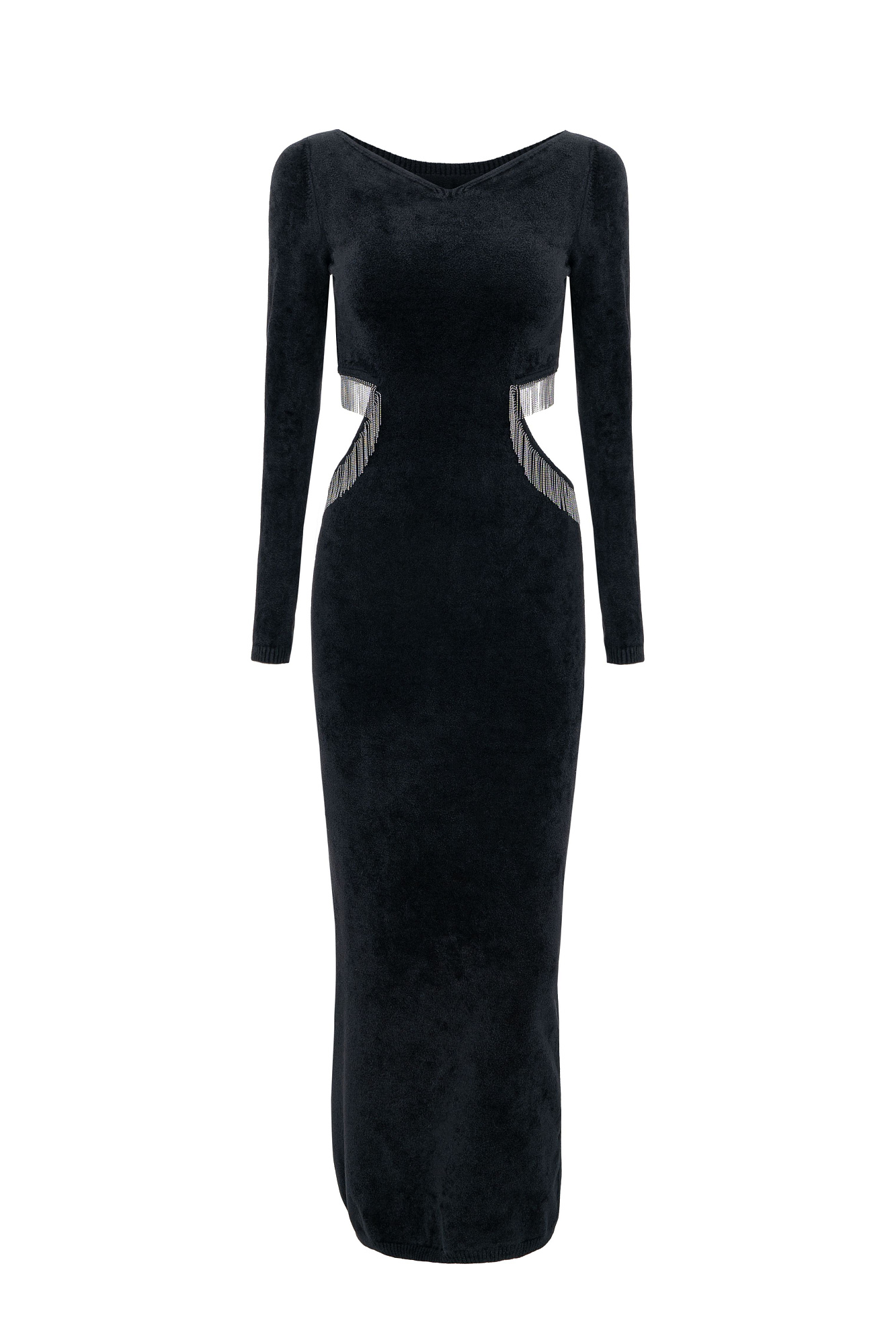 Трикотажное платье из мягкой бархатистой вискозы. Модель с приталенным силуэтом и акцентными разрезами на боках, декорированными металлической бахромой.