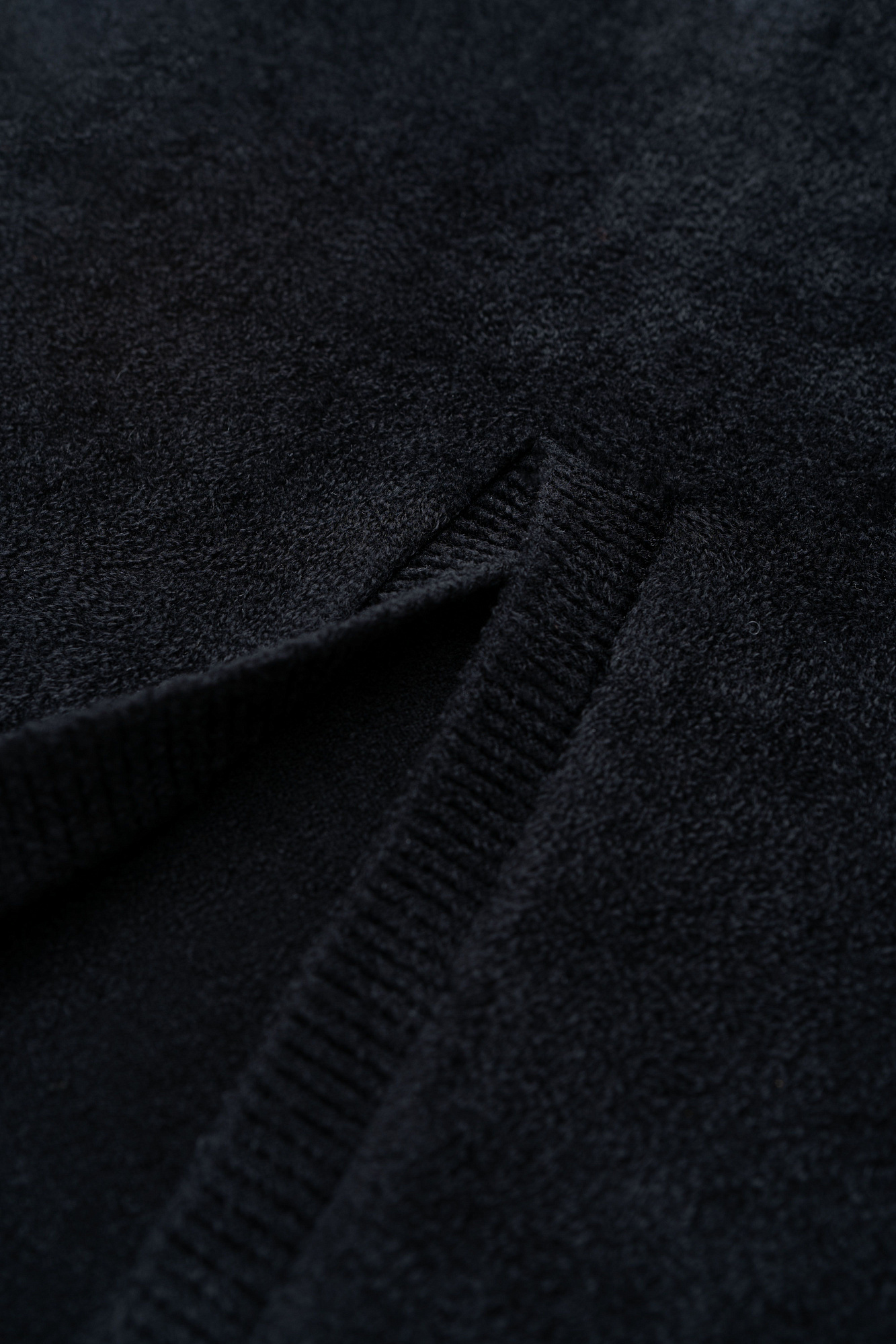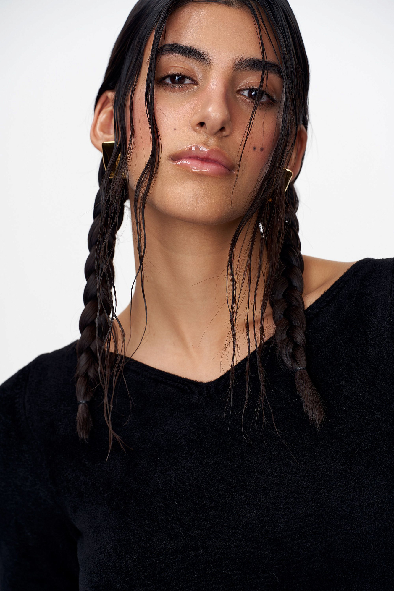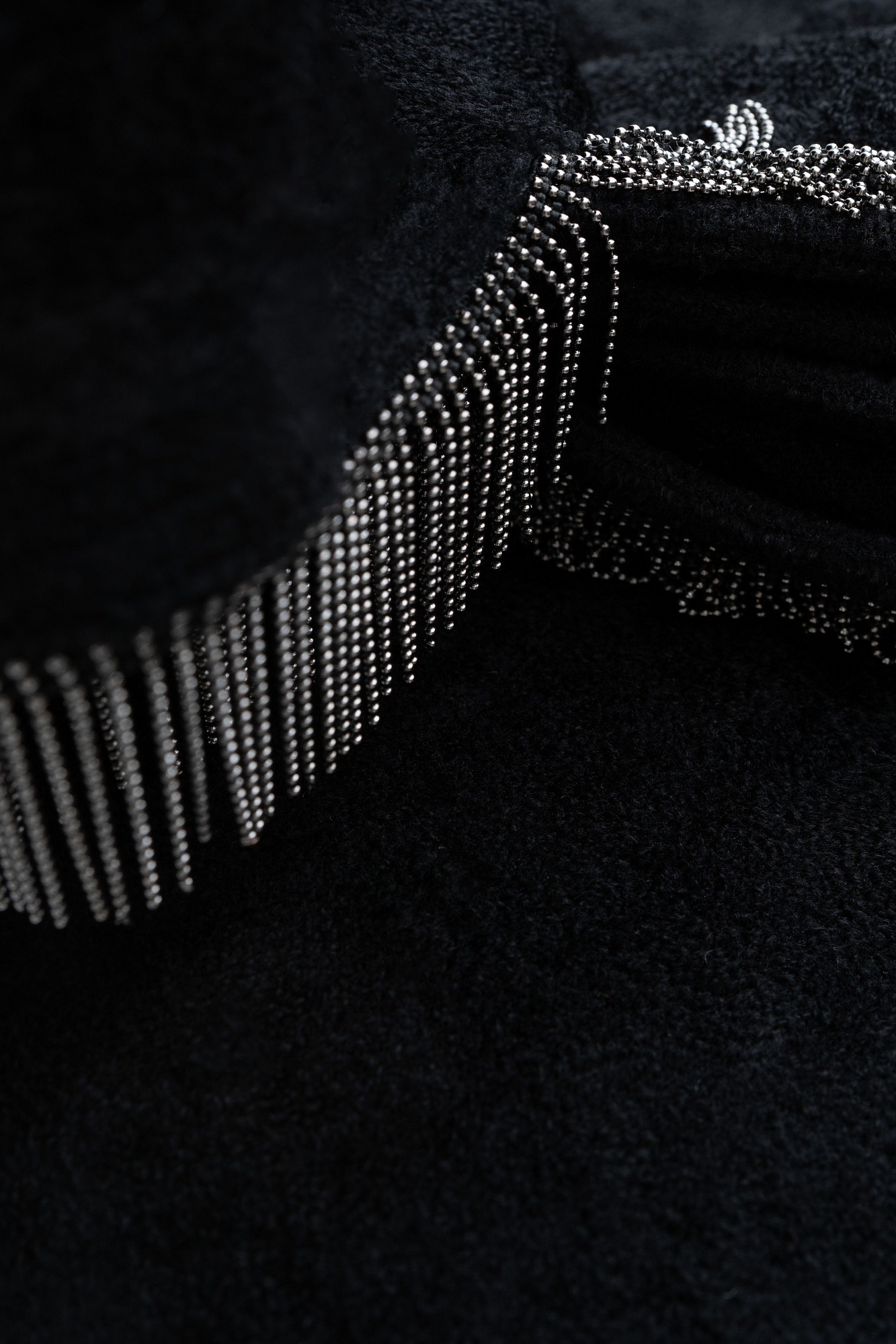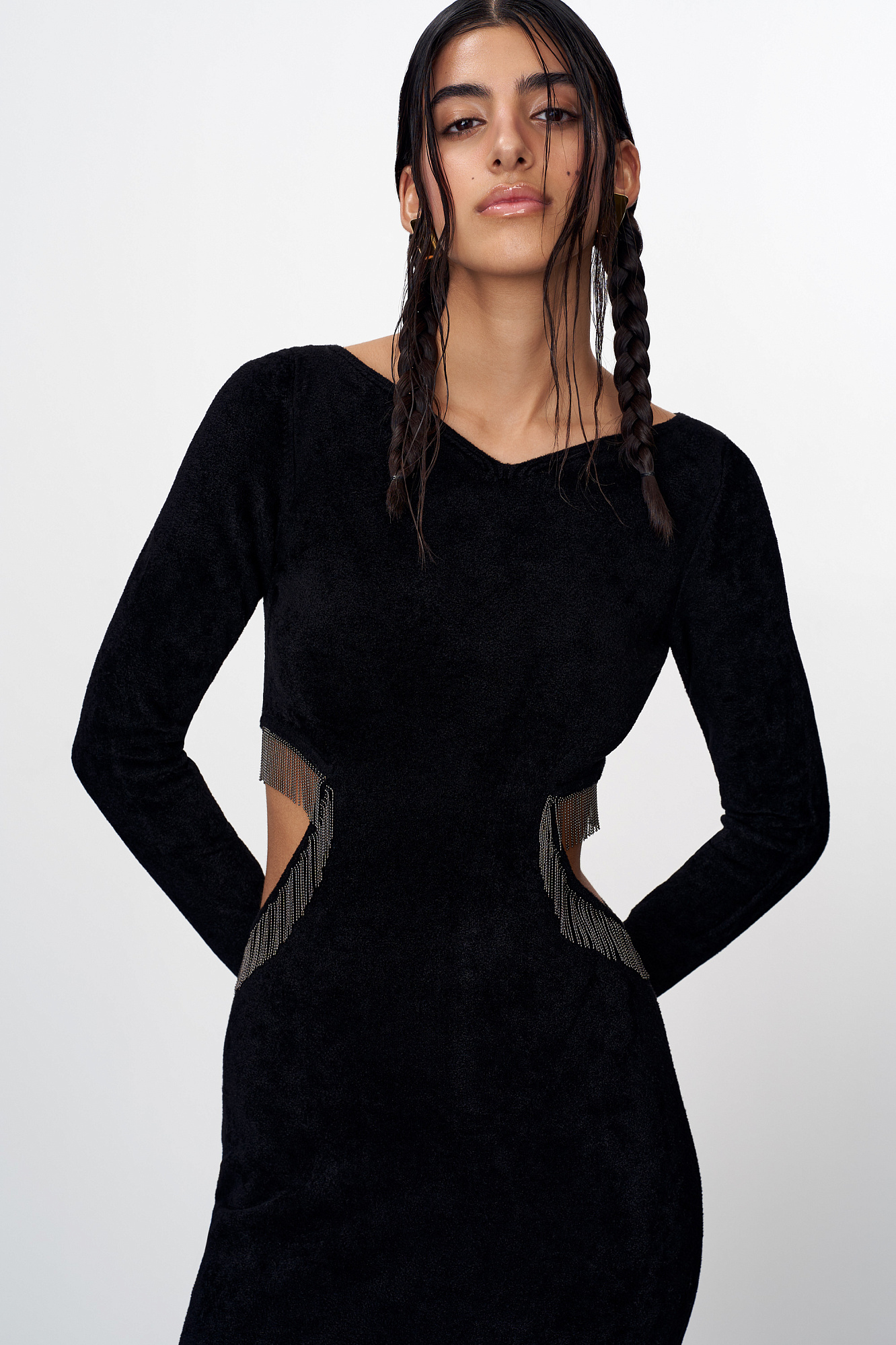 Трикотажное платье из мягкой бархатистой вискозы. Модель с приталенным силуэтом и акцентными разрезами на боках, декорированными металлической бахромой.