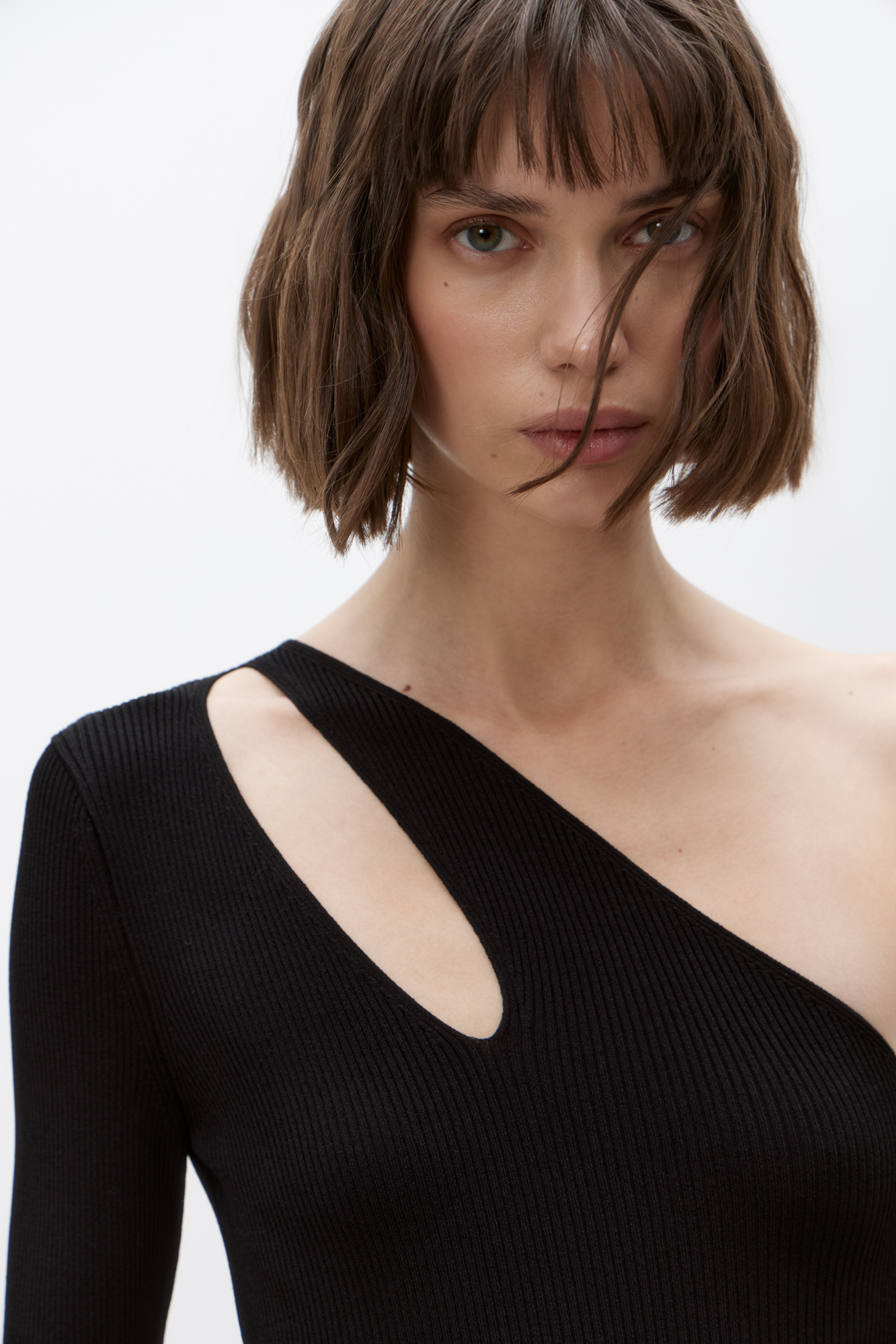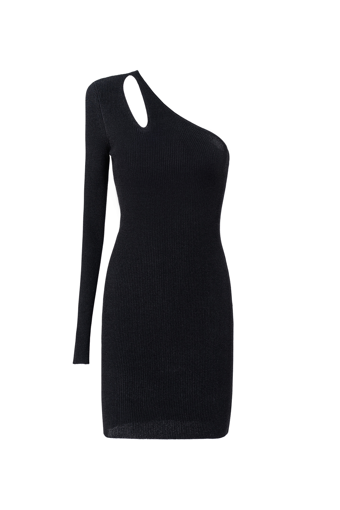 Трикотажное платье длины мини из вискозы с открытым плечом, двойной лямкой и длинным рукавом.