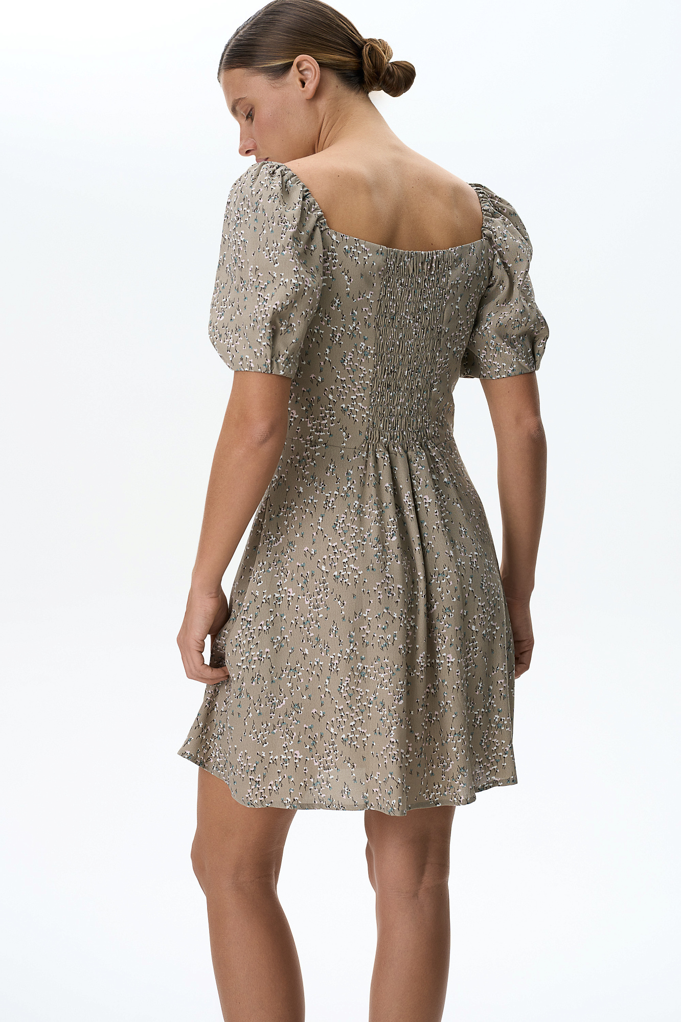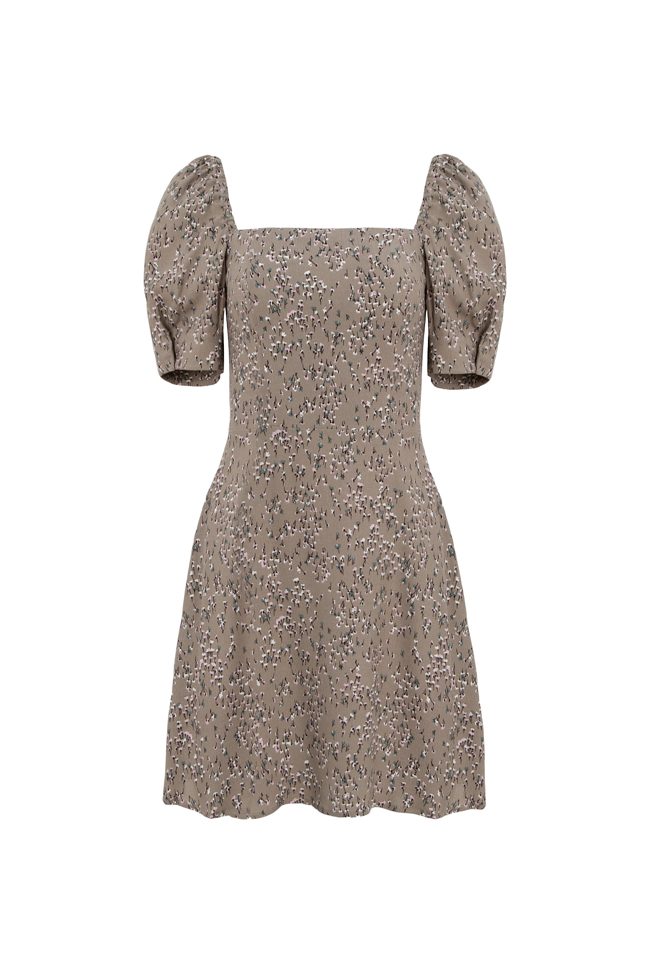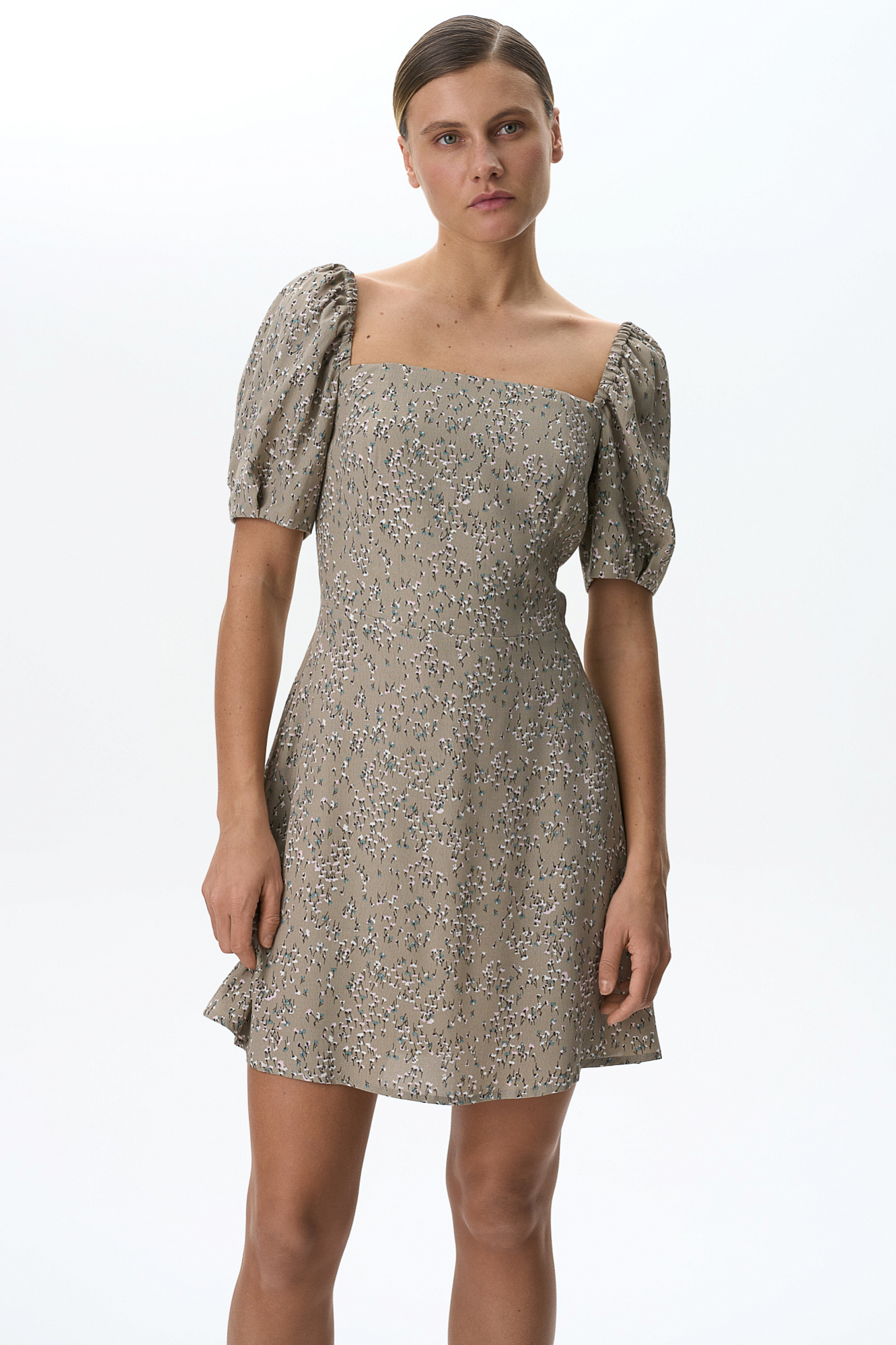 Короткое платье из 100% вискозы в цветочек с пышным рукавом.
