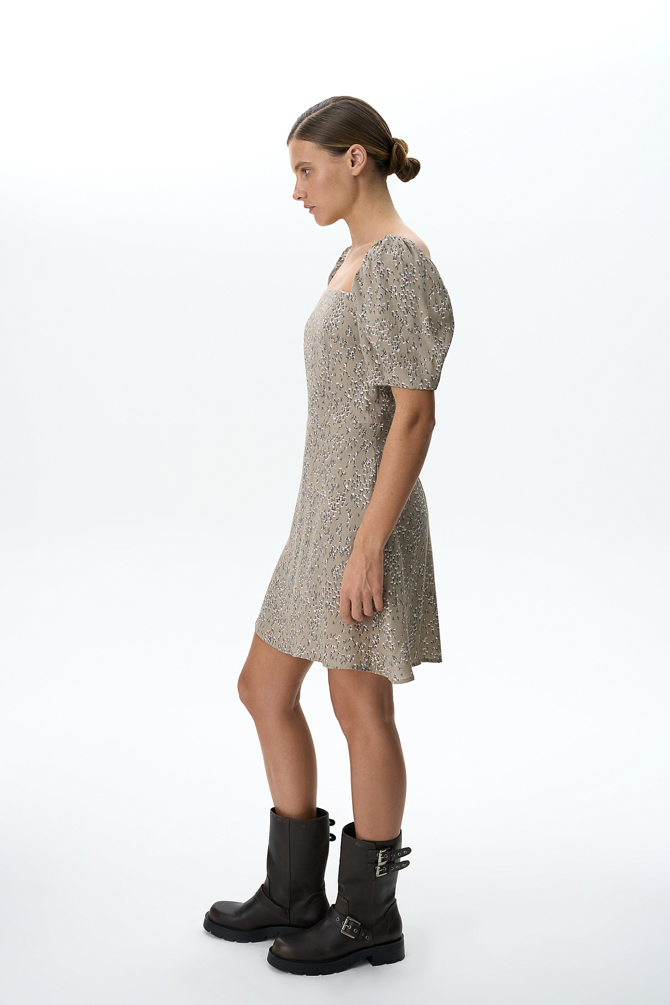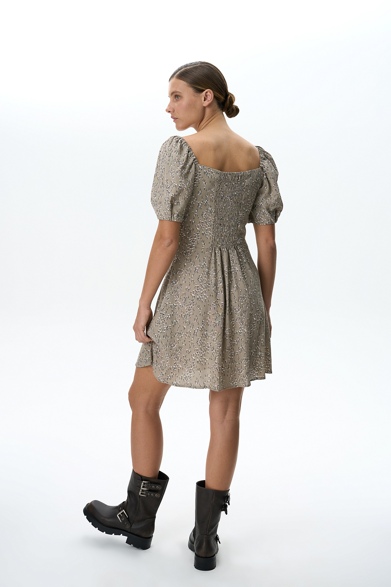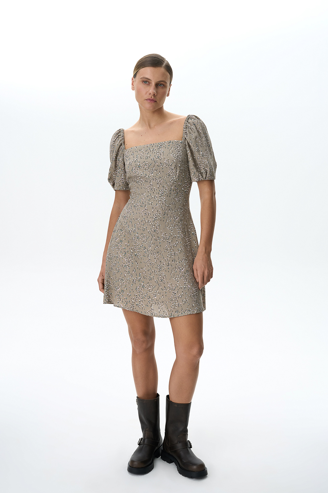 Короткое платье из 100% вискозы в цветочек с пышным рукавом.