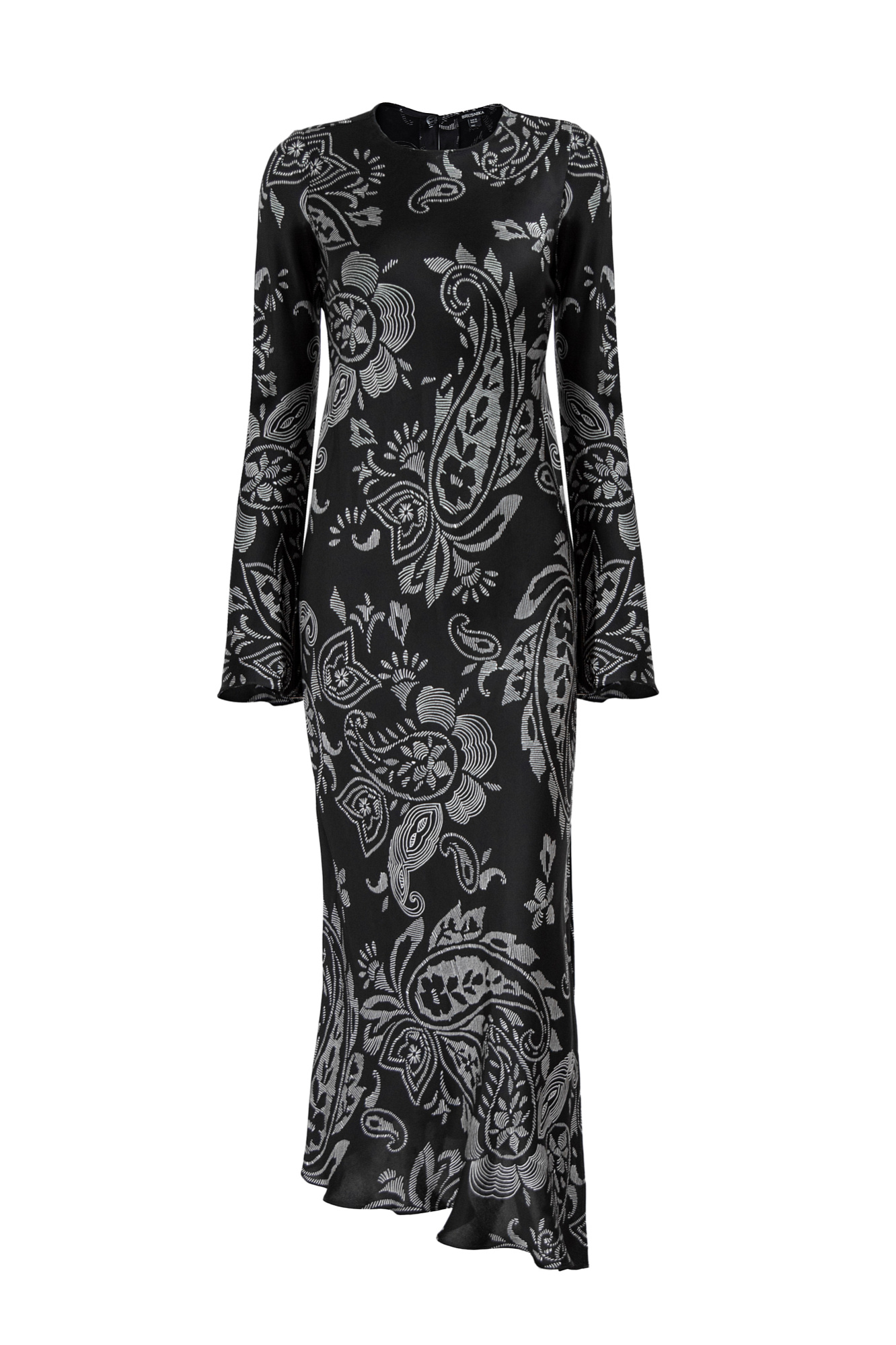 Атласное платье из 100% вискозы с принтом. Модель приталенного силуэта длины миди.