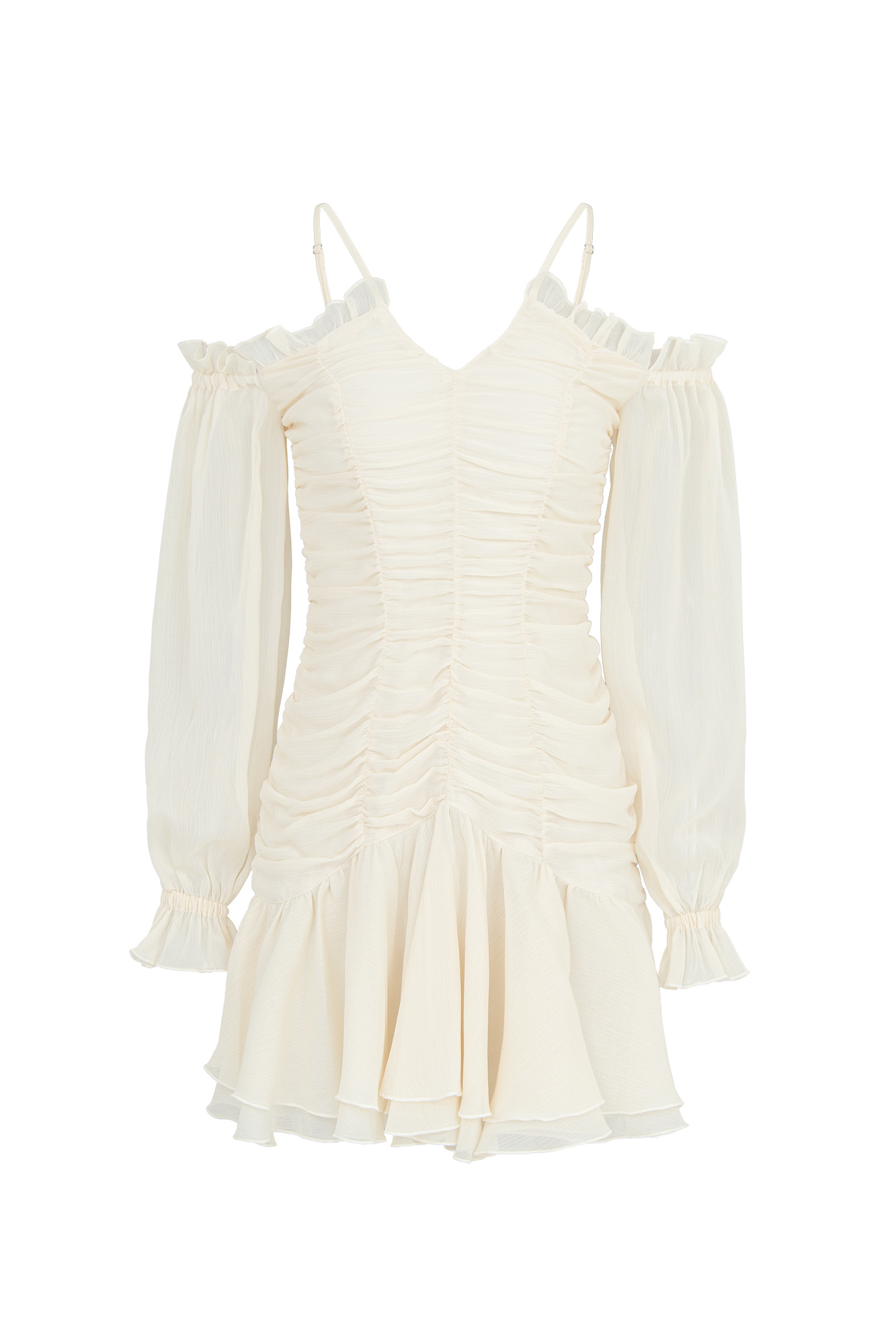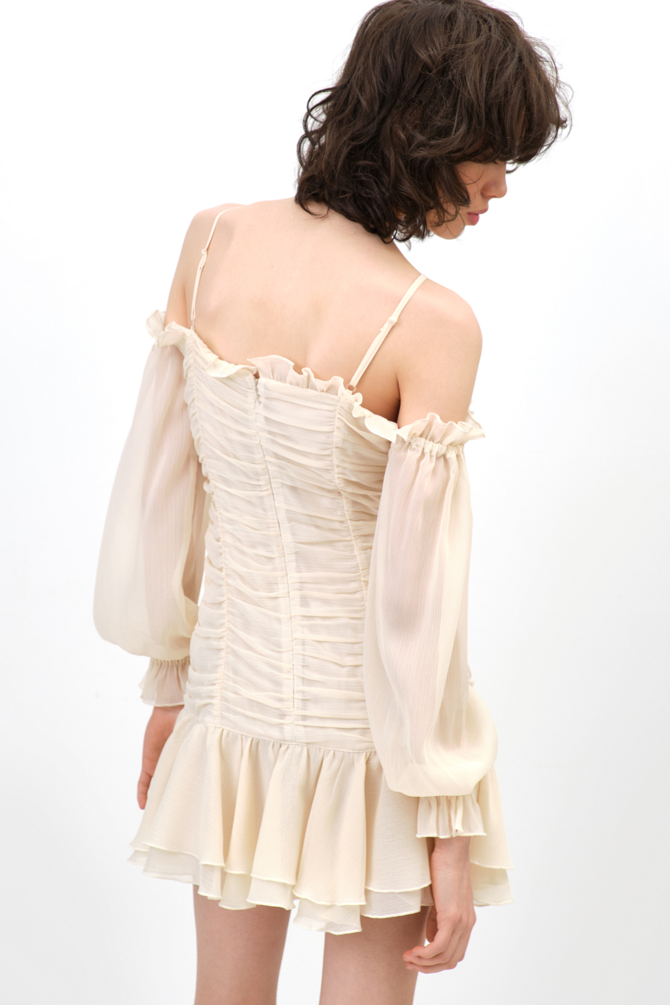 Шифоновое короткое платье на тонких брителях с рукавами-фонариками.