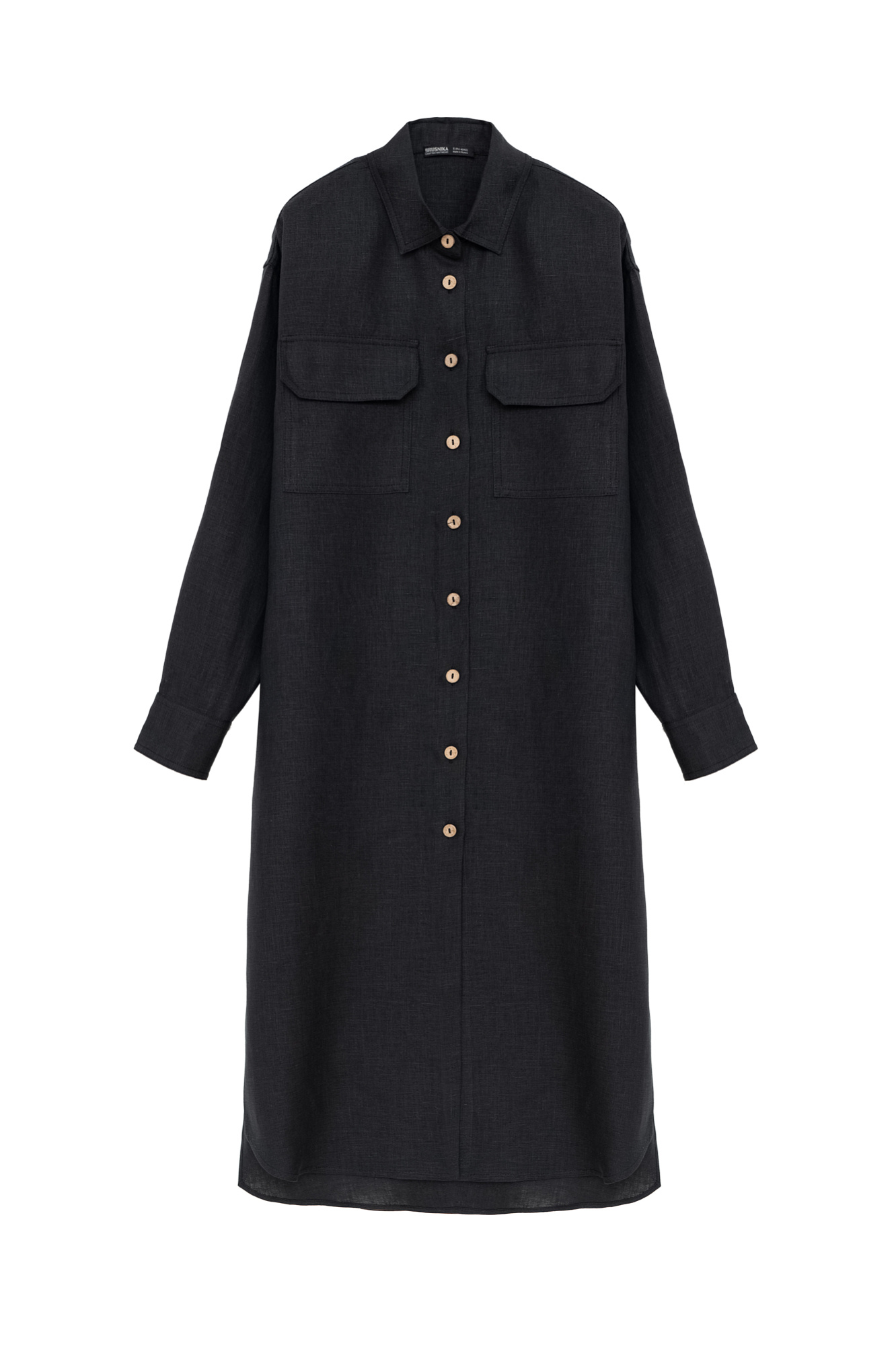 Платье-рубашка длины миди из 100% льна. Модель прямого кроя с длинным рукавом, отложным воротником и накладными карманами на груди. Застежка на пуговицы.
