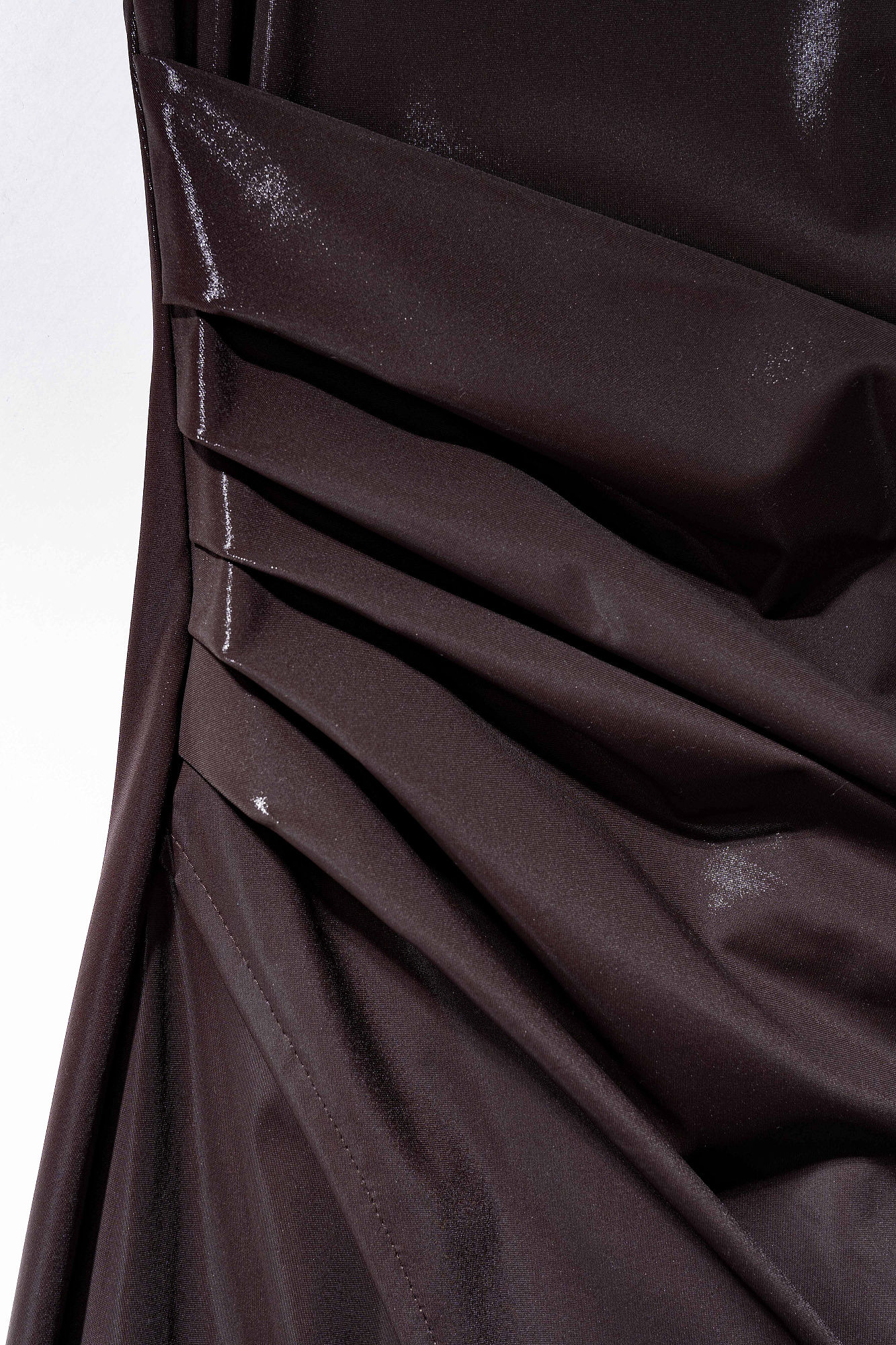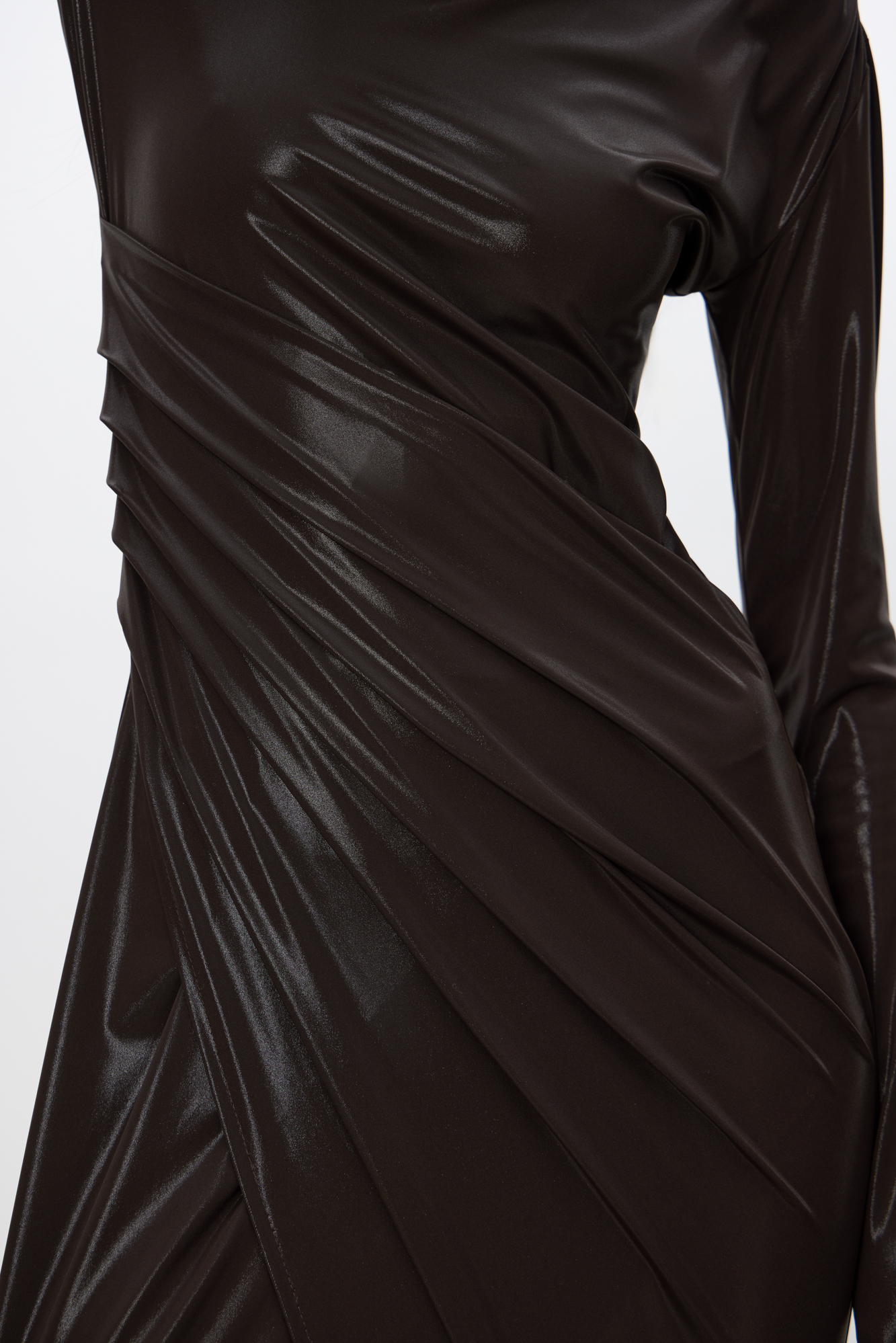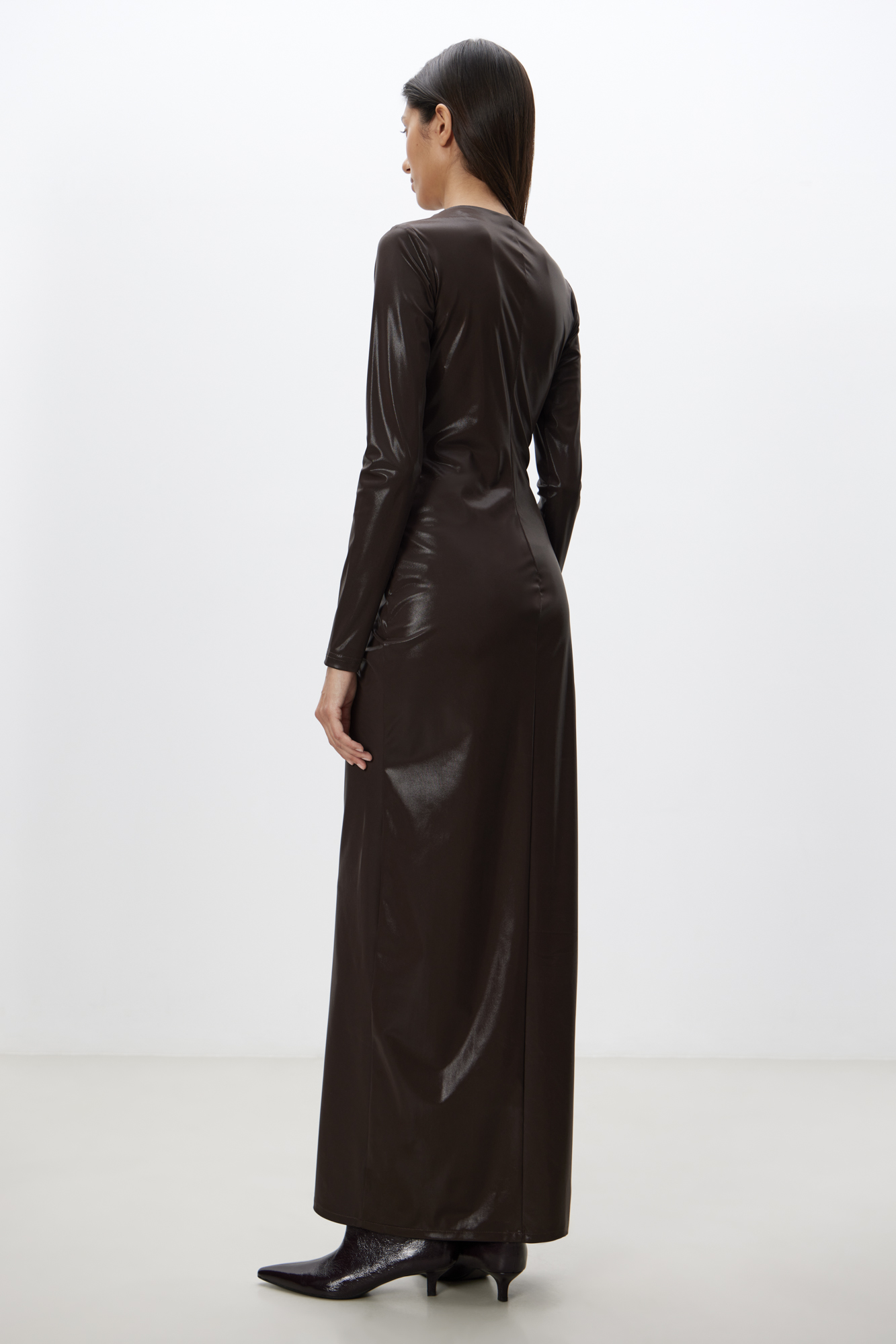 Платье длины макси с асимметричным вырезом и драпировкой. Модель приталенного силуэта с длинным рукавом и разрезом спереди.