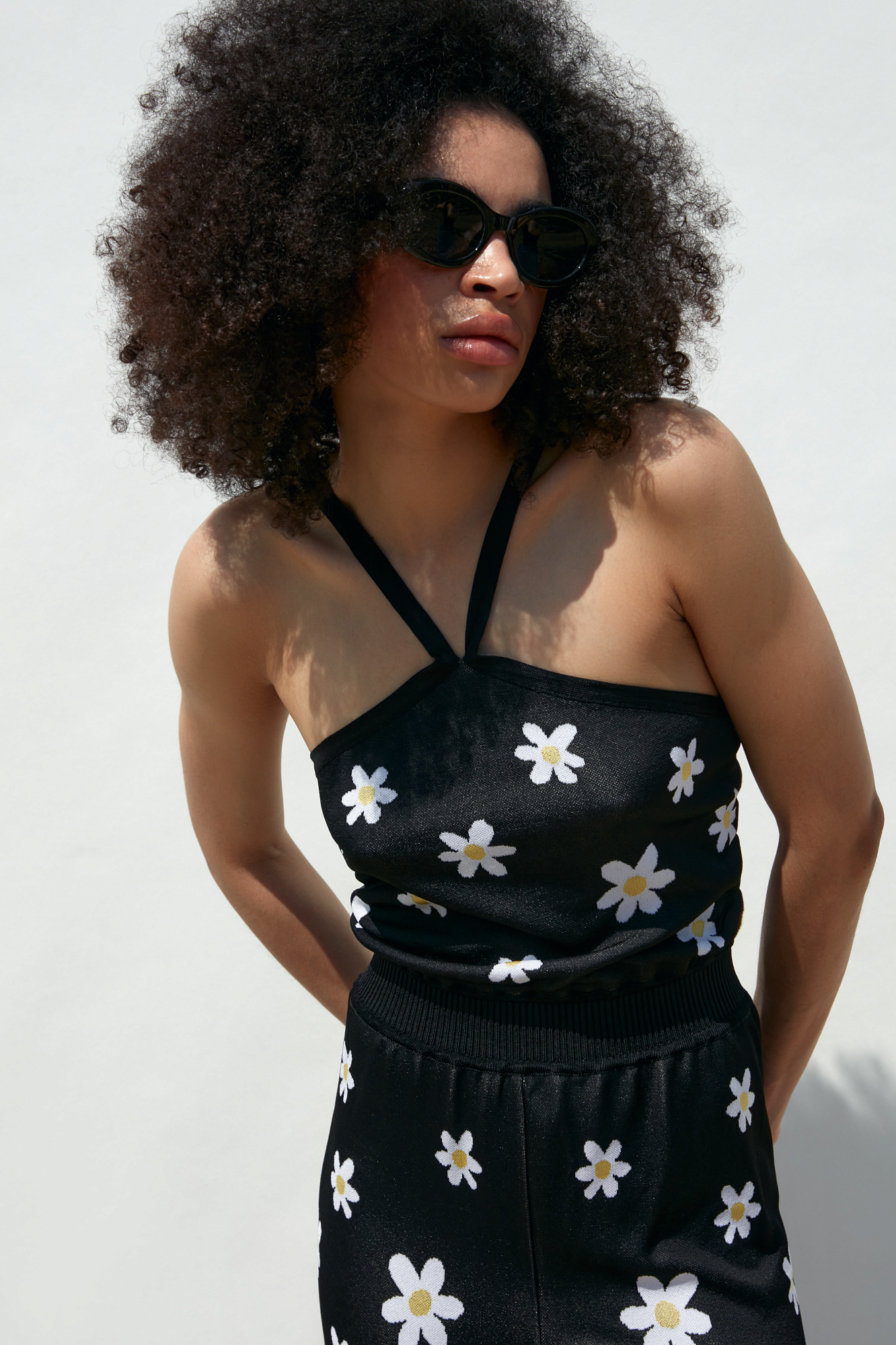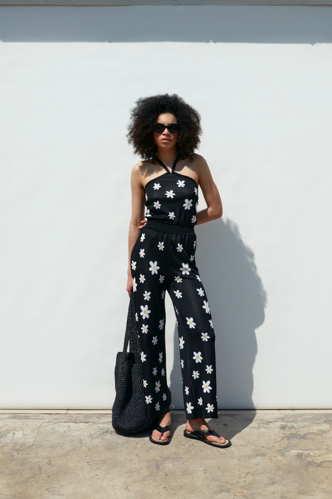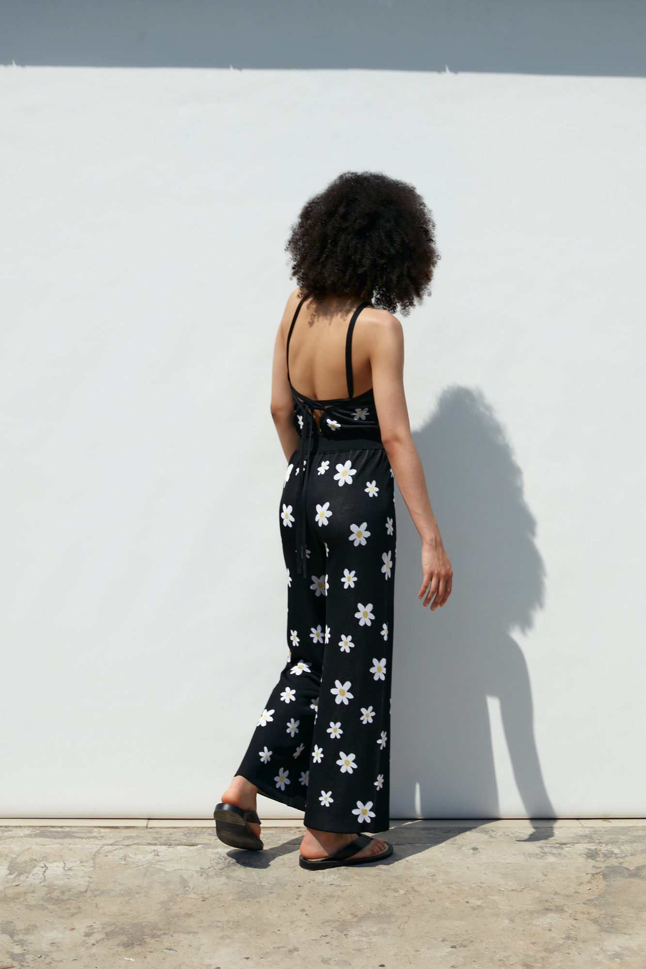 Комбинезон из вискозы с открытыми плечами. Рисунок "Ромашки".