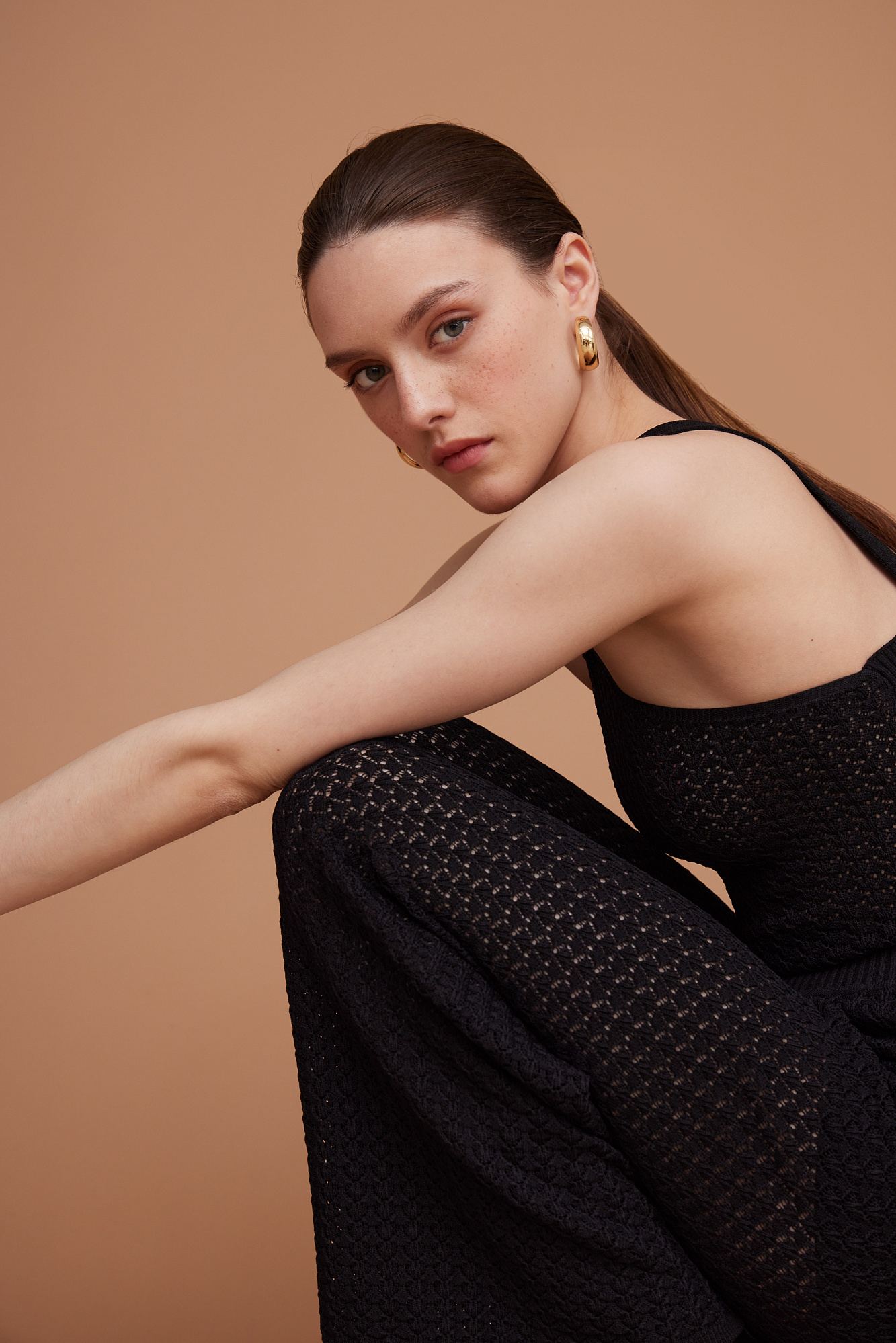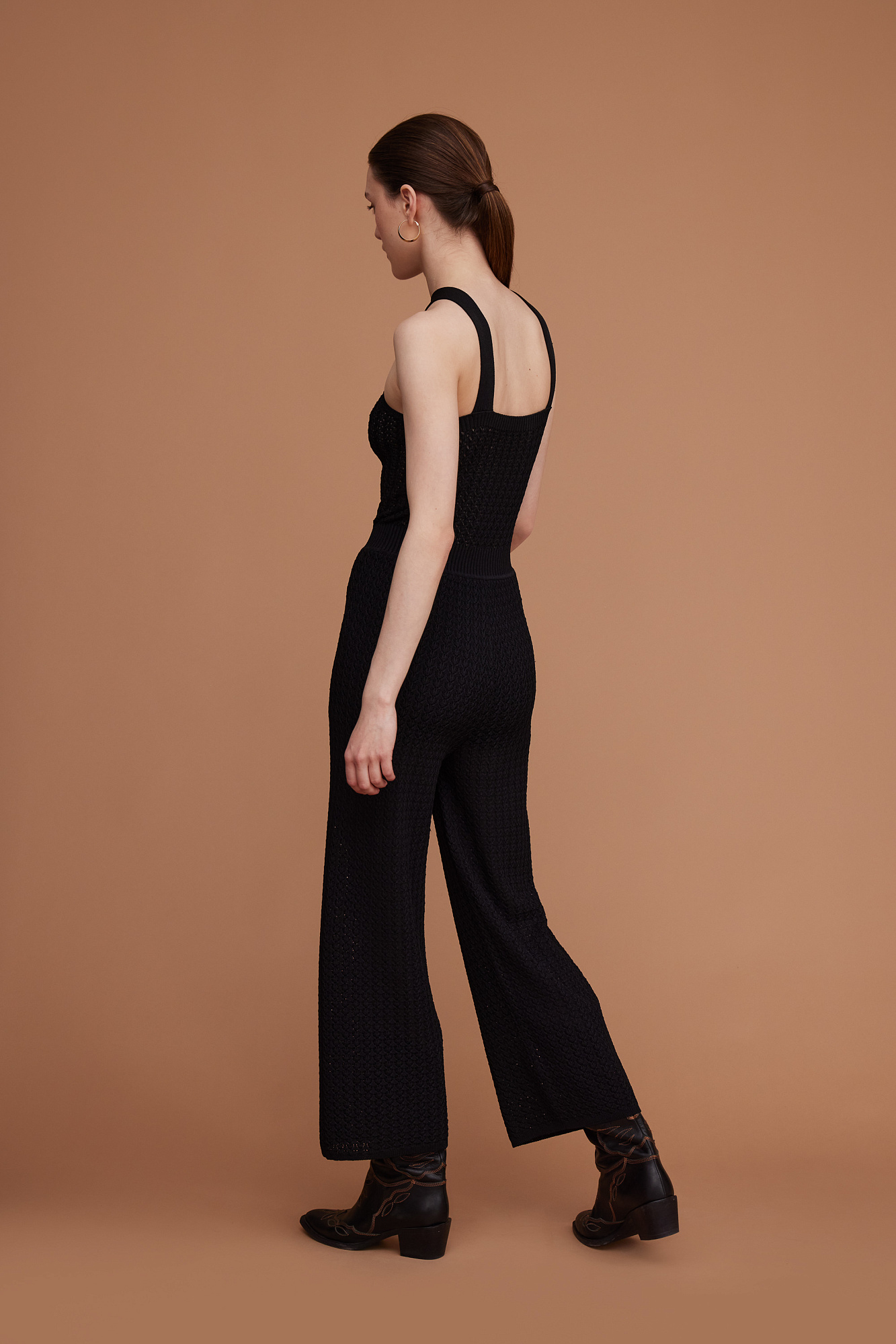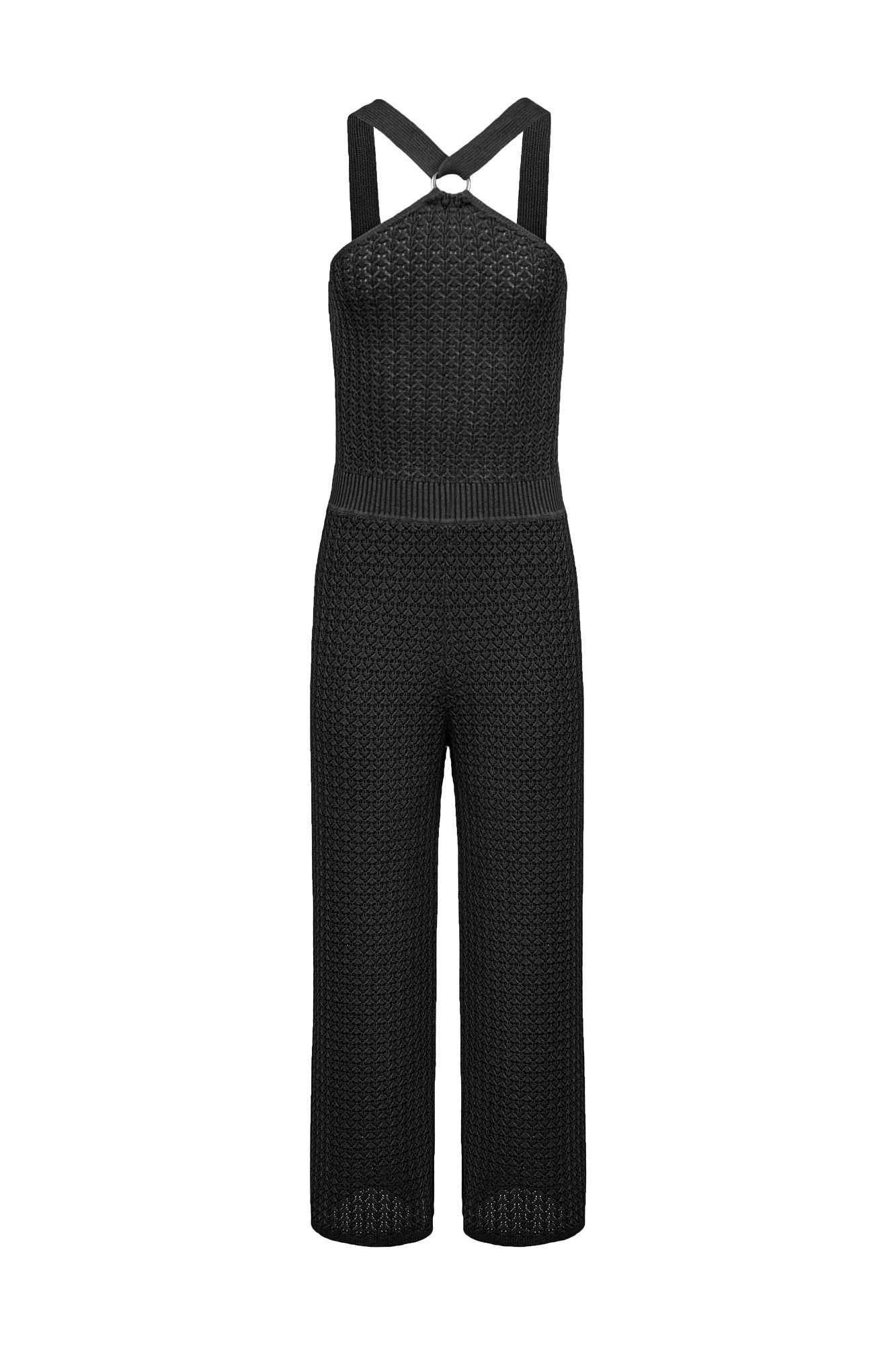 Трикотажный ажурный комбинезон на широких лямках с застежкой на кольце.