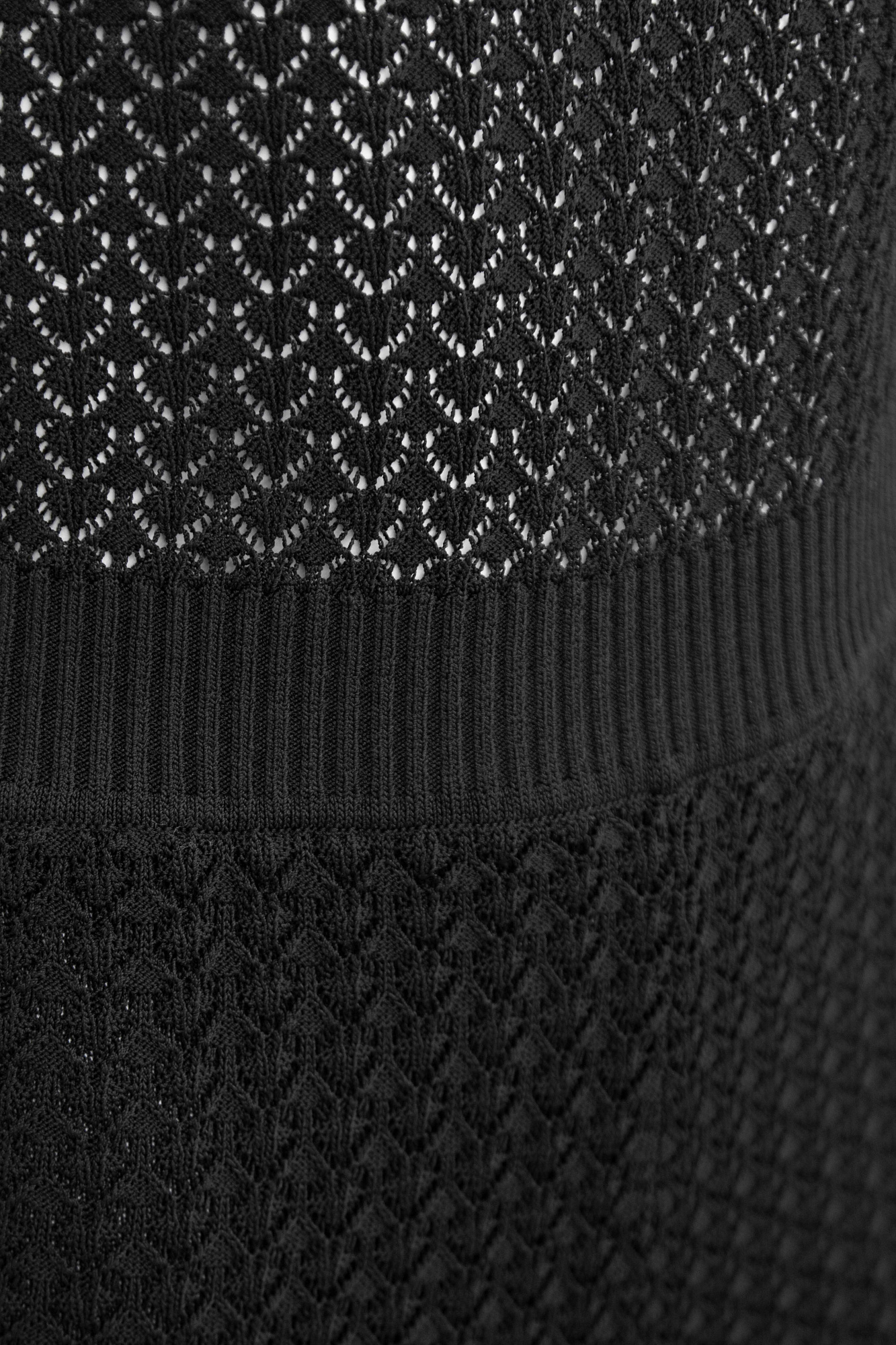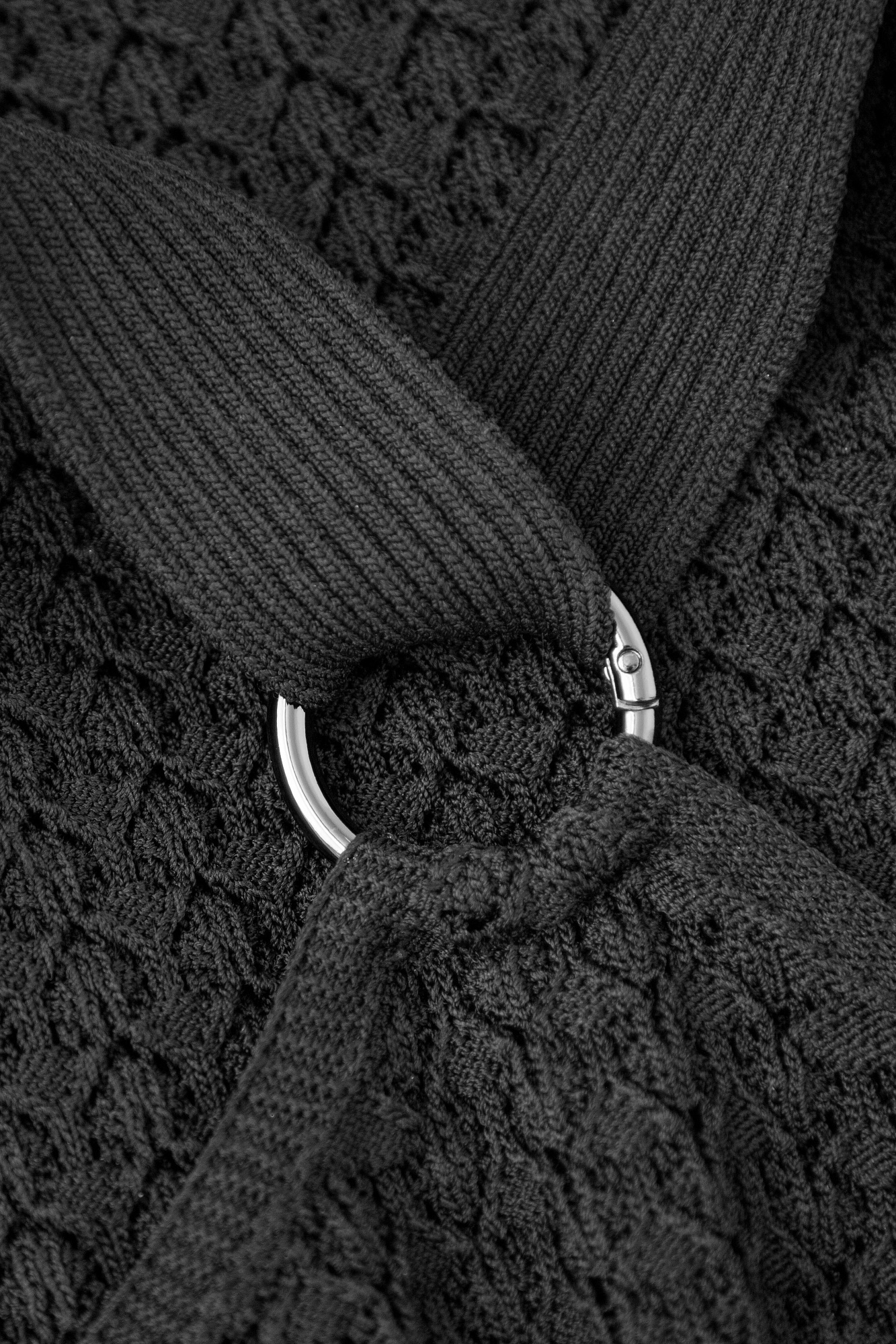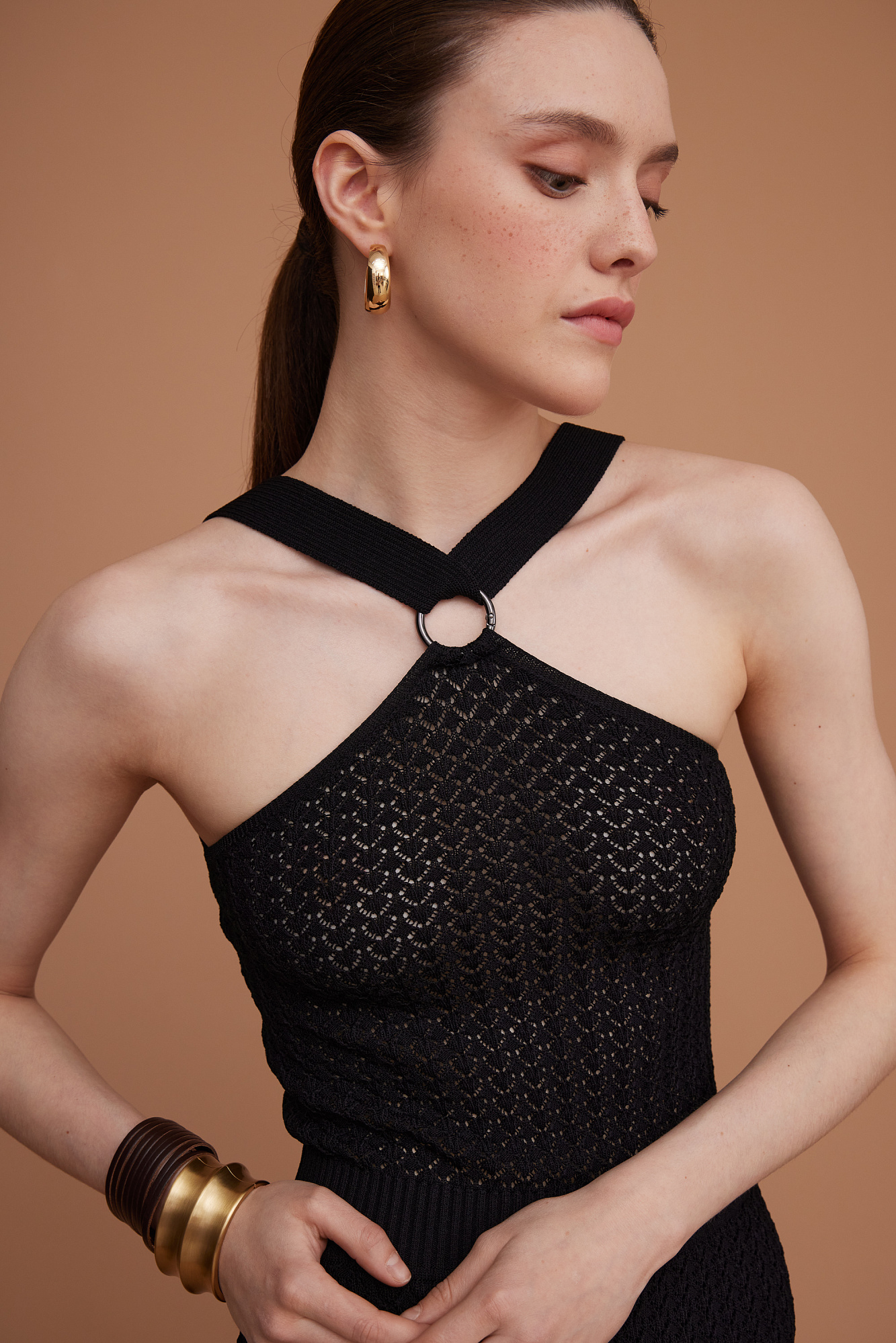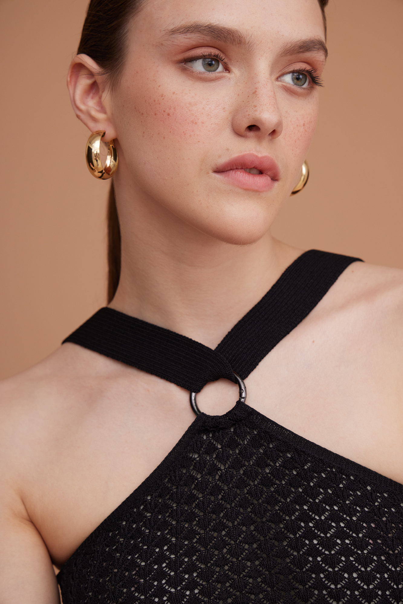 Трикотажный ажурный комбинезон на широких лямках с застежкой на кольце.