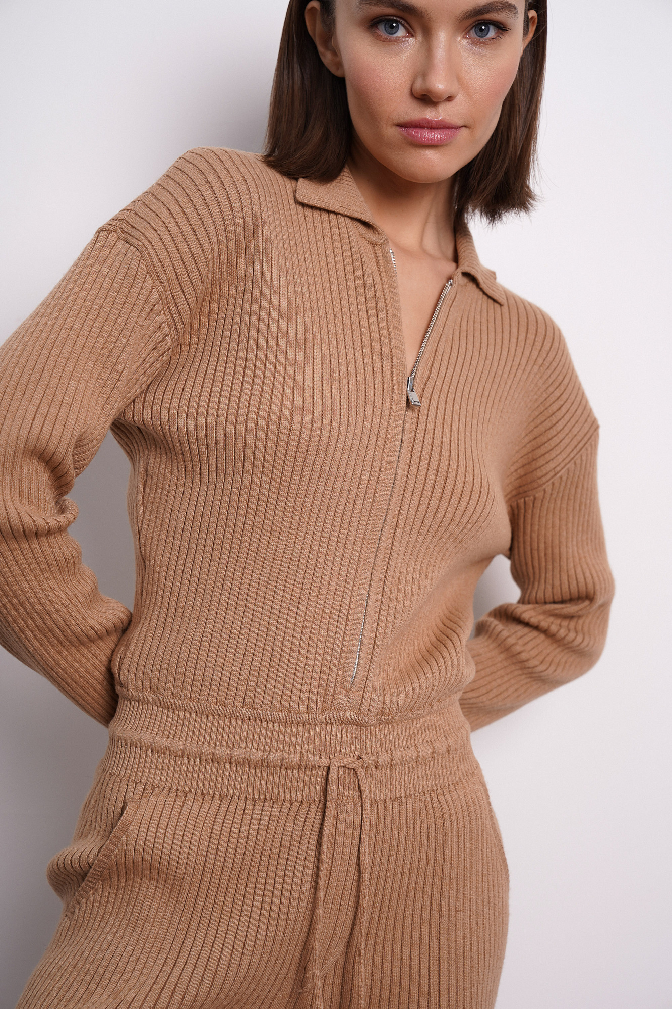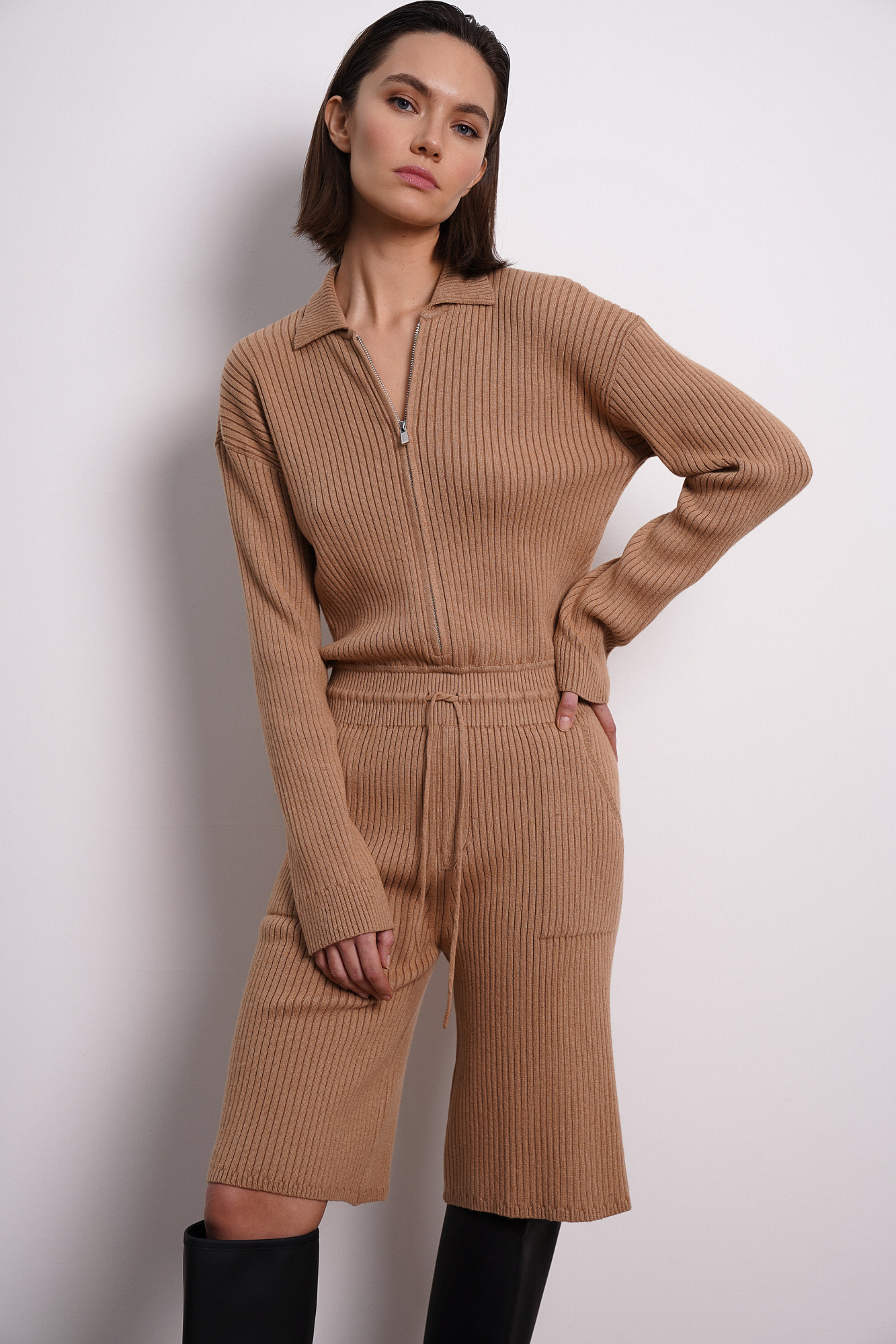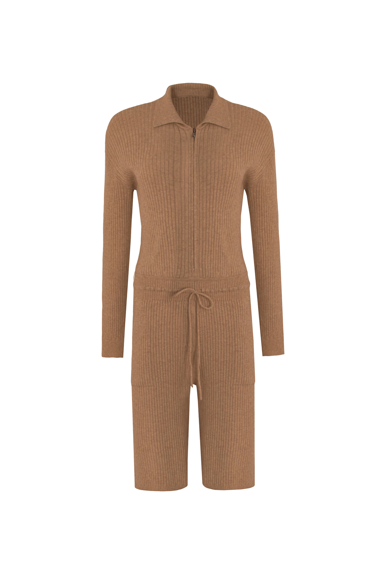 Трикотажный комбинезон из шерсти с добавлением кашемира. Верхняя часть изделия выполнена с длинным рукавом и отложным воротником, Застежка на молнию. Нижняя часть - представляет собой шорты на кулиске с боковыми карманами.