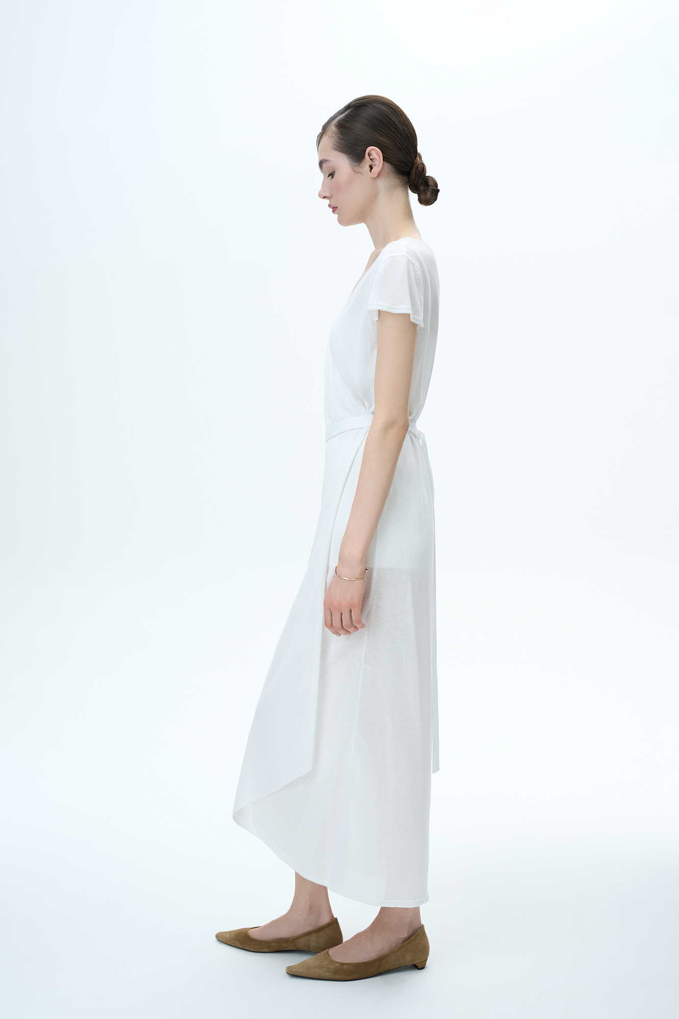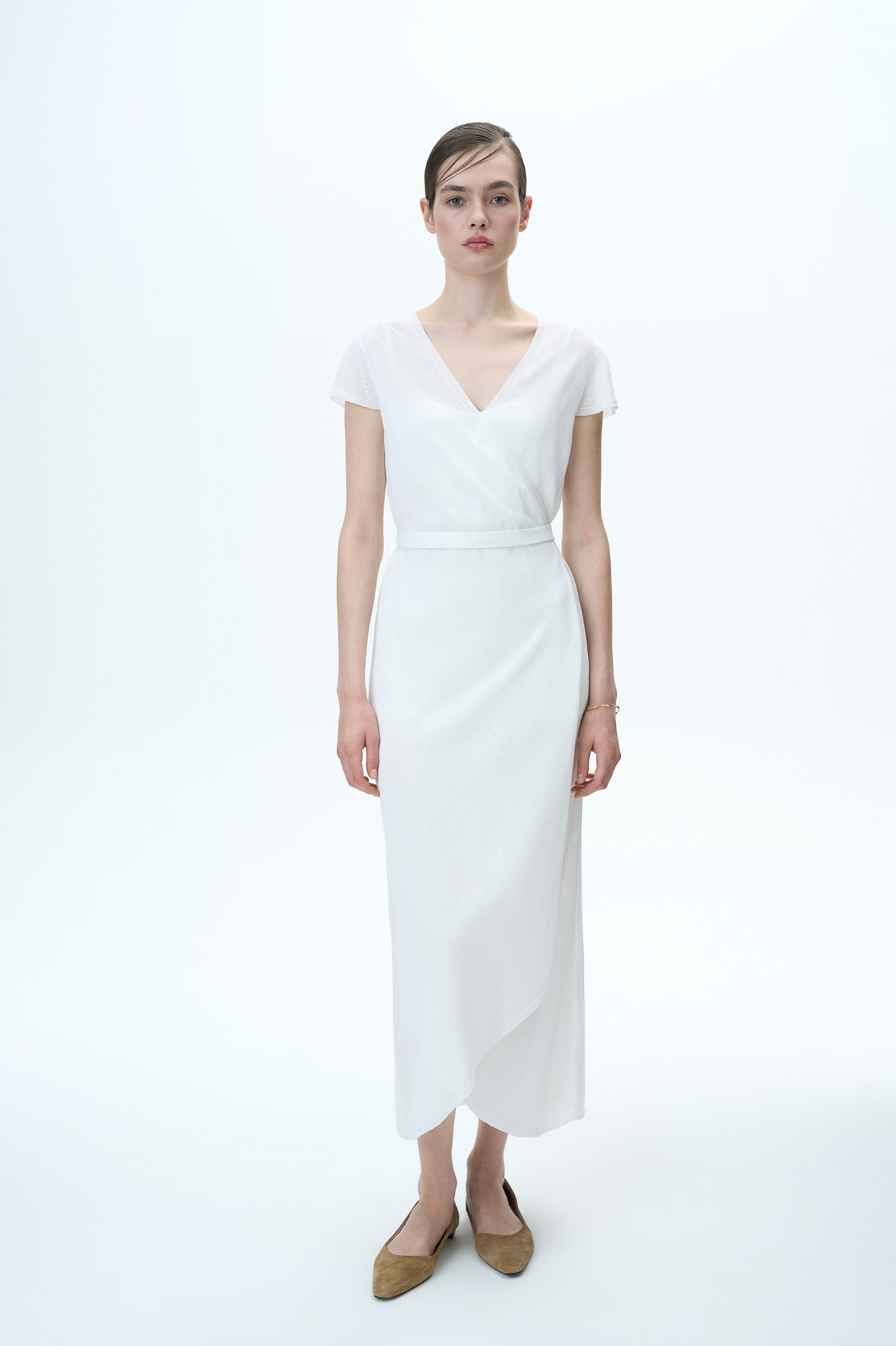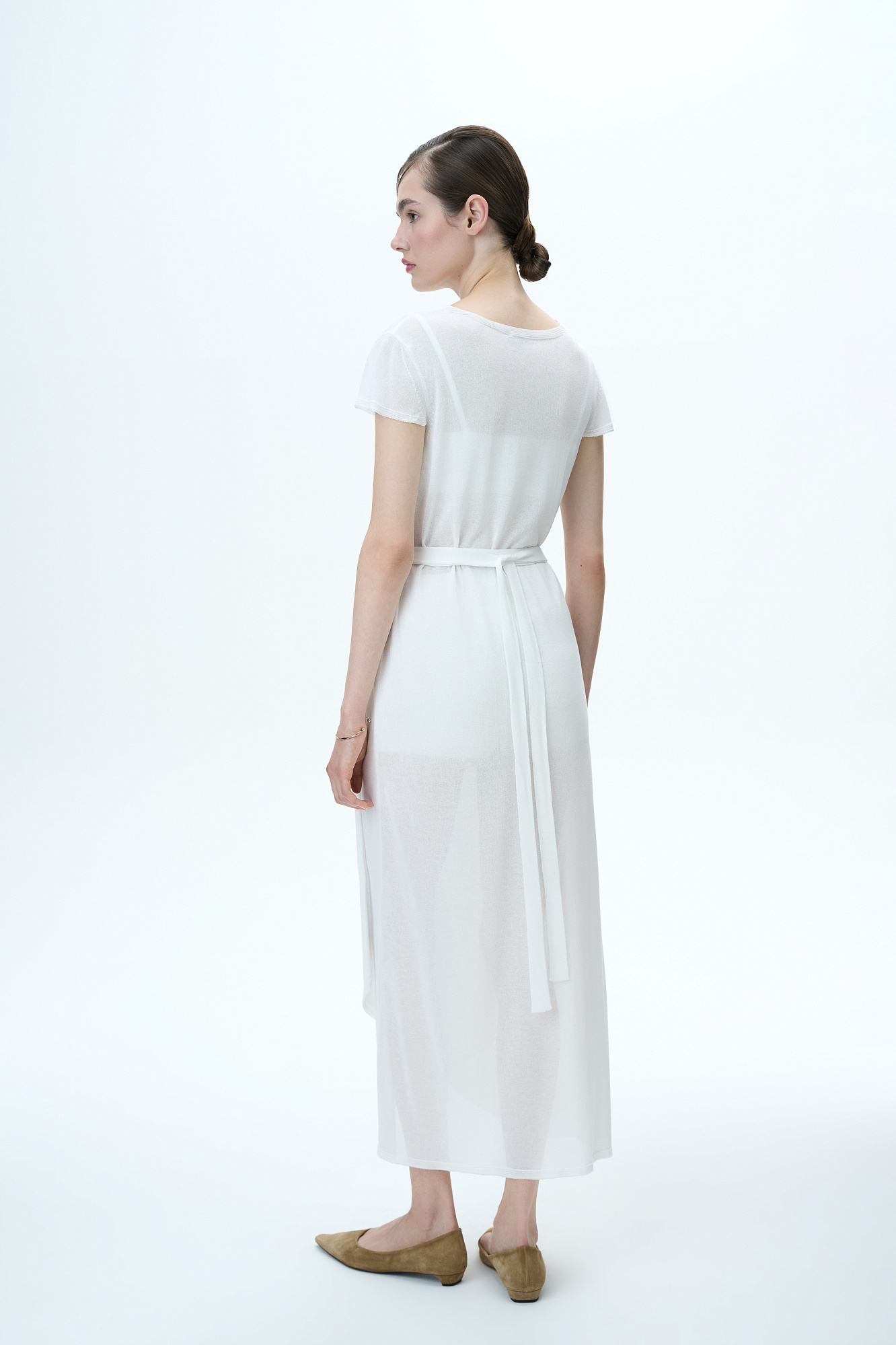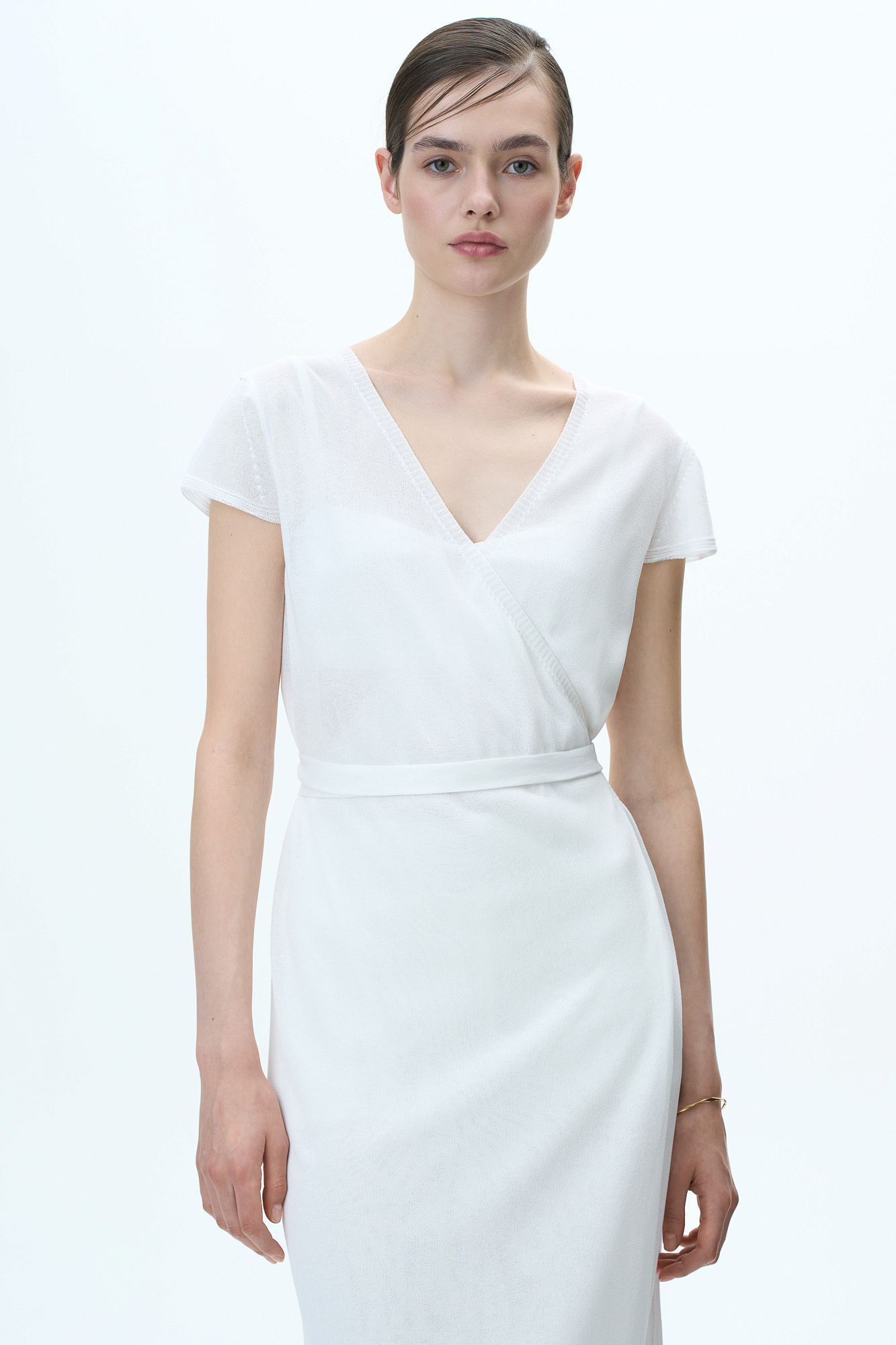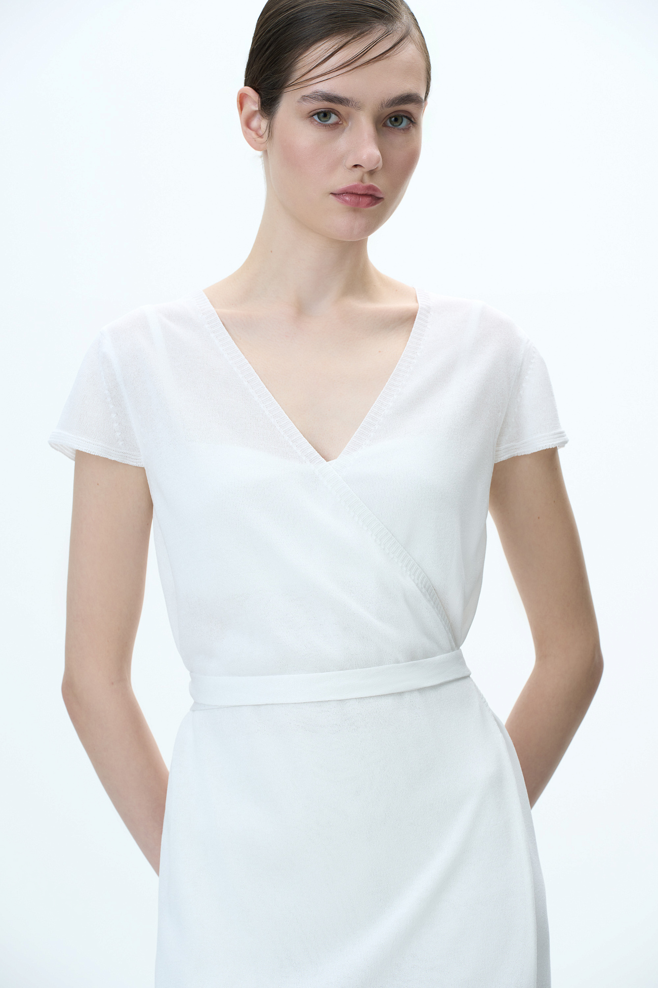 Лёгкое трикотажное платье станет прекрасным спутником летних дней. V-образный вырез идеально подходит для объёмных аксессуаров, а асимметричный край юбки добавляет образу элегантности.