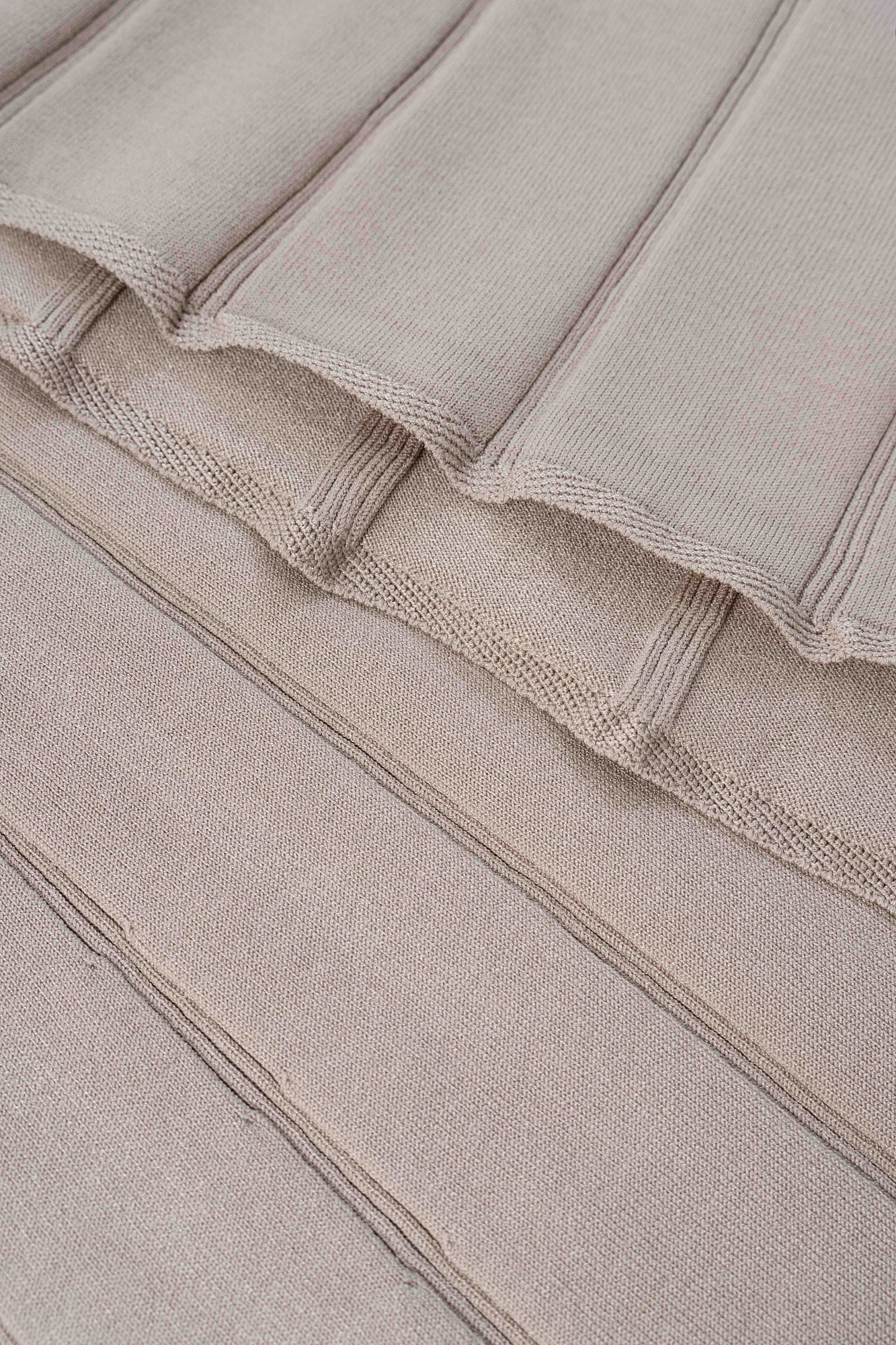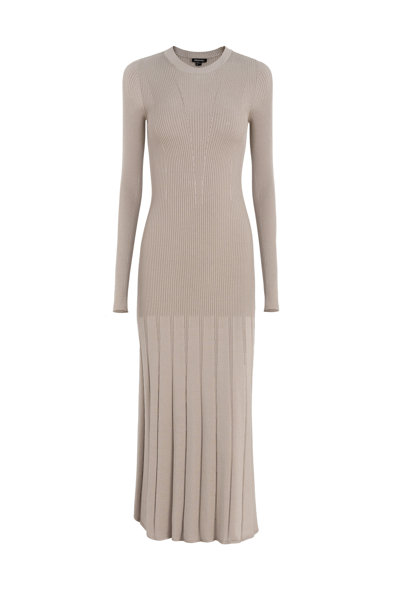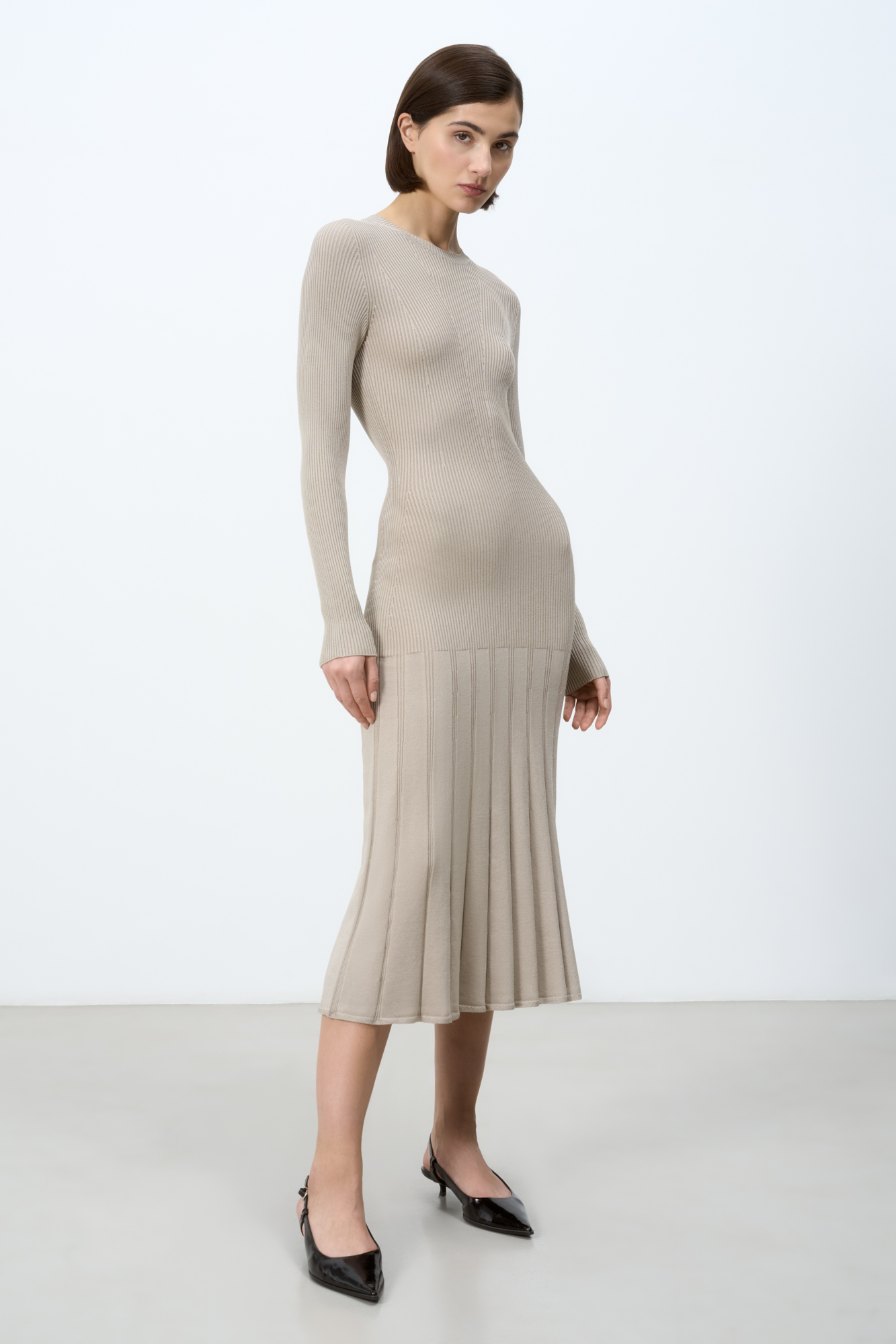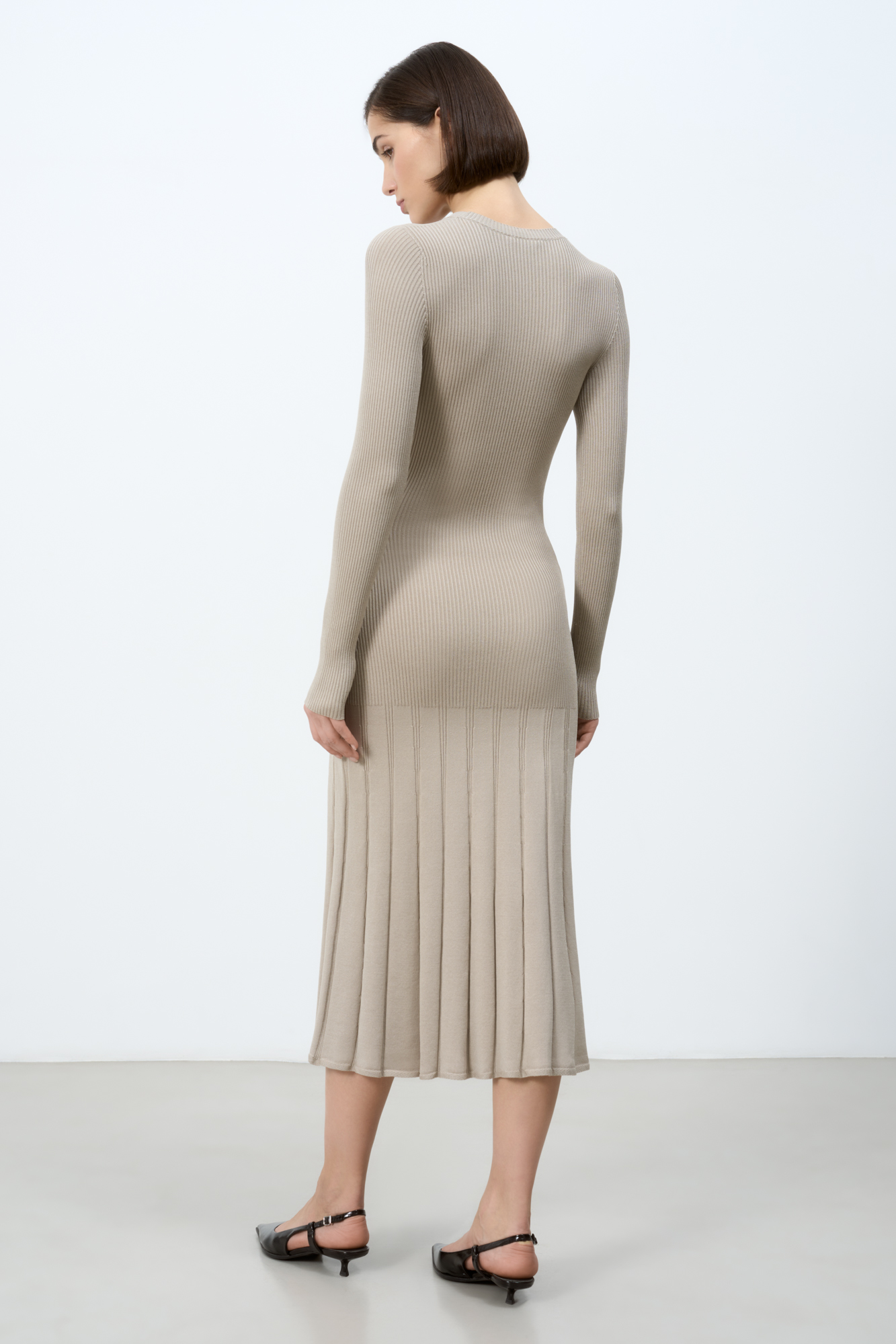 Цельновязаное платье с расклешенной юбкой. Модель приталенного силуэта длины миди.