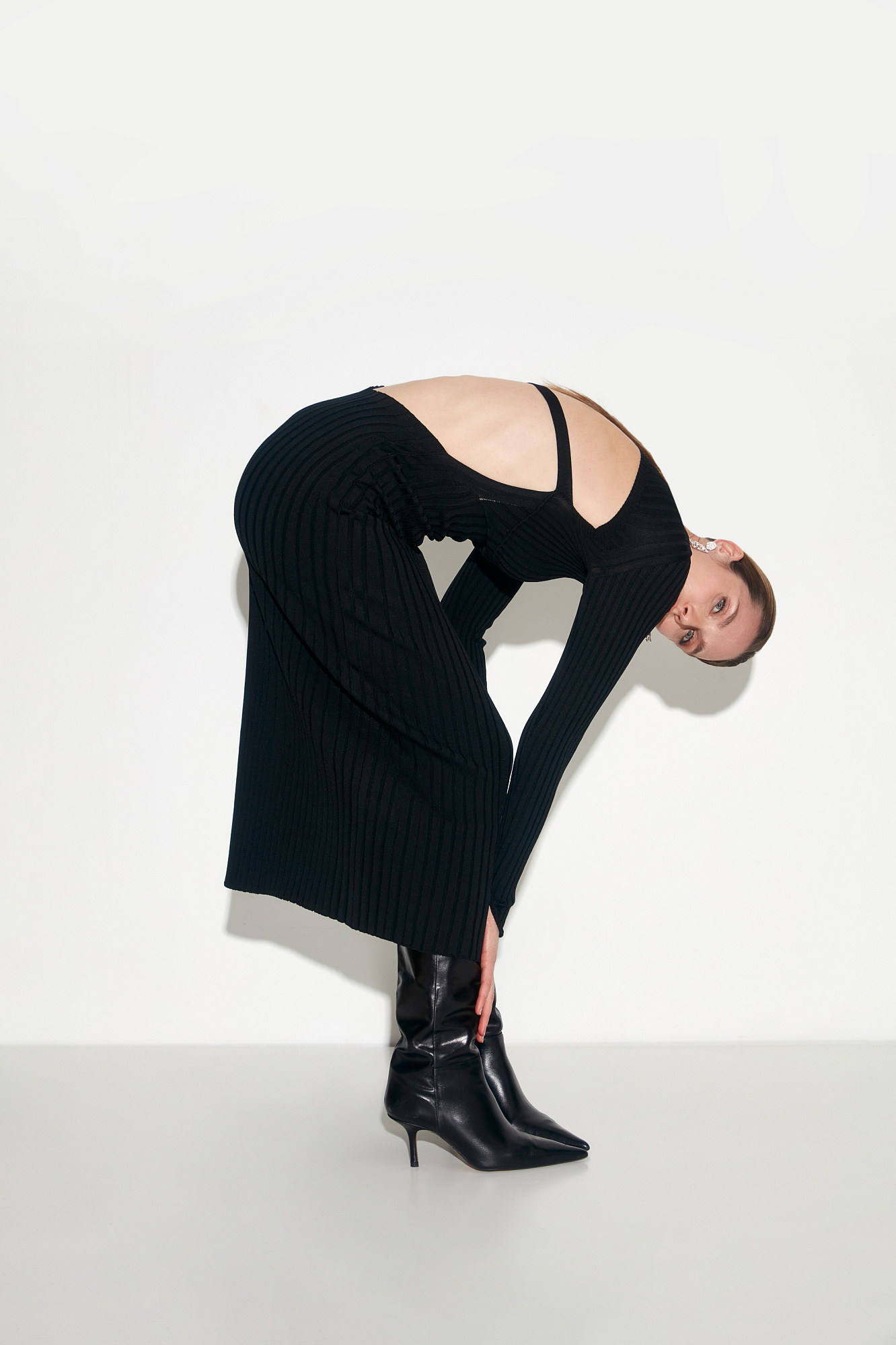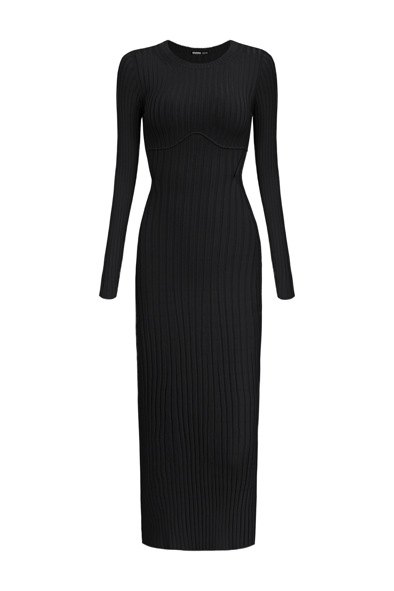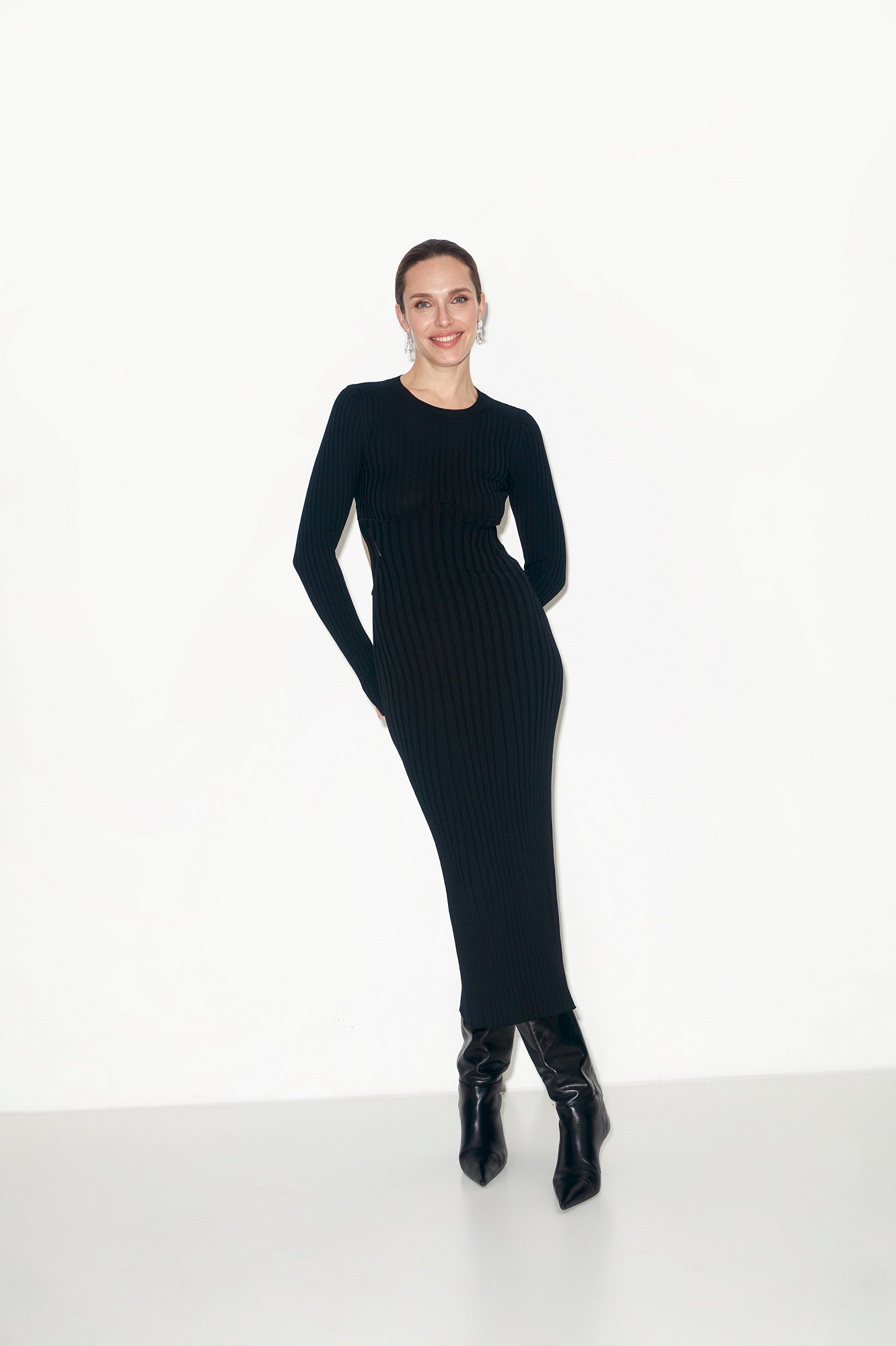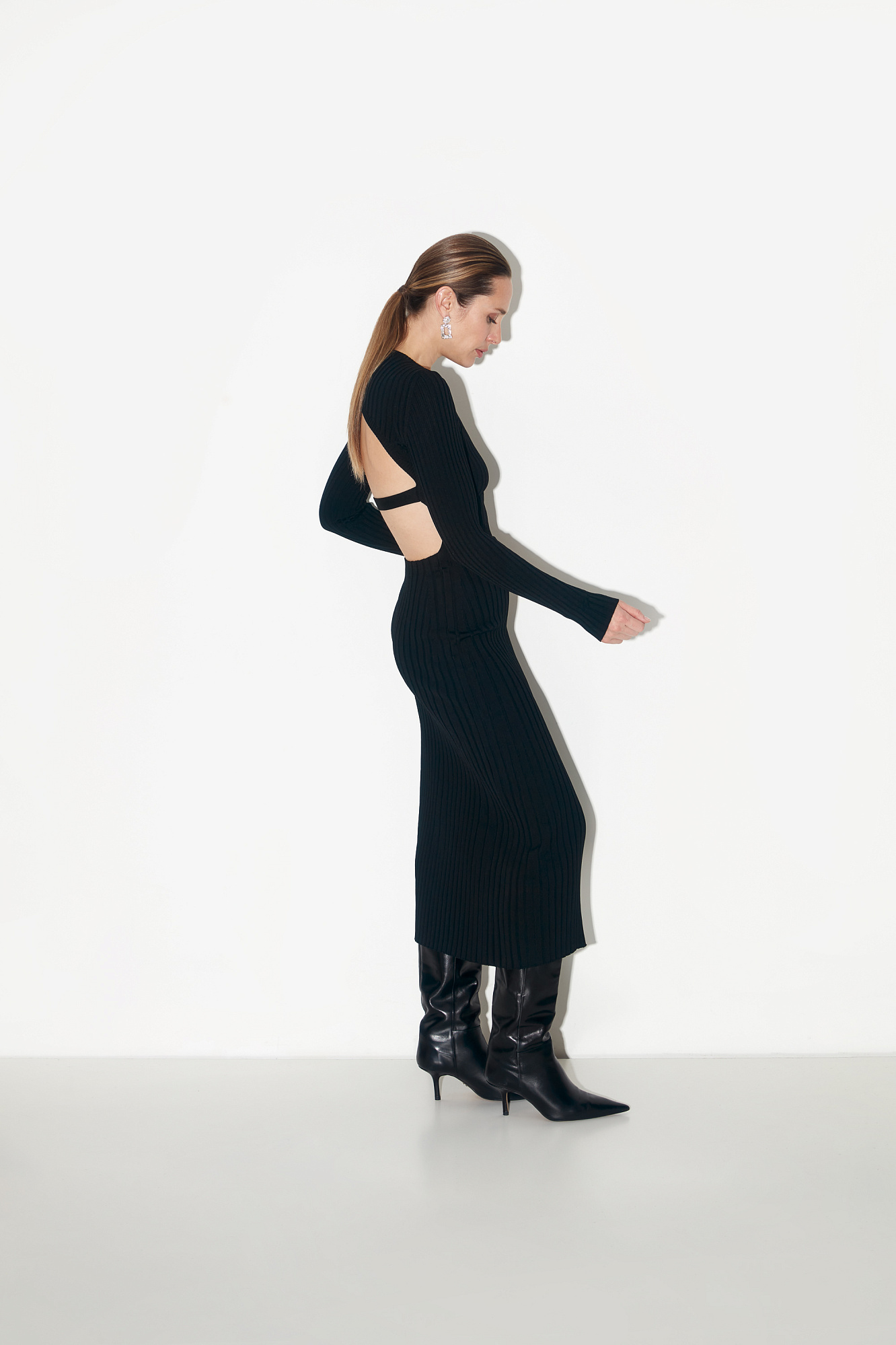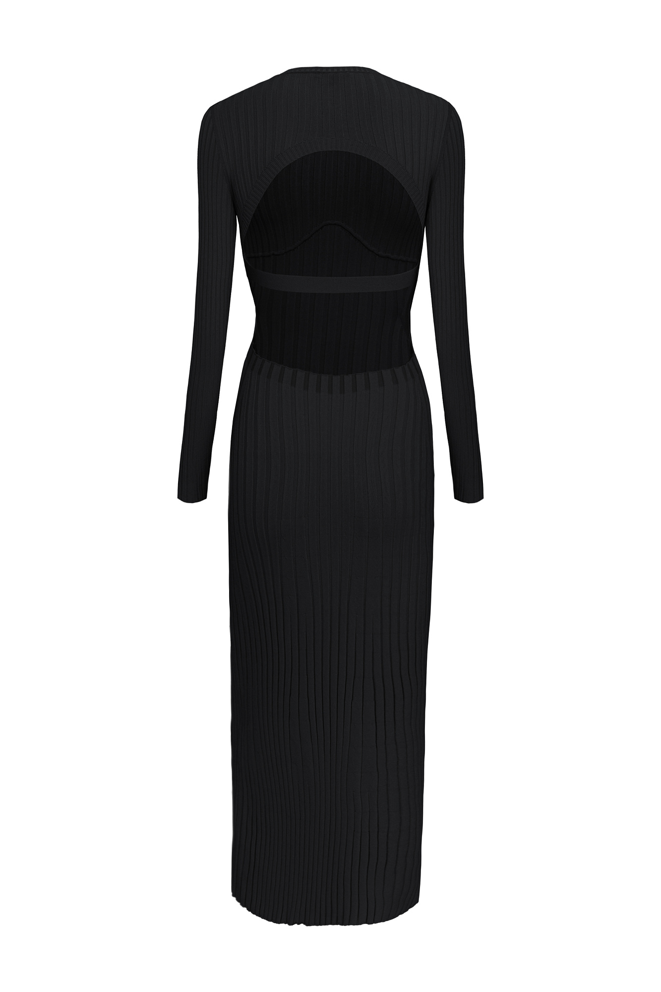 Трикотажное платье с открытой спиной. Круглый вырез и длинные рукава.