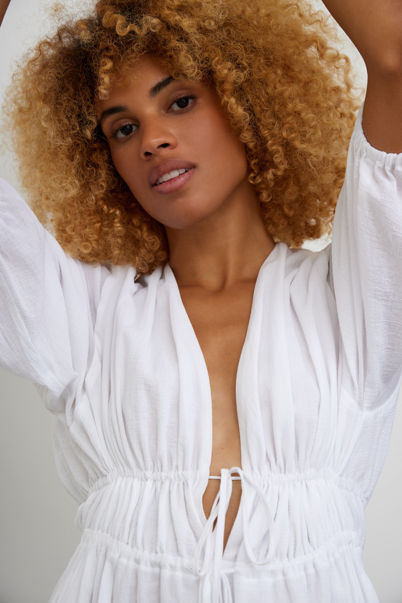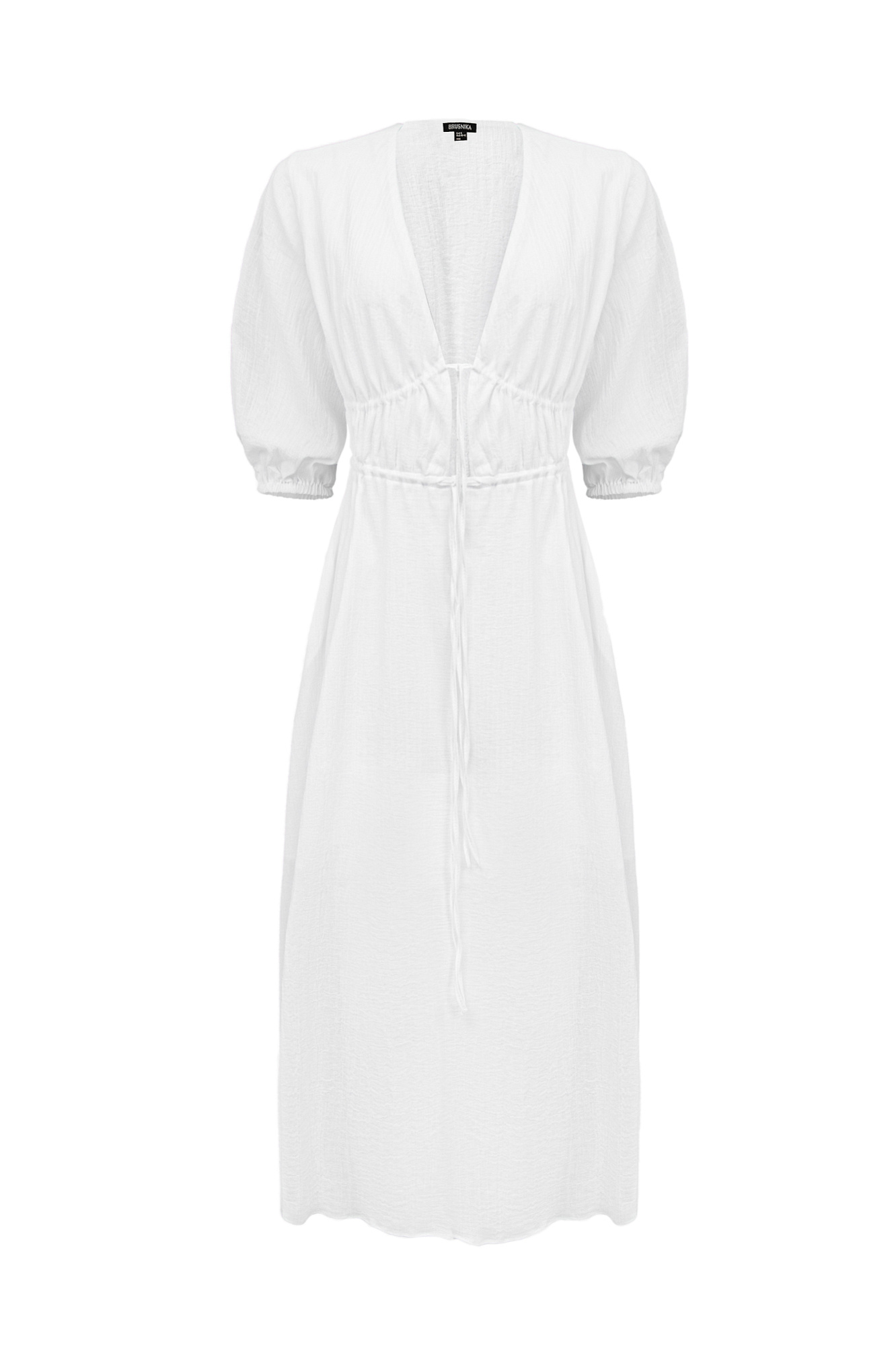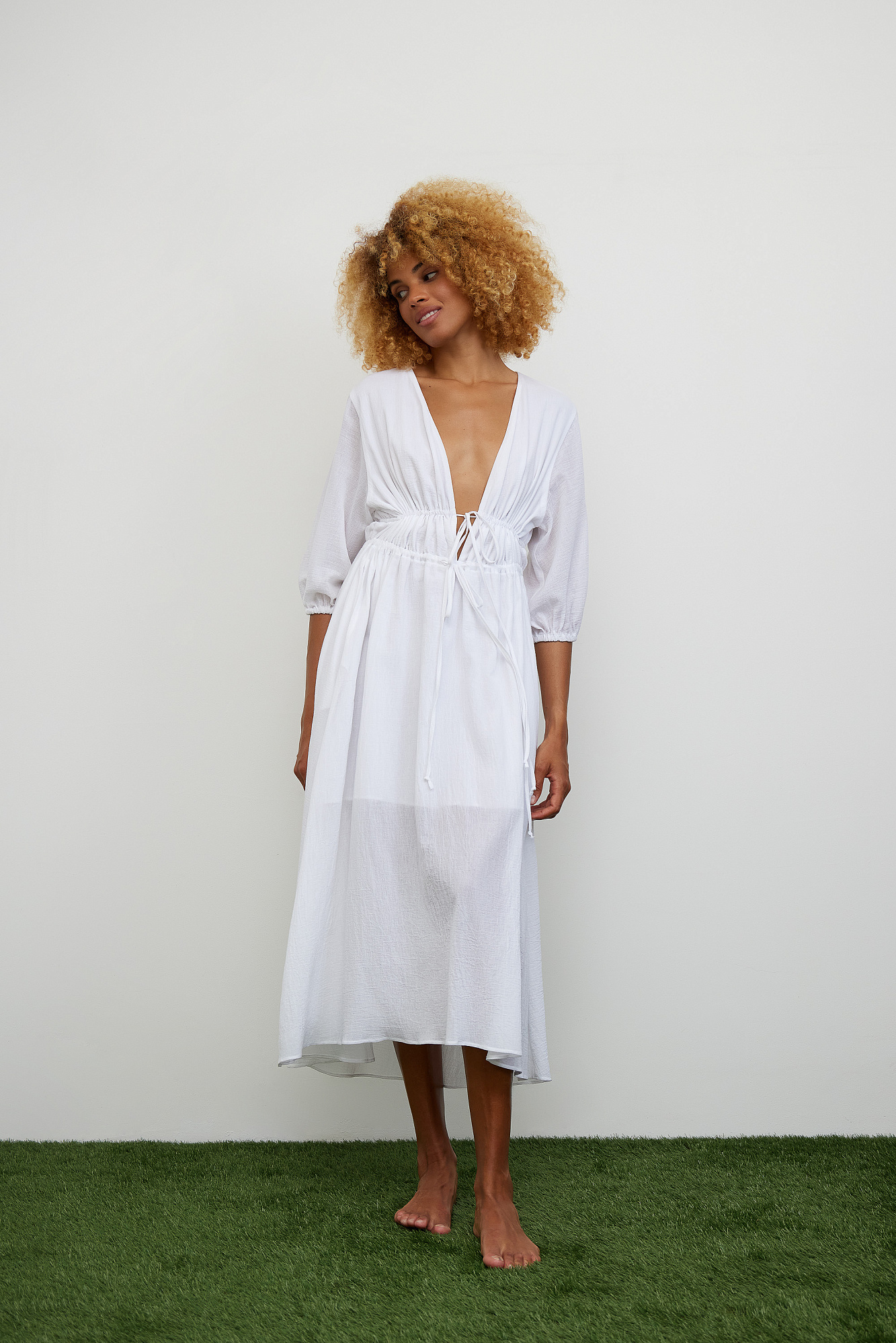 Платье из 100% хлопка с V-вырезом. Регулируется кулиской на талии.