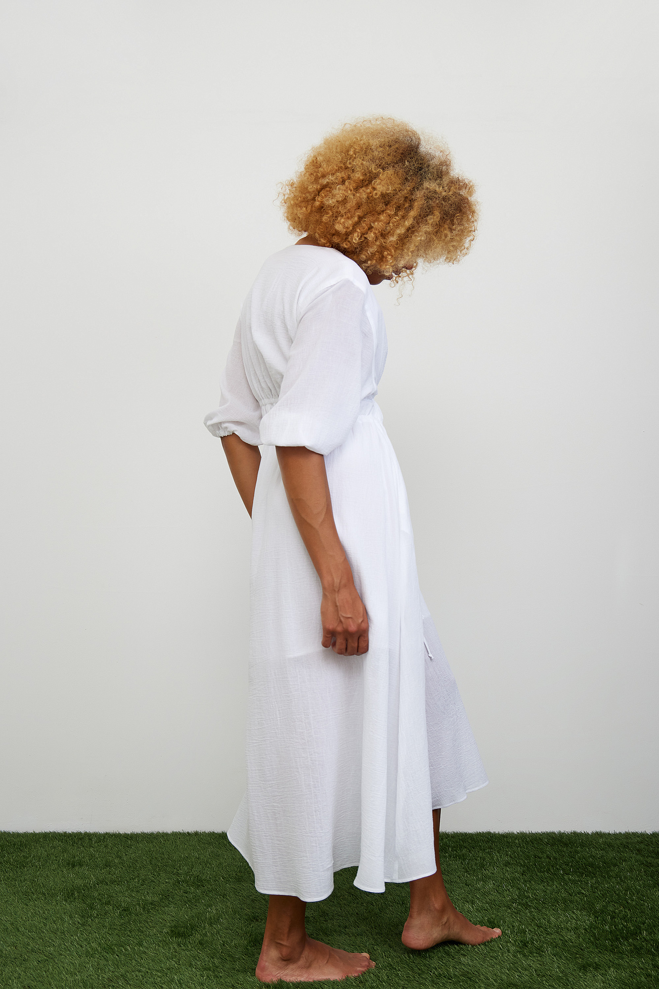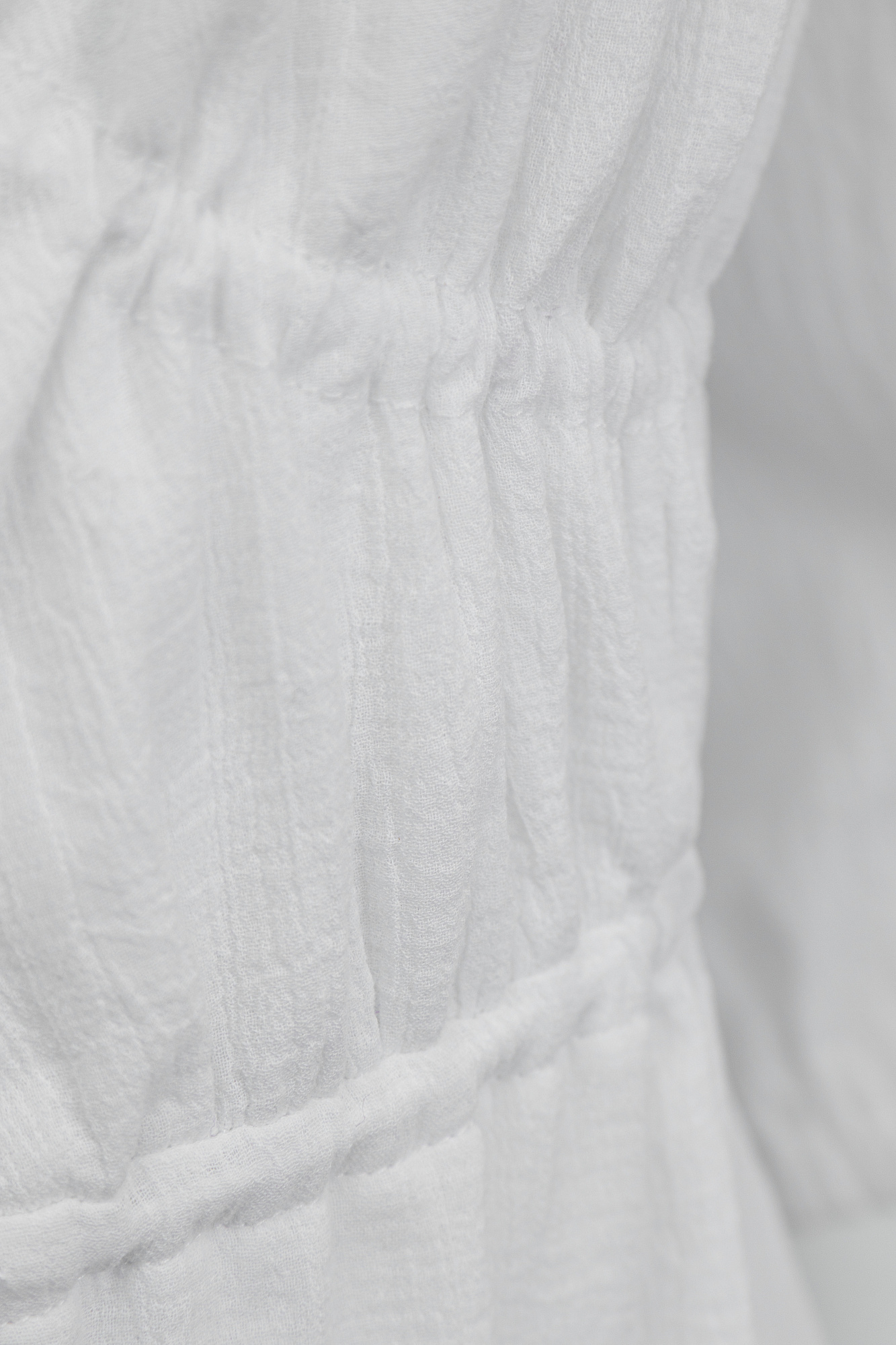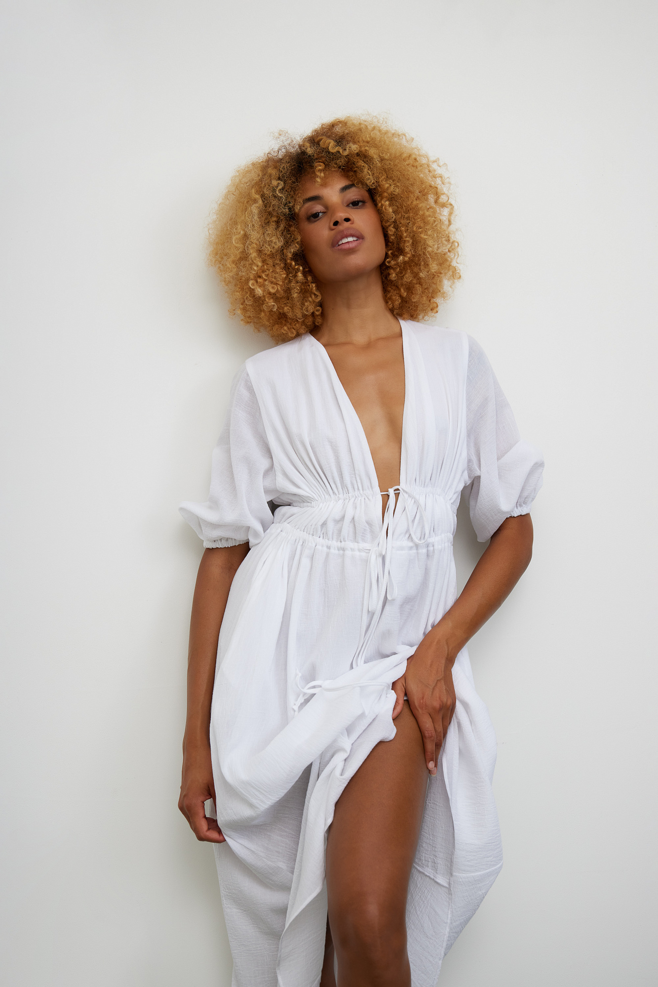 Платье из 100% хлопка с V-вырезом. Регулируется кулиской на талии.