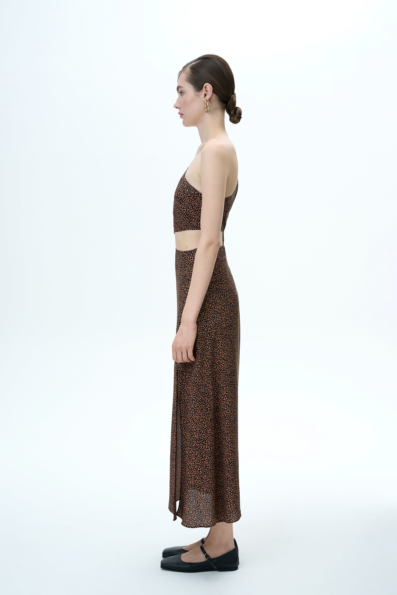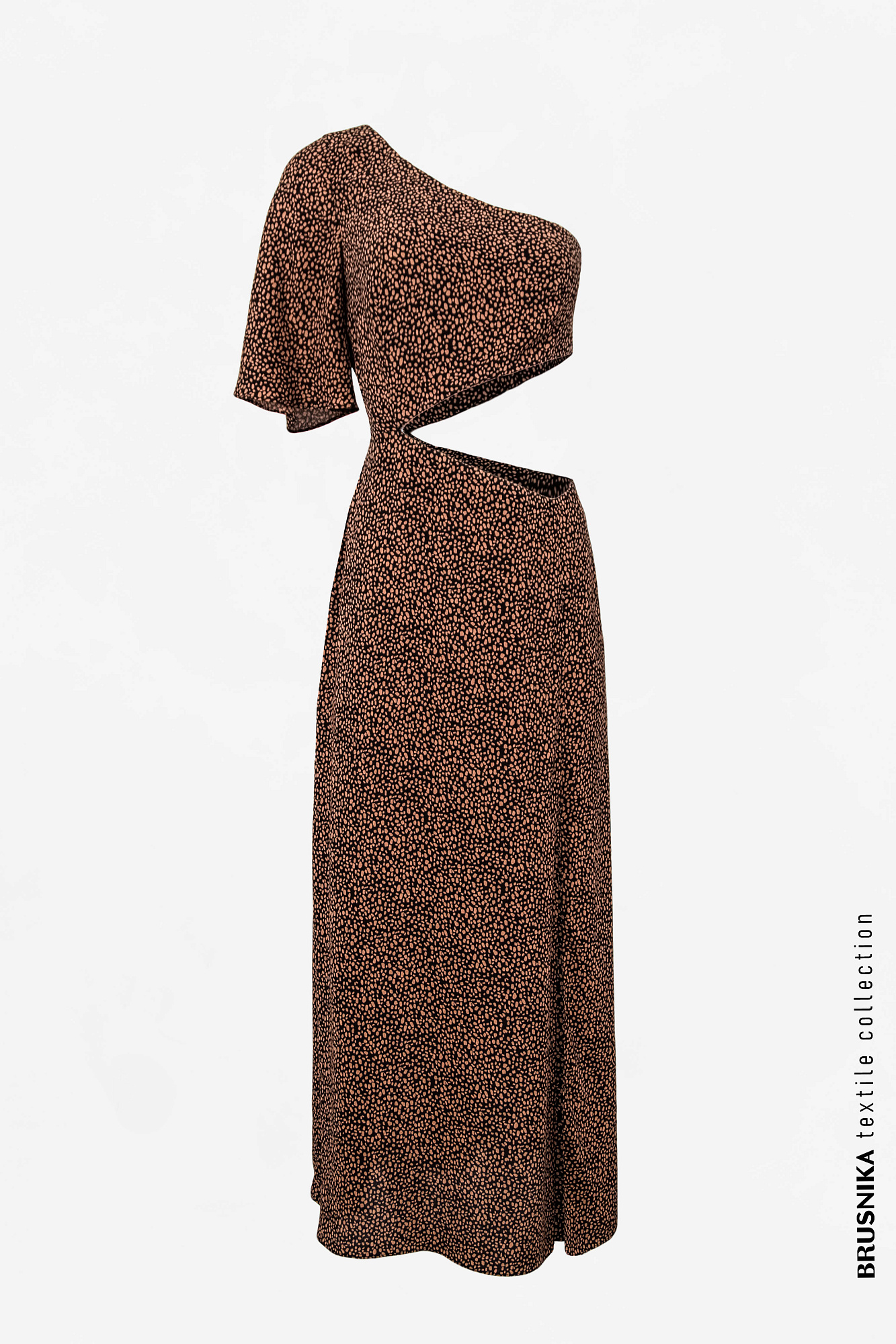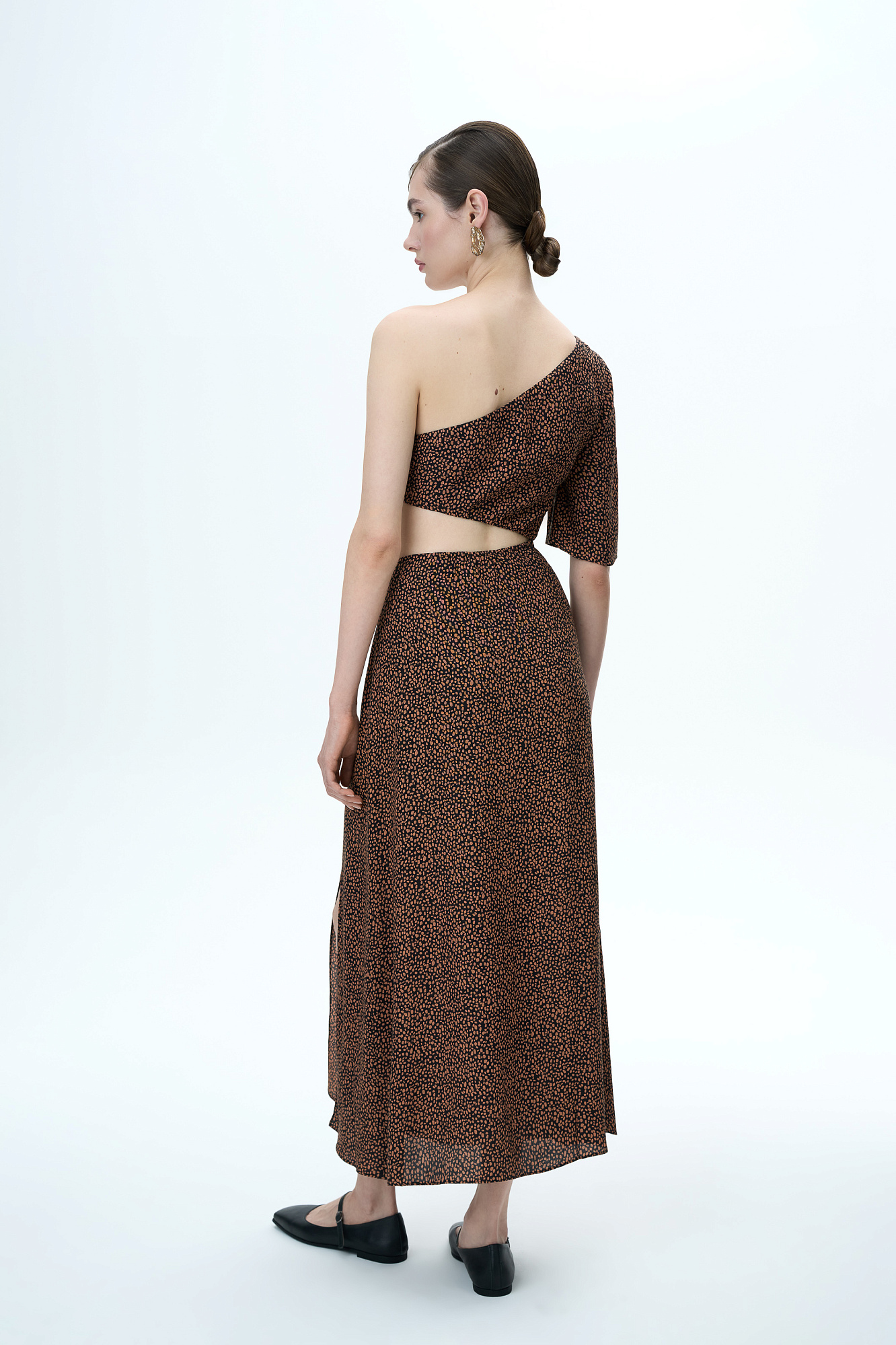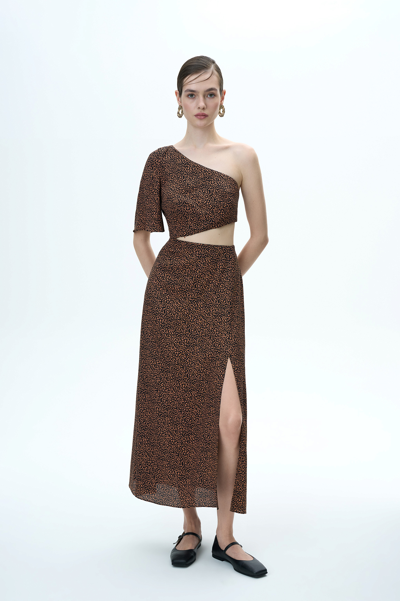 Платье из вискозы с открытым плечом, вырезом на талии и разрезом сбоку.