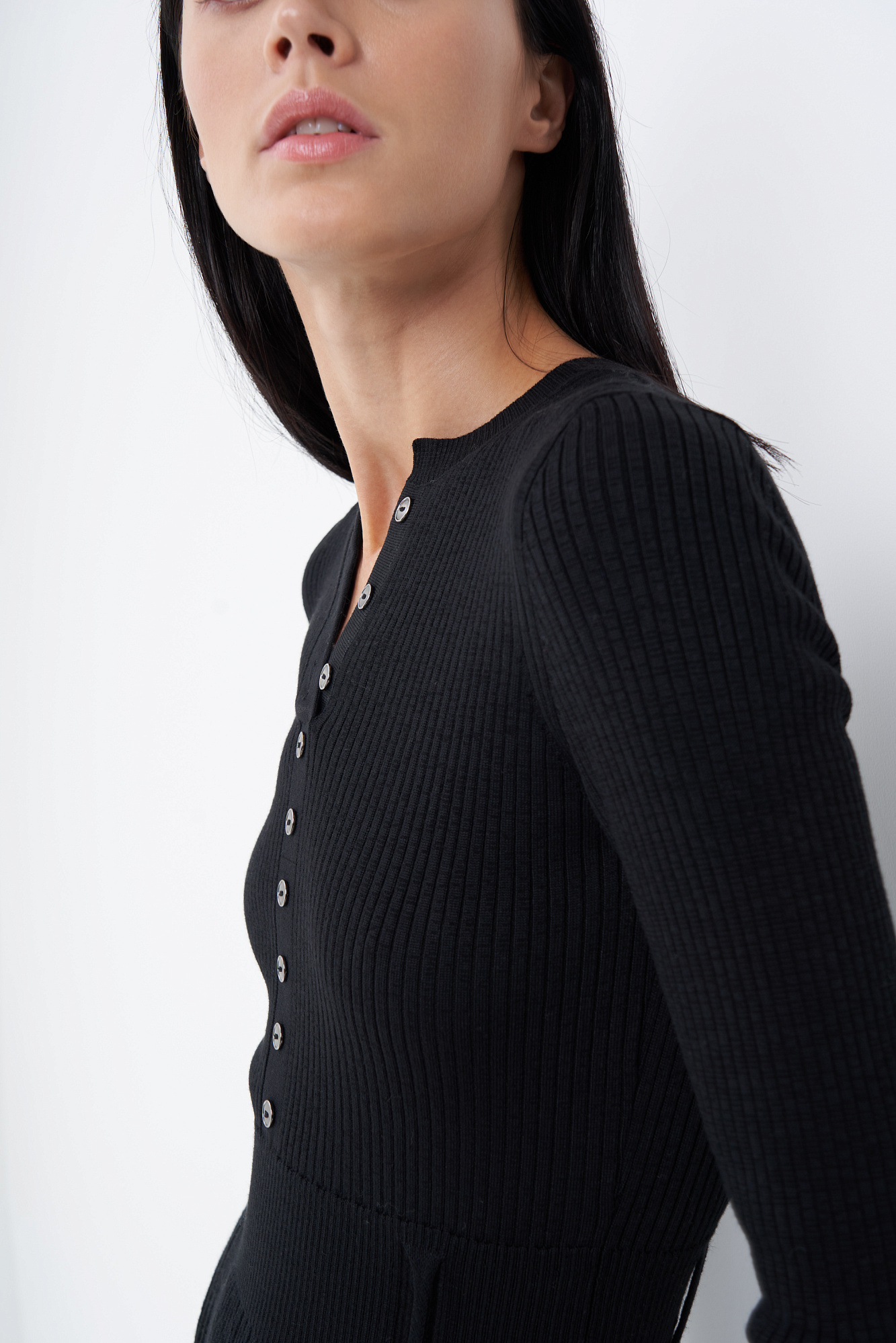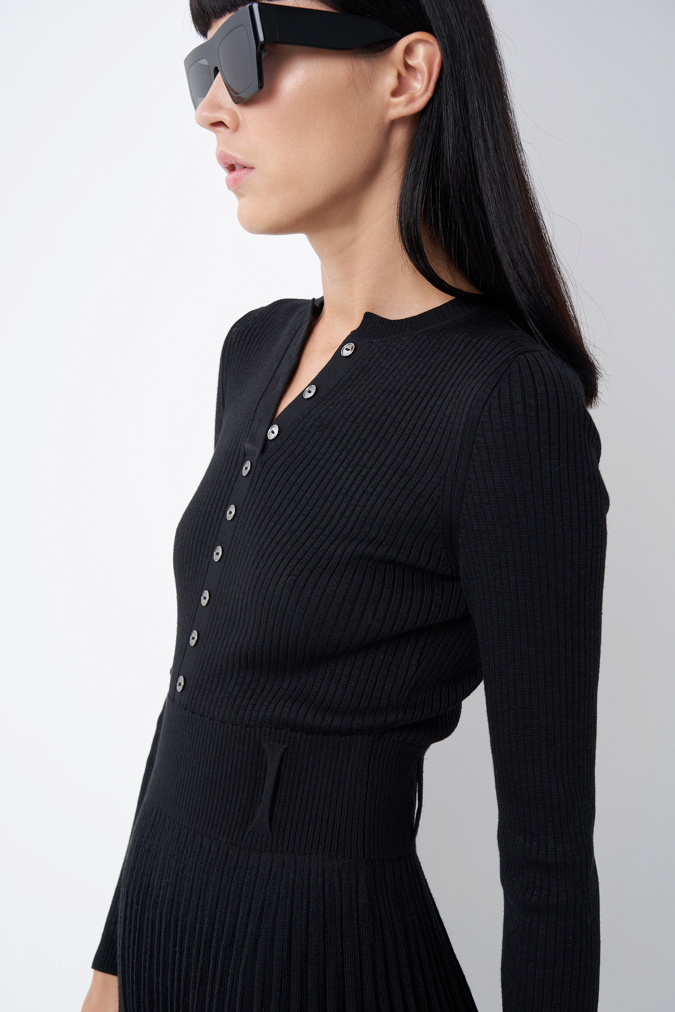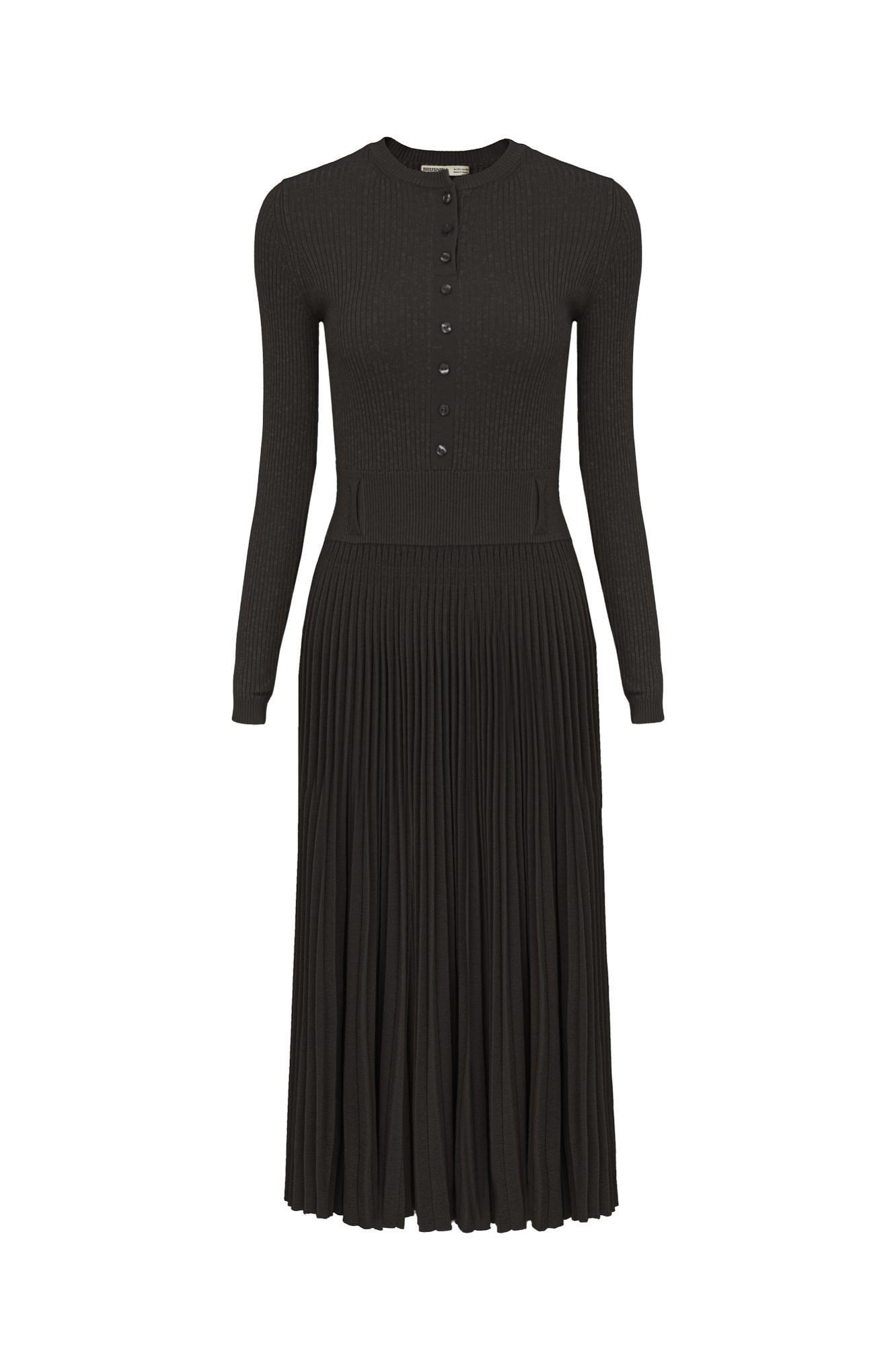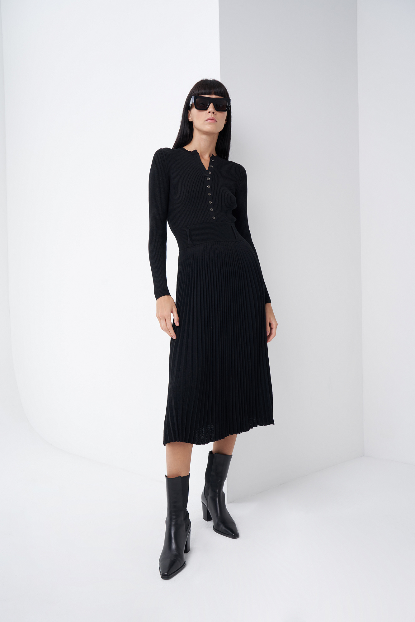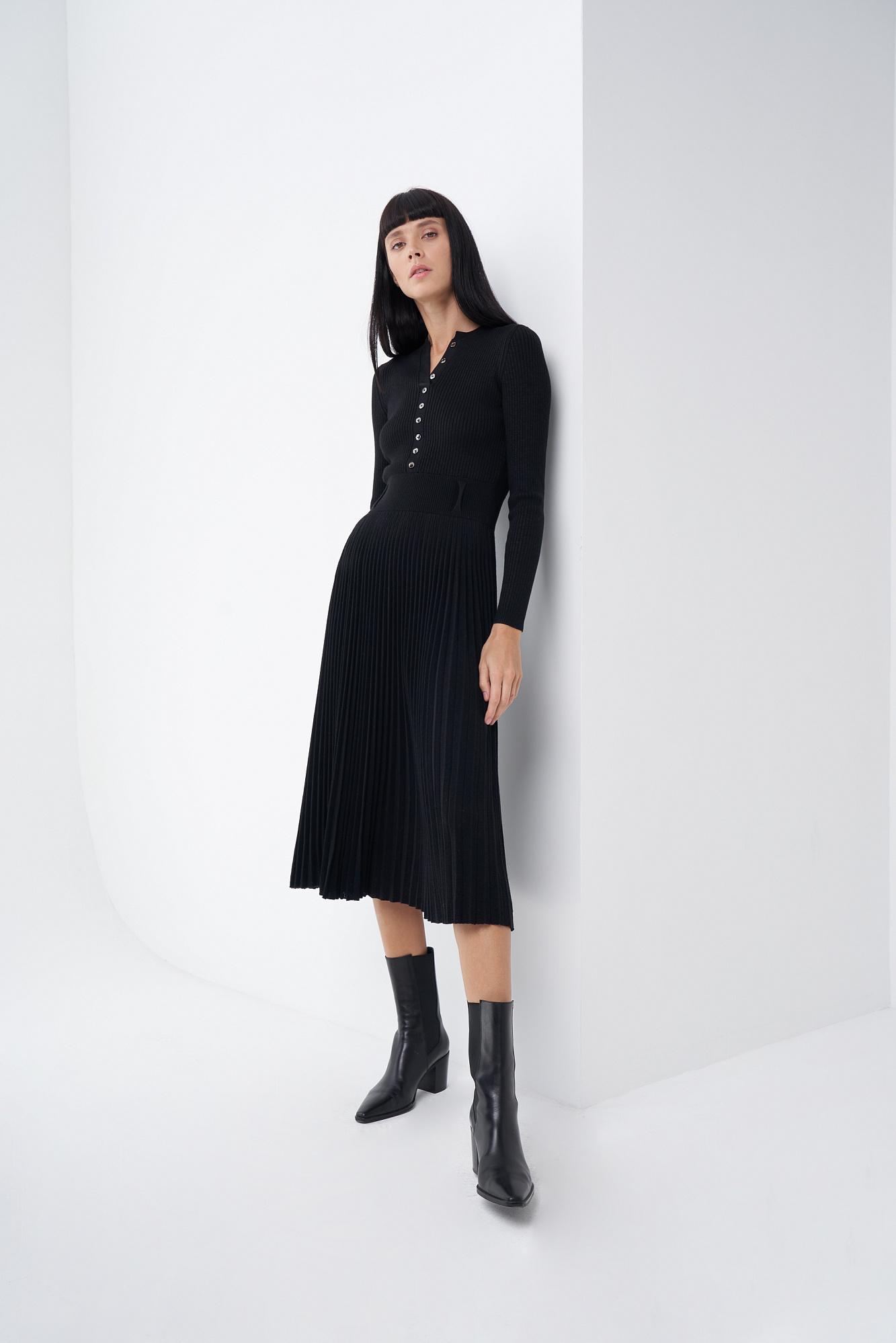 Платье из шерсти и вискозы миди длины с юбкой-плиссе и планкой с пуговицами на груди.