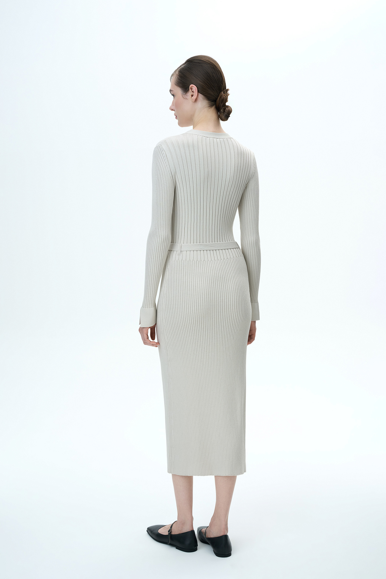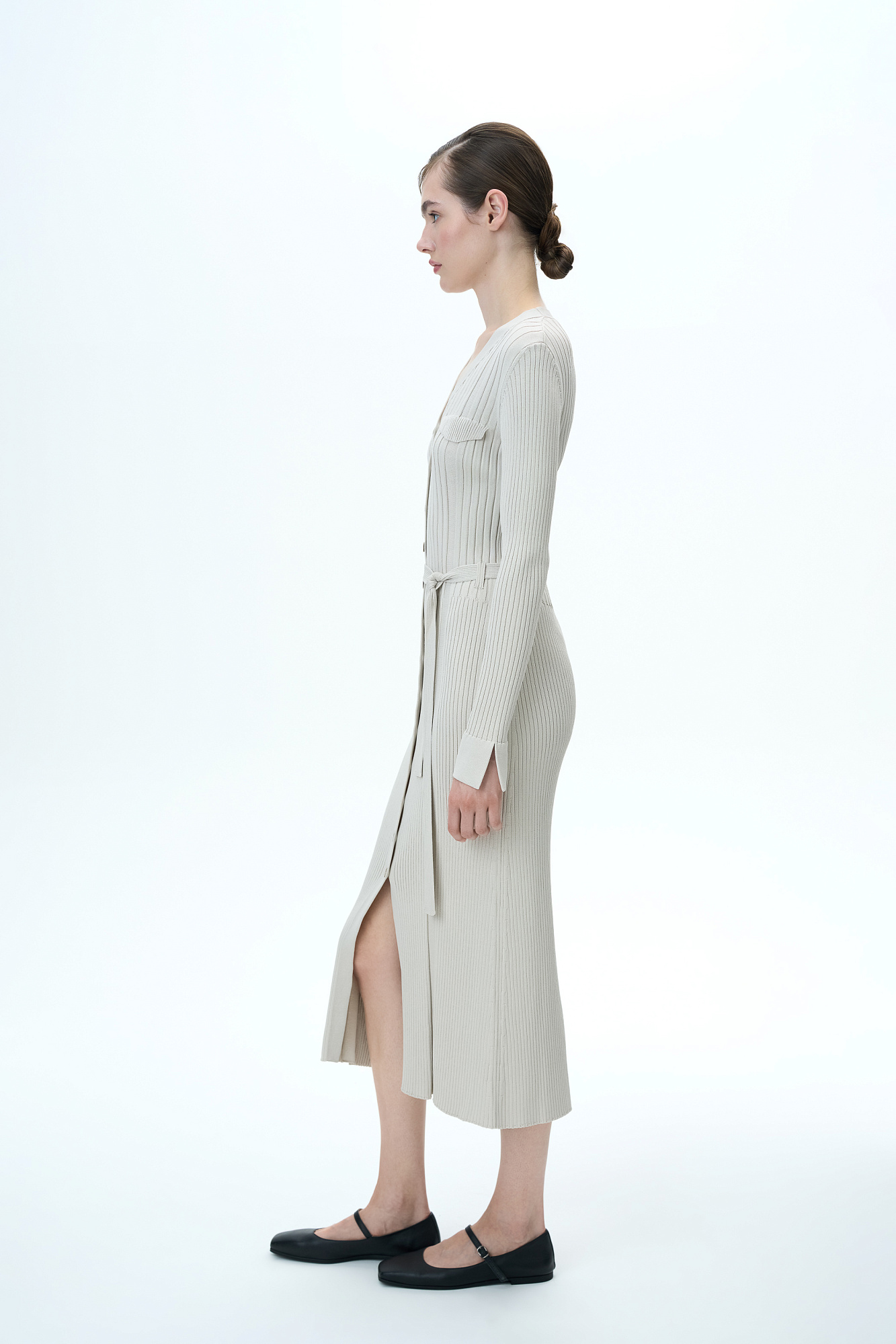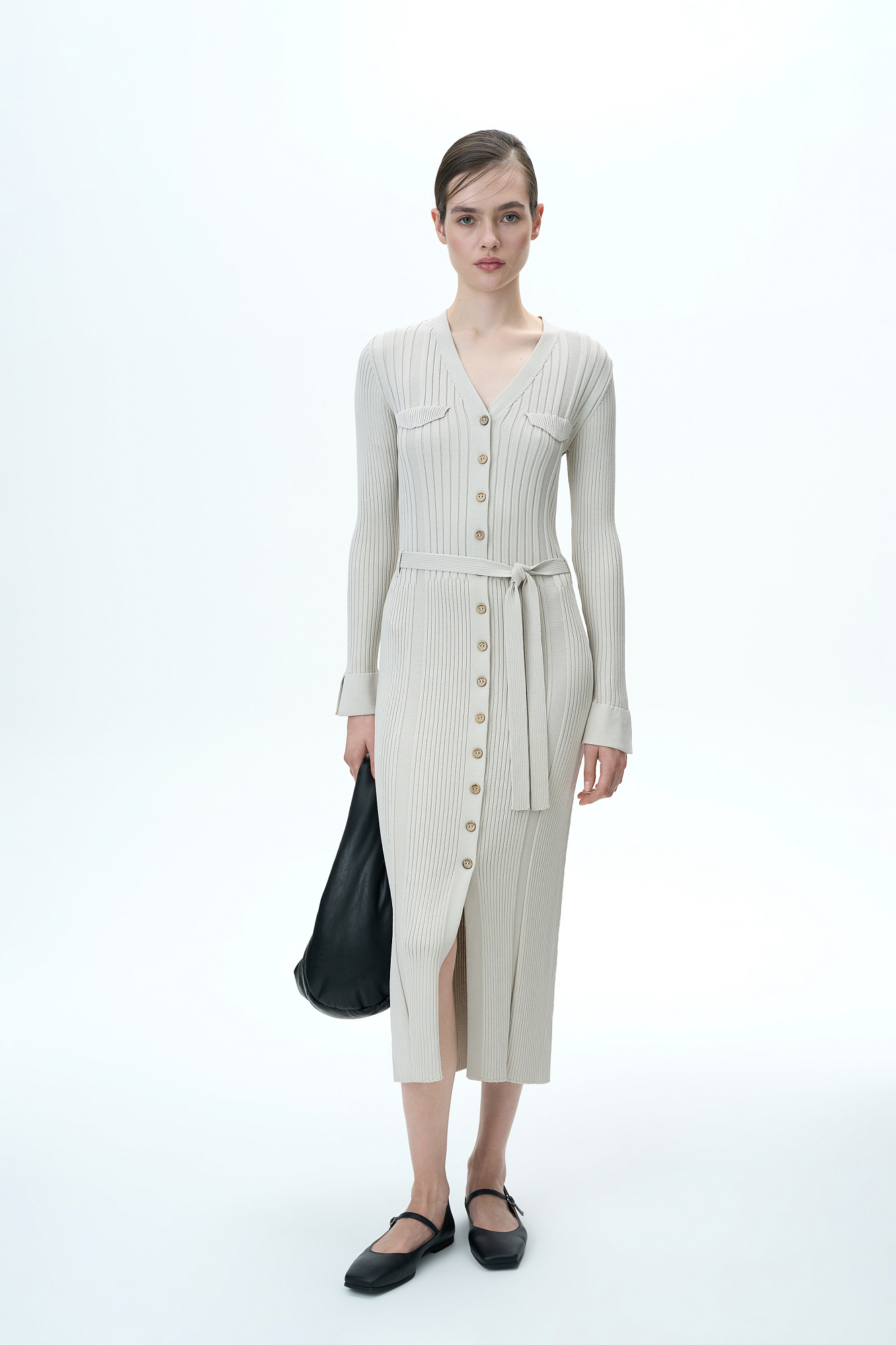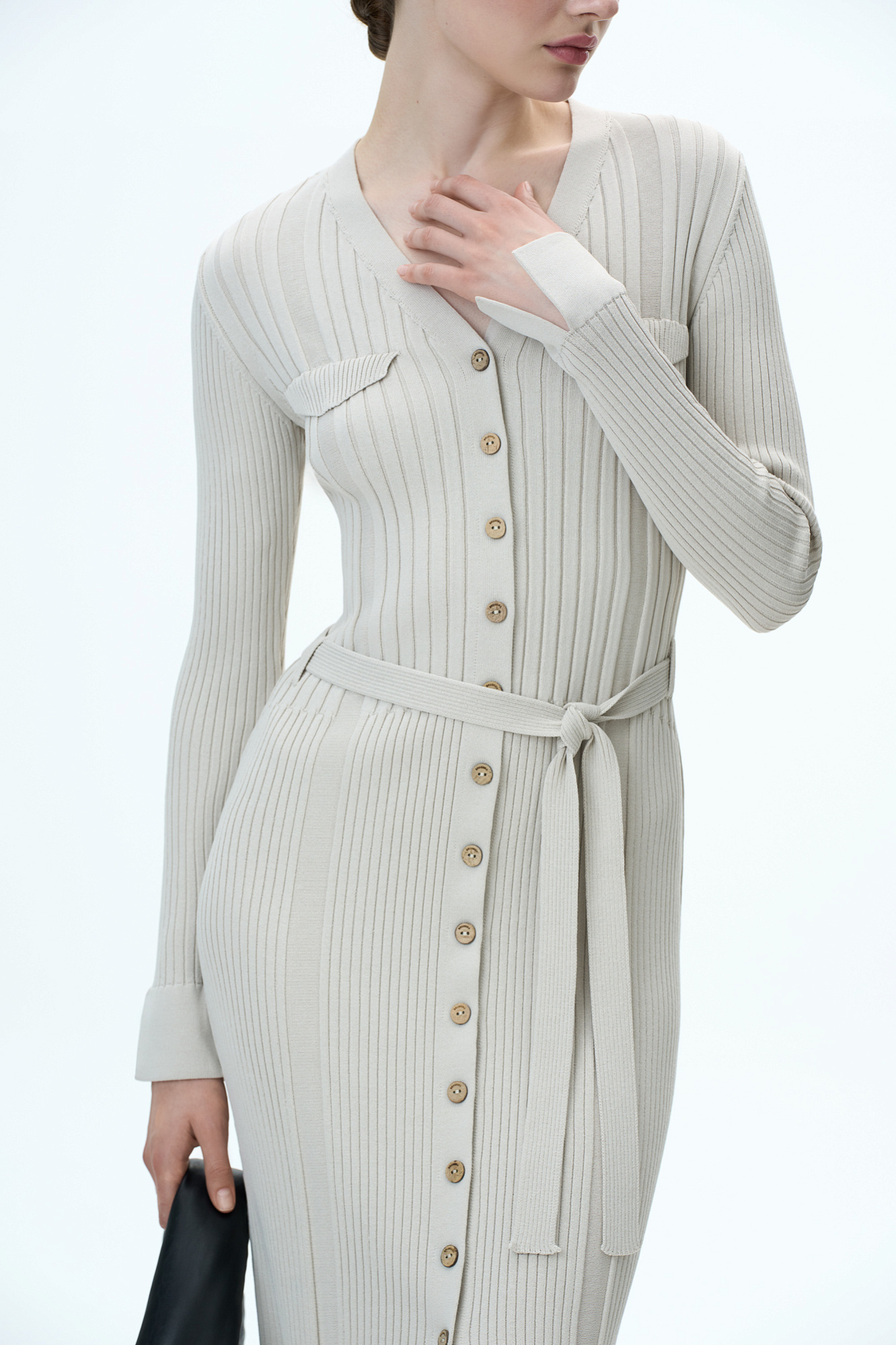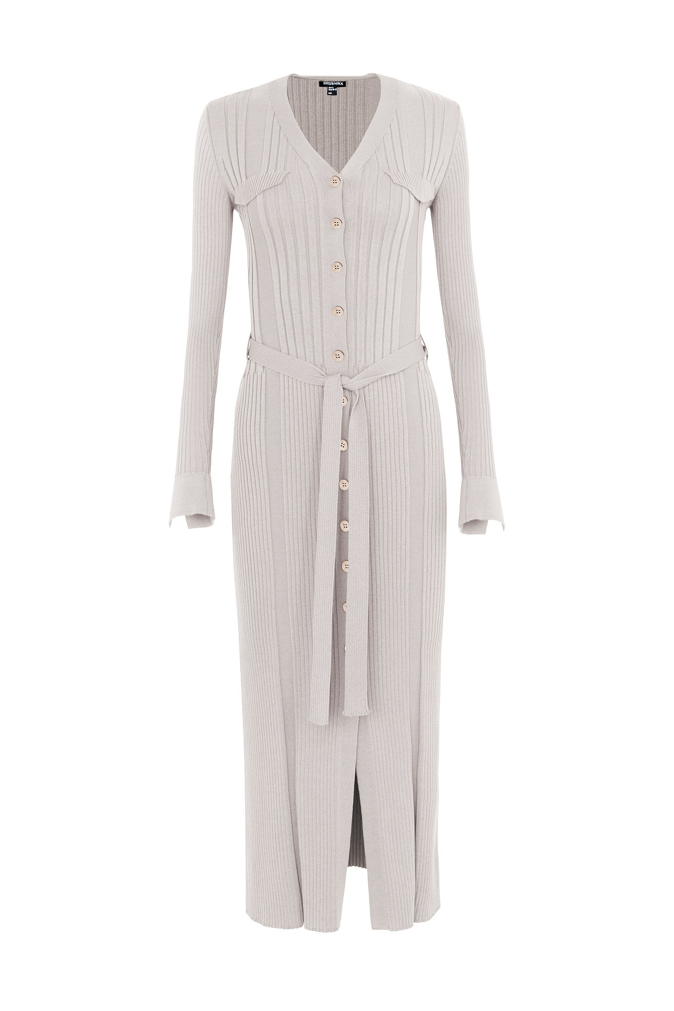 Трикотажное платье из вискозы в широкий рубчик с поясом в комплекте. Удлиненный манжет с разрезом, накладные карманы на груди, застежка на пуговицы. Платье можно использовать как кардиган.