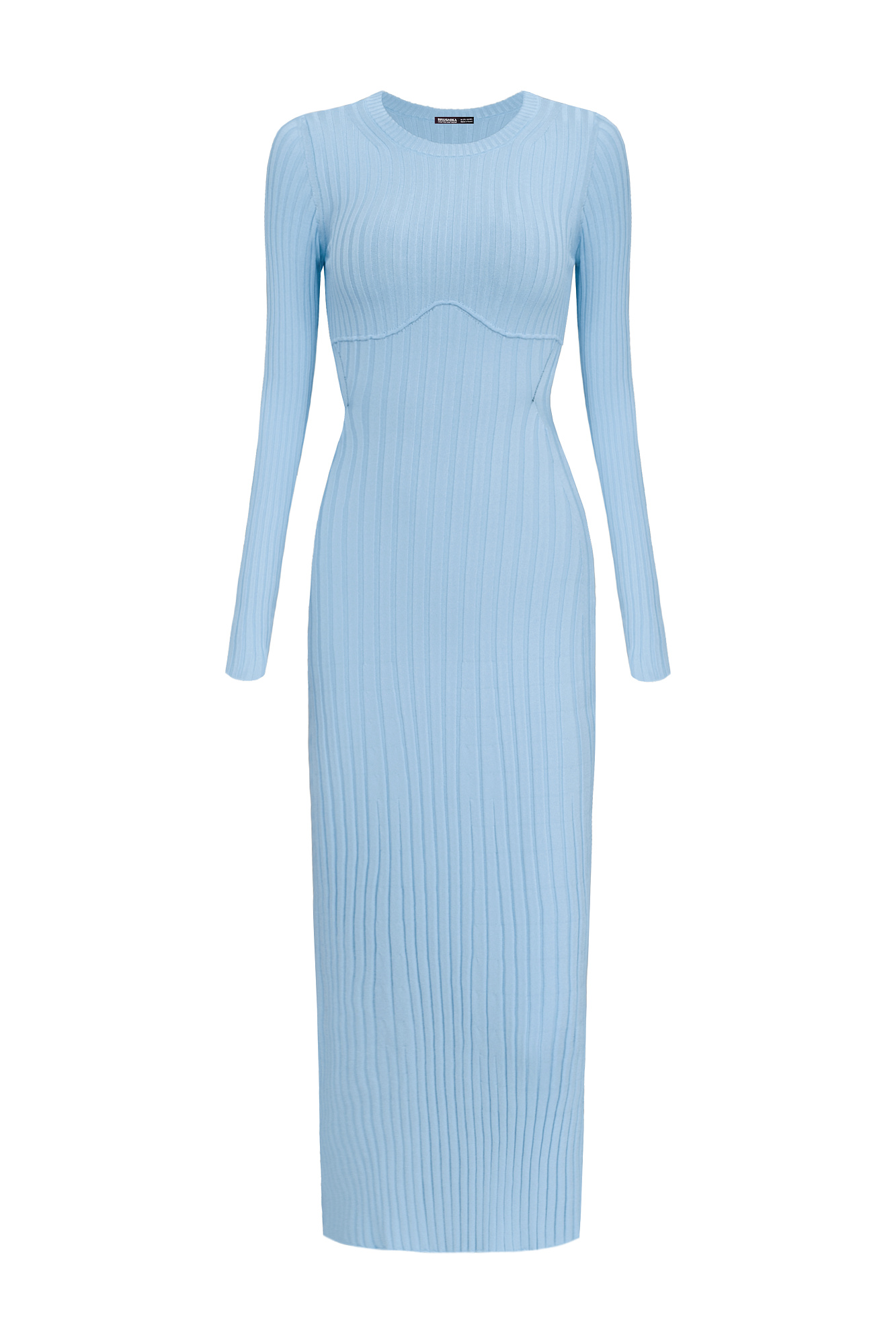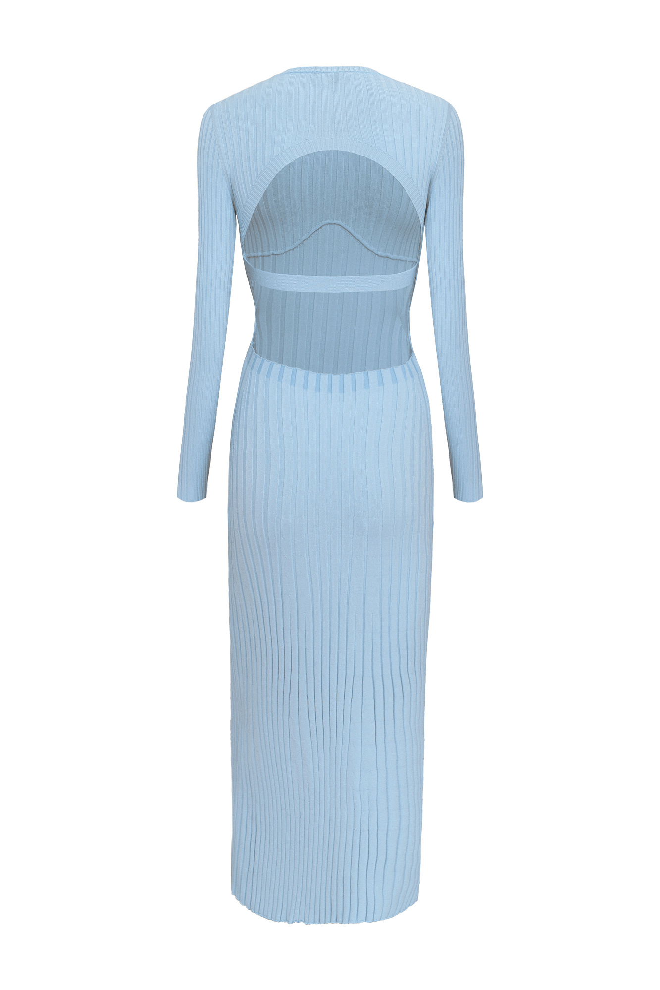 Трикотажное платье с открытой спиной. Круглый вырез и длинные рукава.