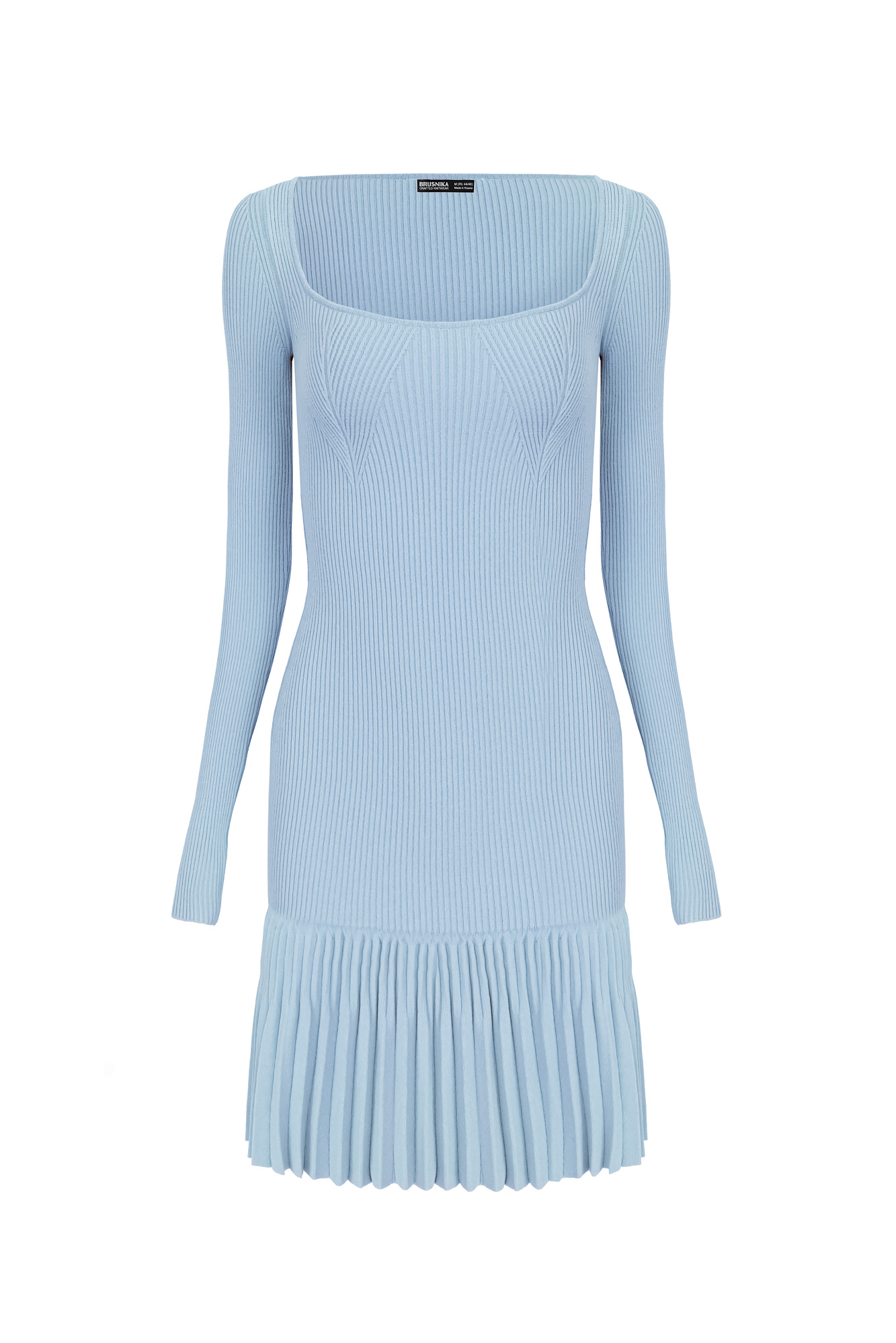 Трикотажное платье из вискозы с плиссированной юбкой, длинным рукавом и квадратным вырезом.
