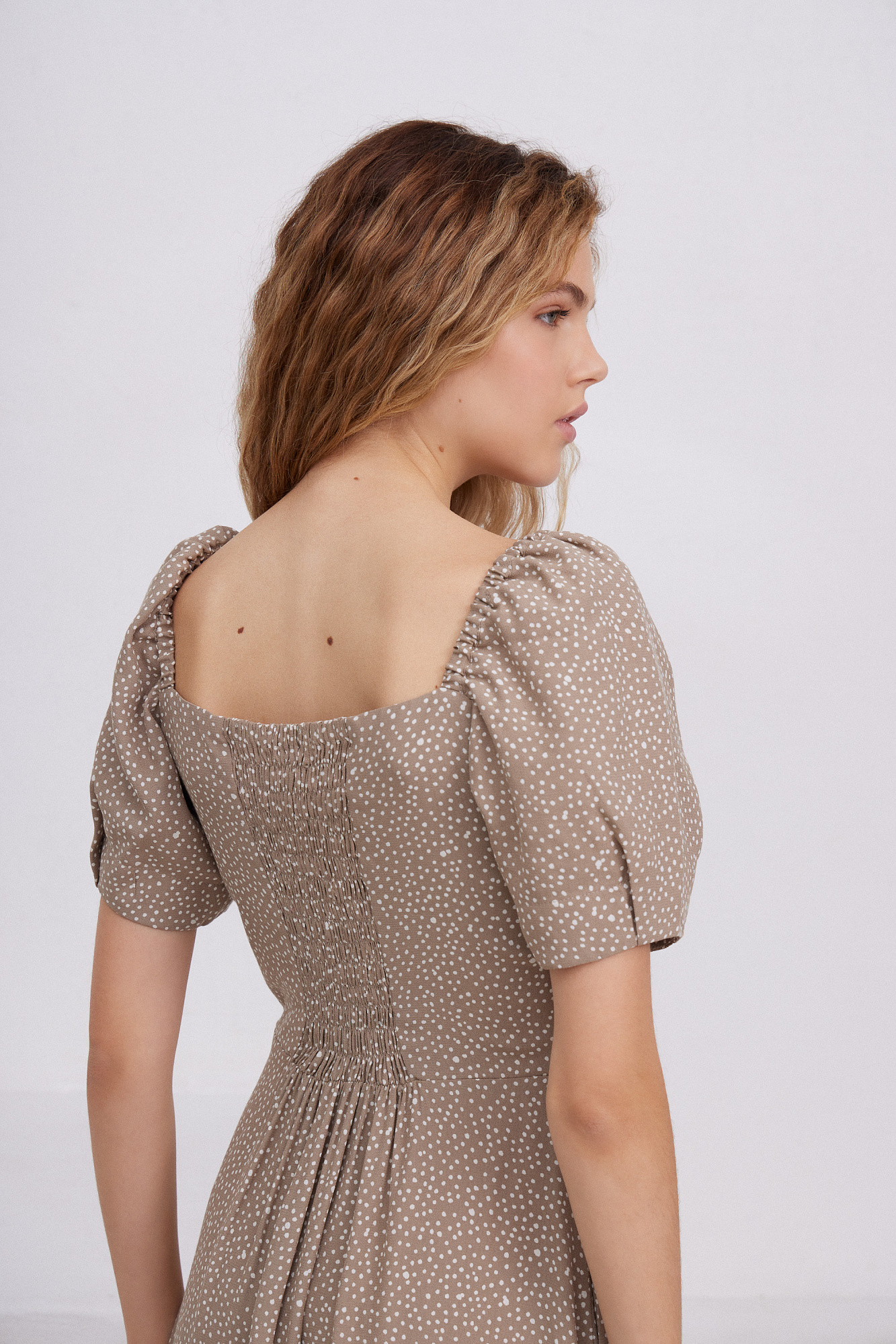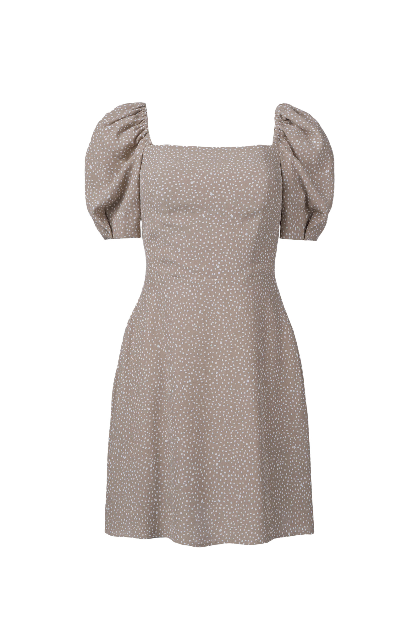Короткое платье из 100% вискозы в горошек с пышным рукавом.