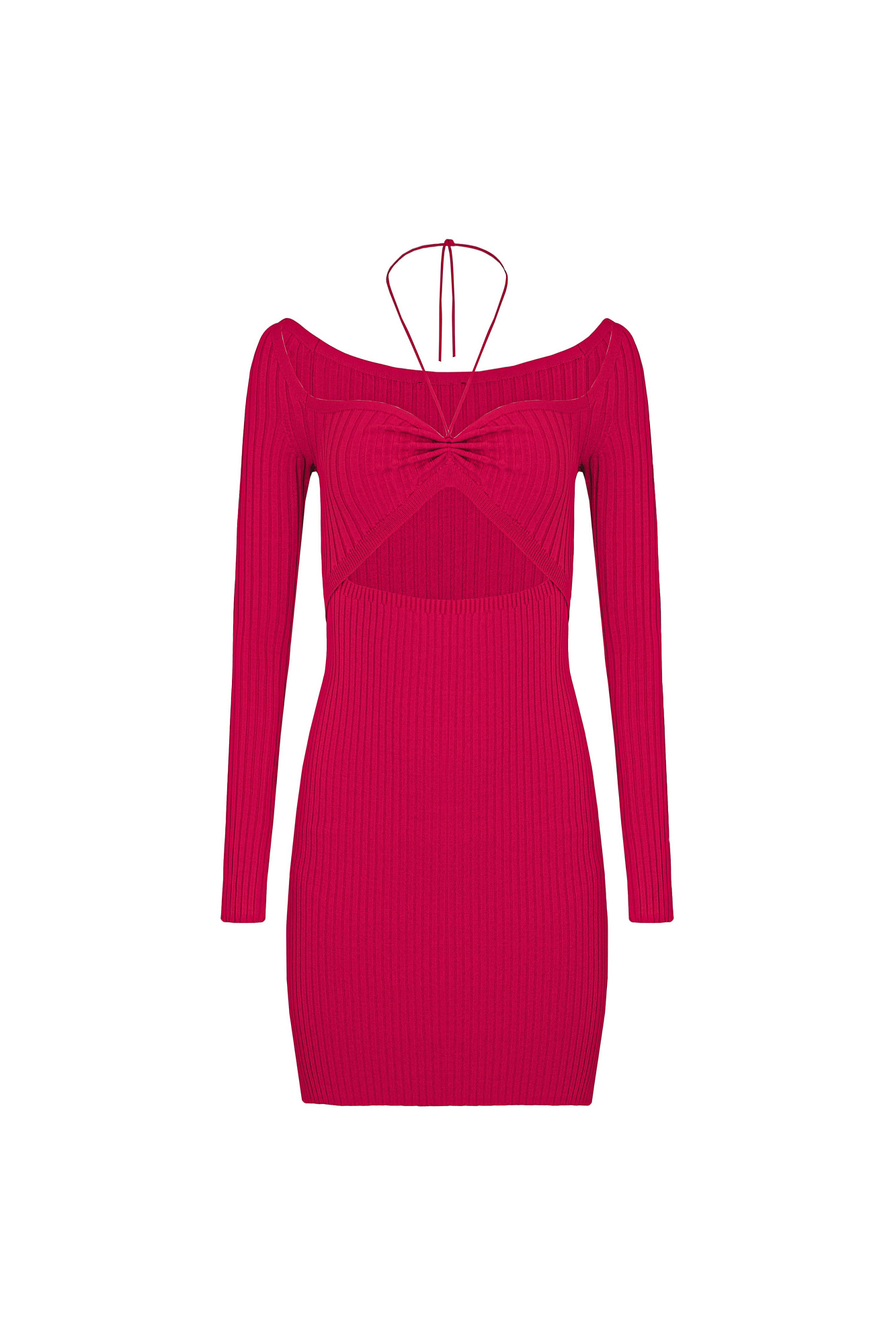 Платье длины мини из вискозы в широкий рубчик. Модель с длинными рукавами, разрезами на манжетах и глубоким вырезом декольте на кулиске, которую можно зафиксировать на шее.