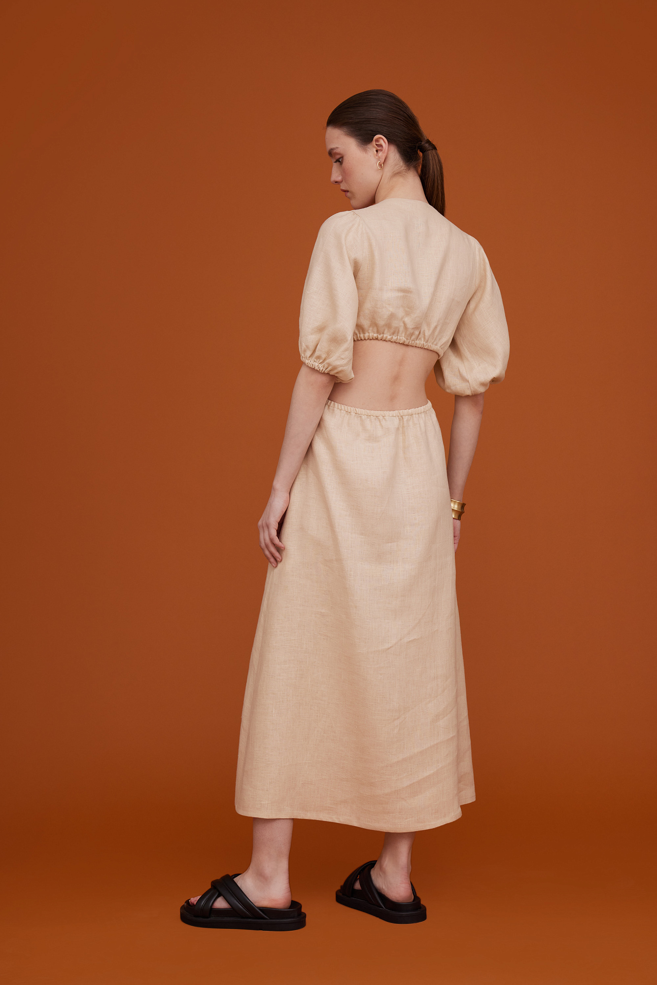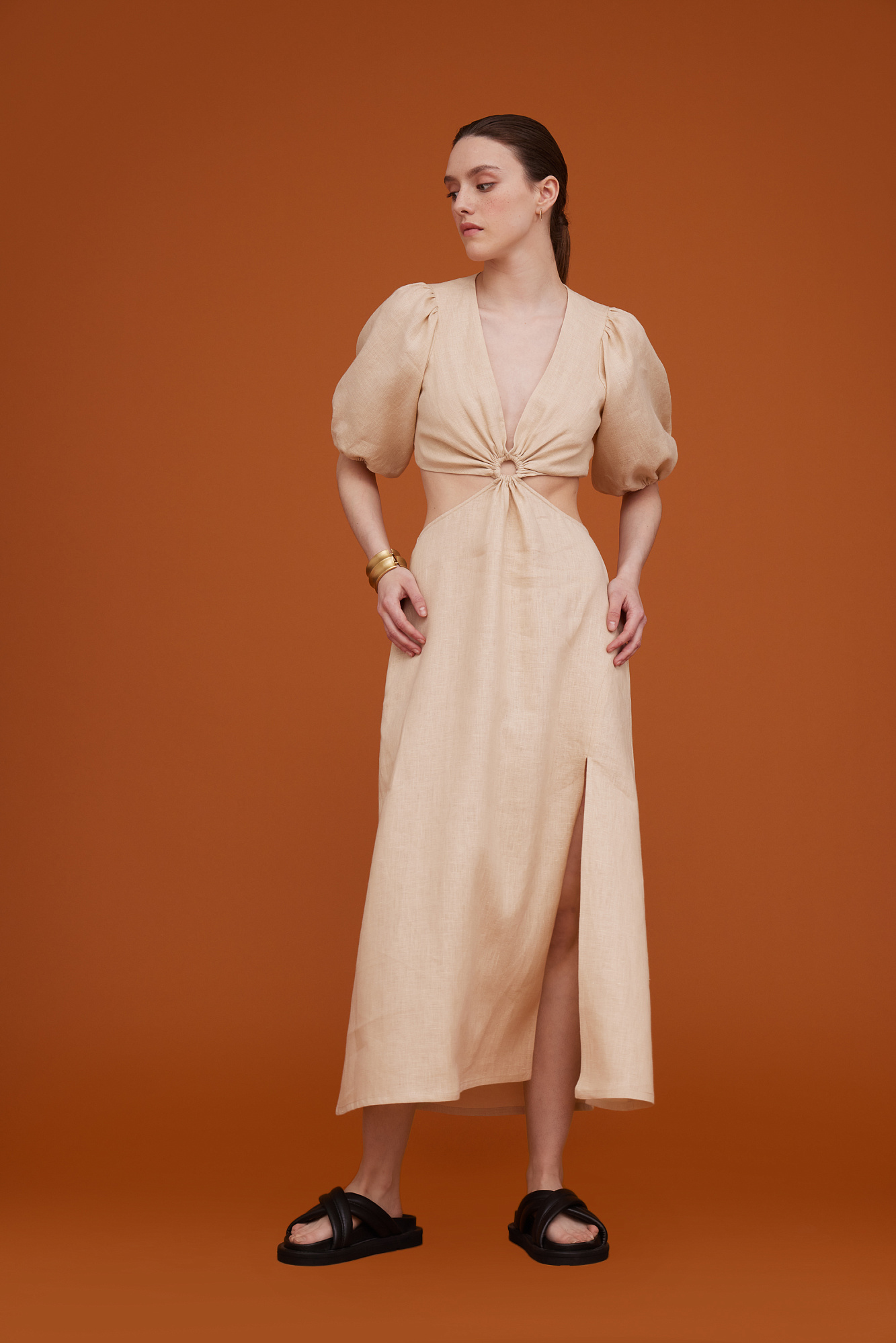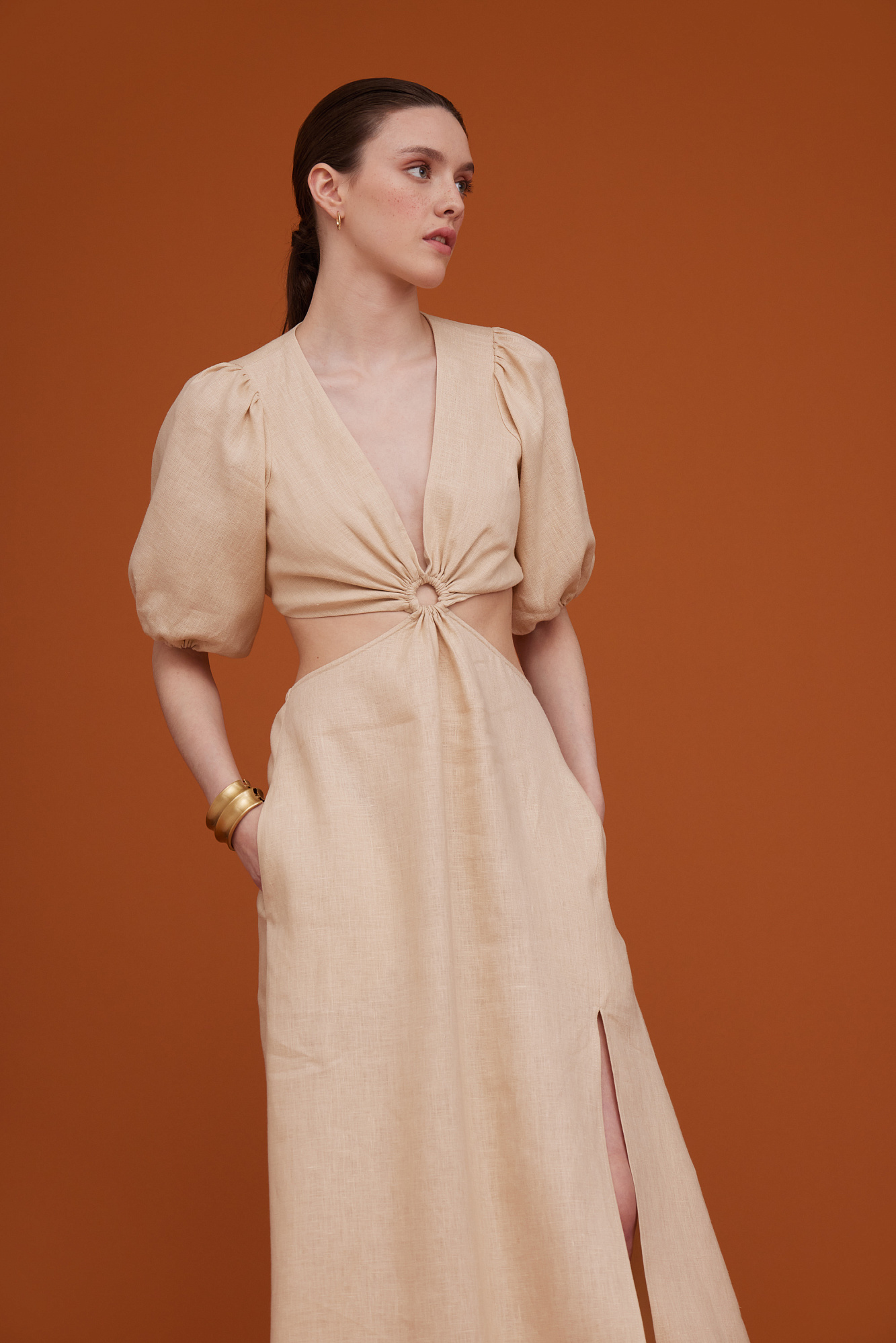 Плать из 100% льна с разрезом сбоку и вырезом на талии. Рукава-фонарики.