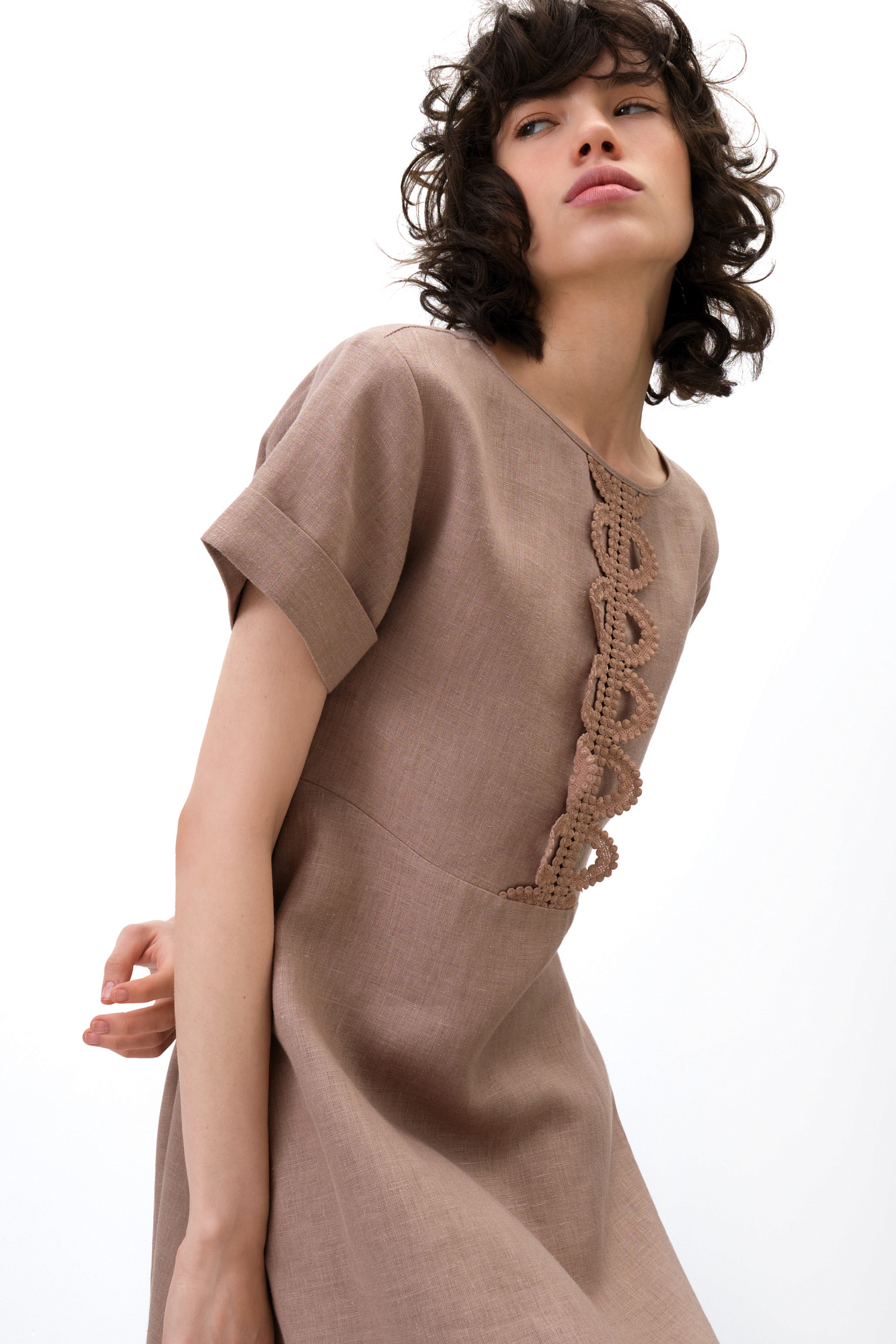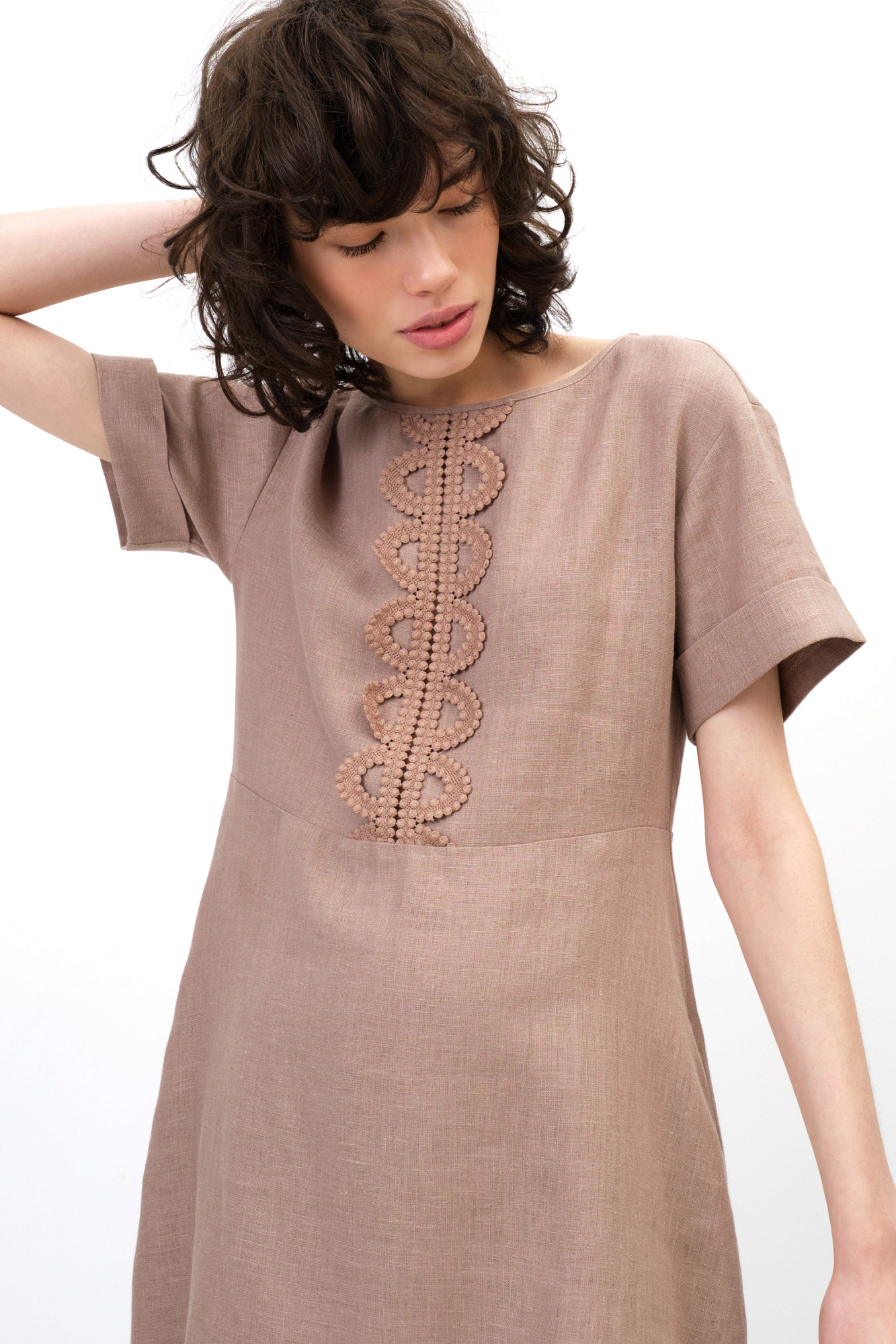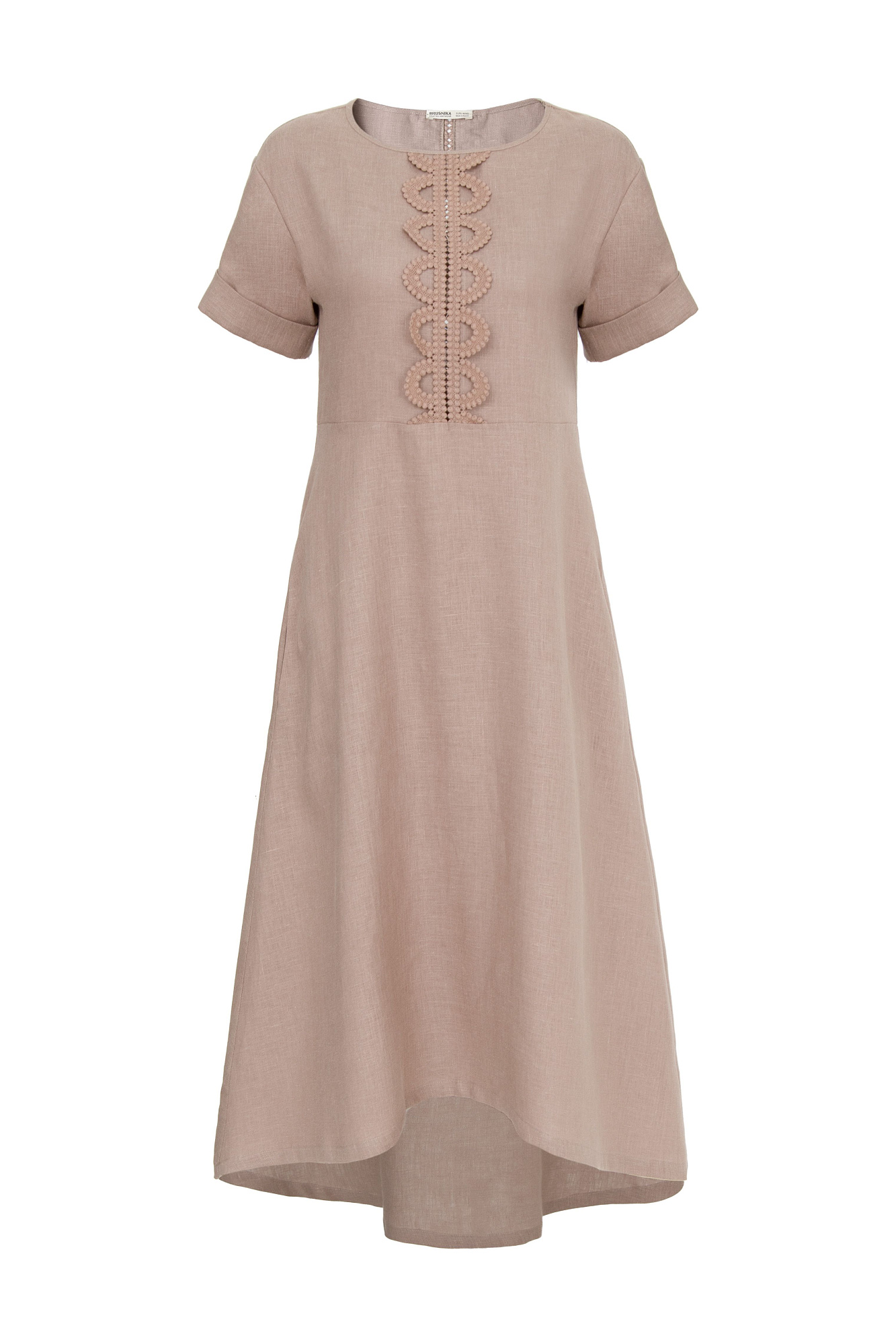 Платье длины миди из 100% льна. Модель с коротким рукавом и круглым вырезом горловины. Изделие декорировано кружевом.