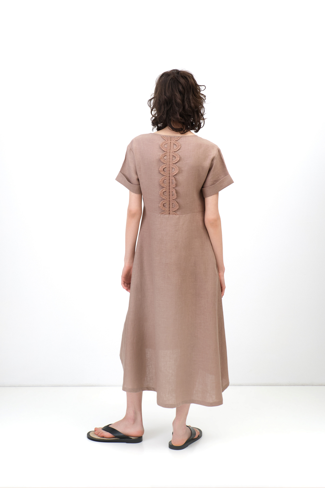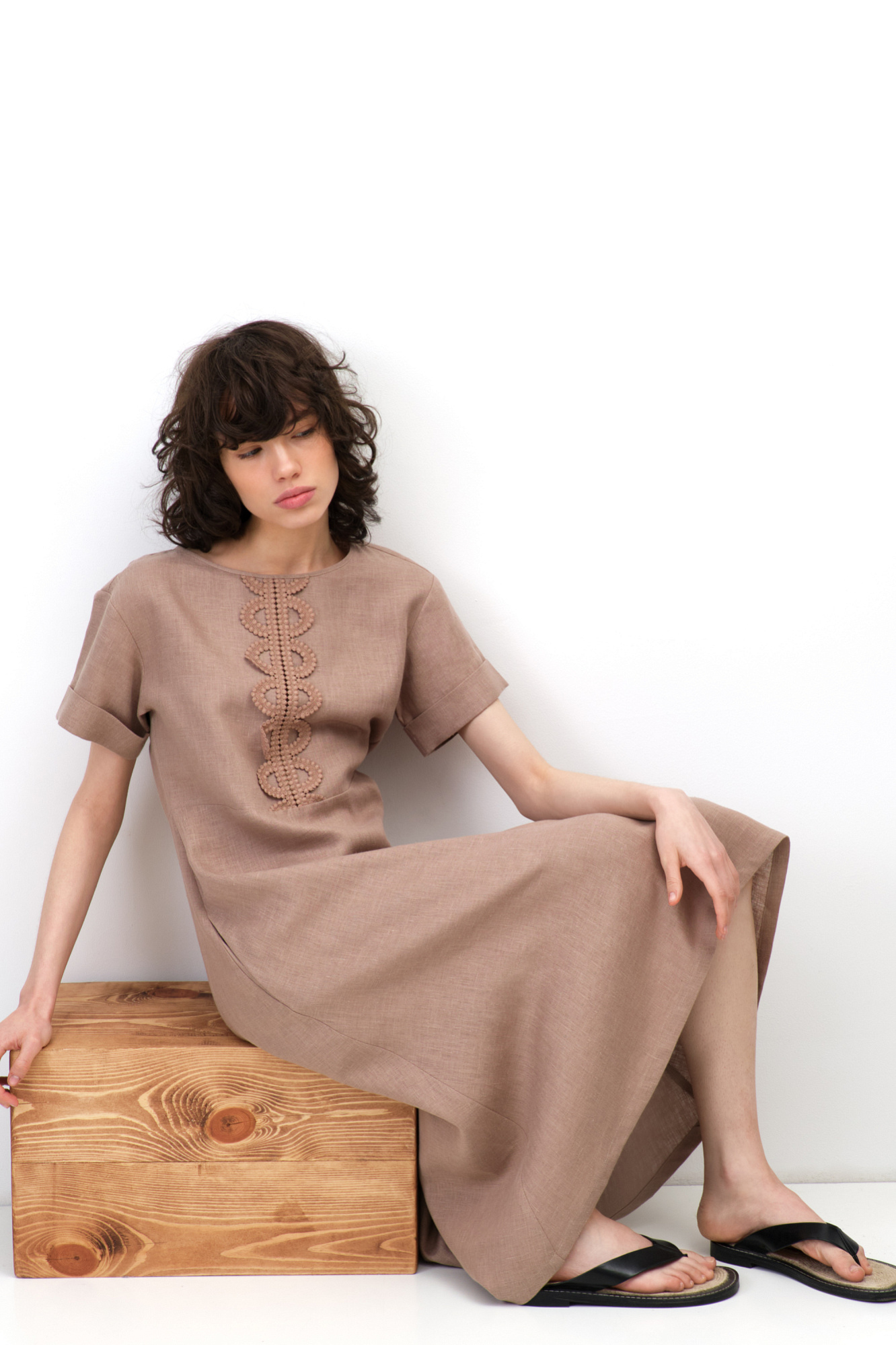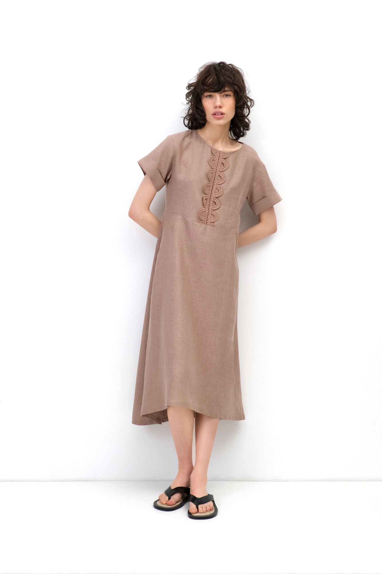 Платье длины миди из 100% льна. Модель с коротким рукавом и круглым вырезом горловины. Изделие декорировано кружевом.