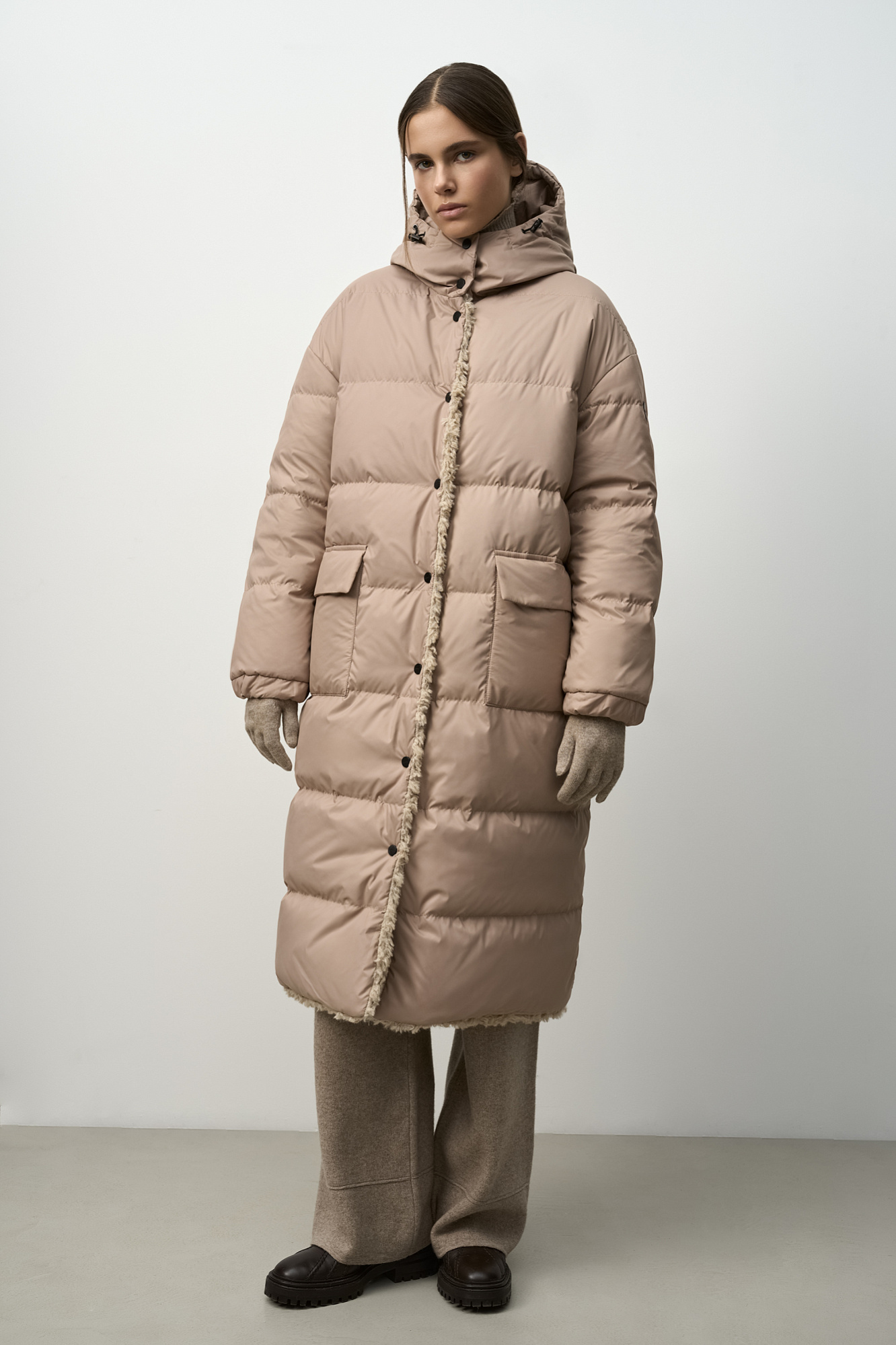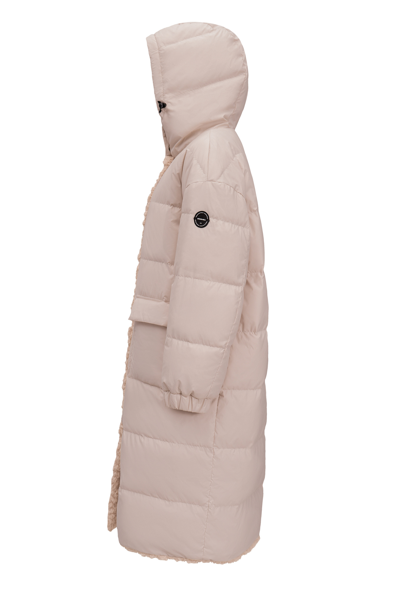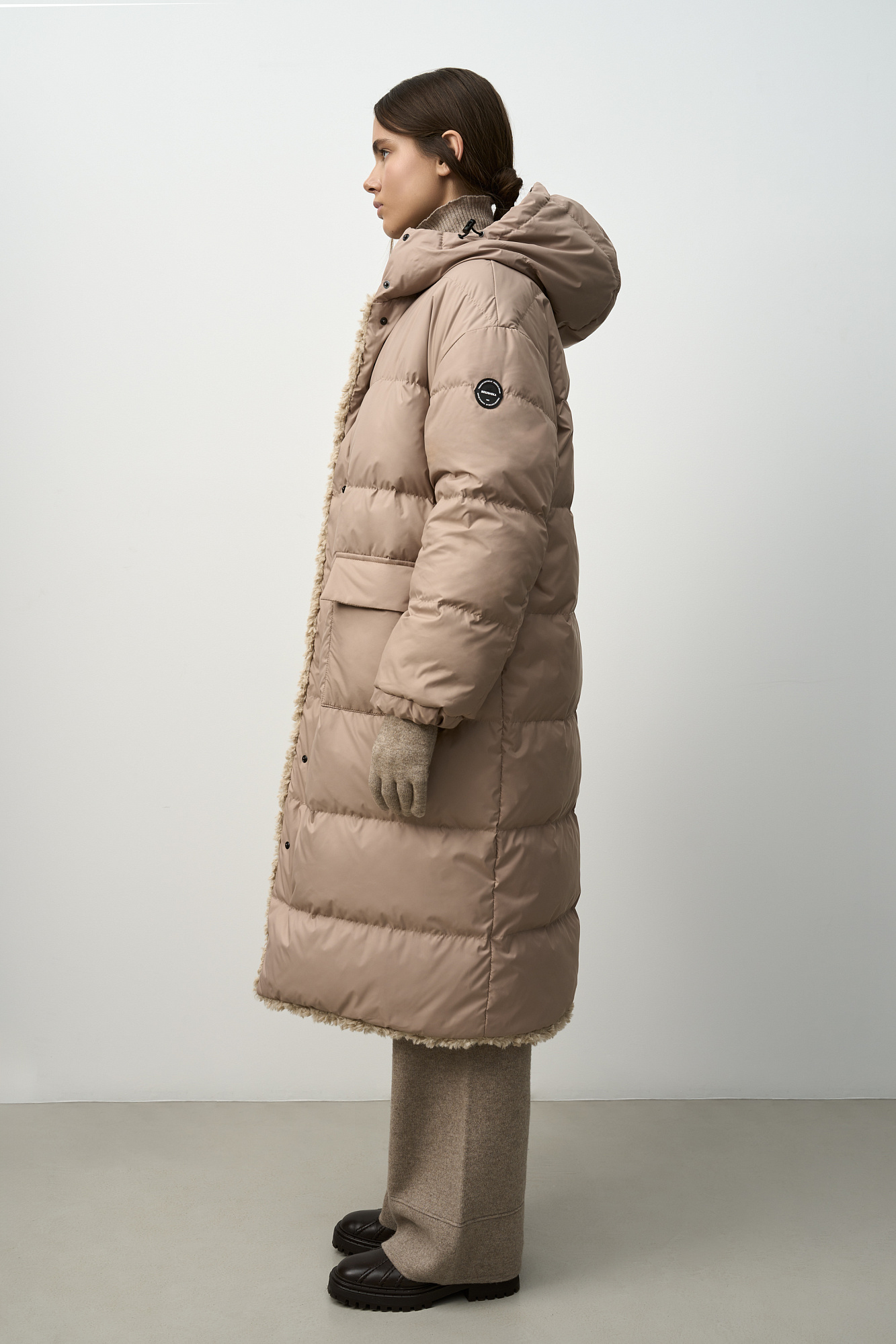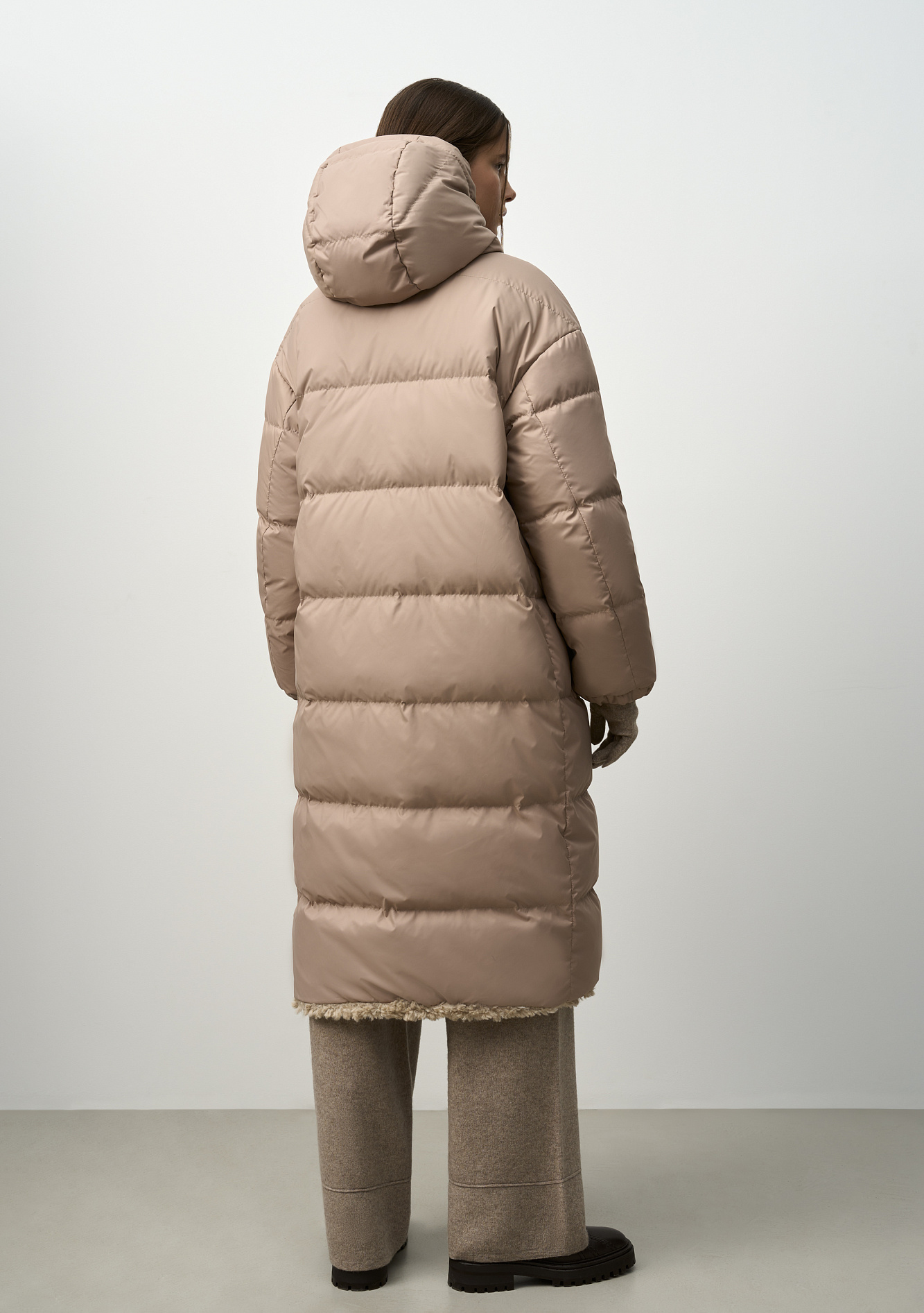 Двусторонний пуховик из плащевки и экомеха. Модель свободного силуэта с капюшоном на регулируемой кулиске с фиксатором, накладными карманами и брендированным ярлыком на рукаве. Застежка на кнопки.