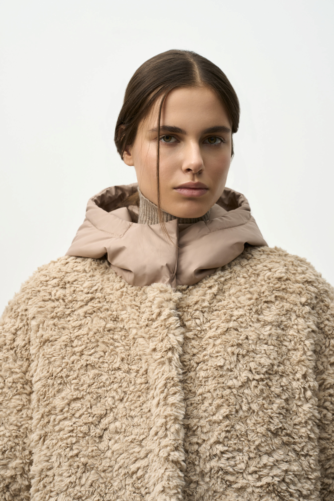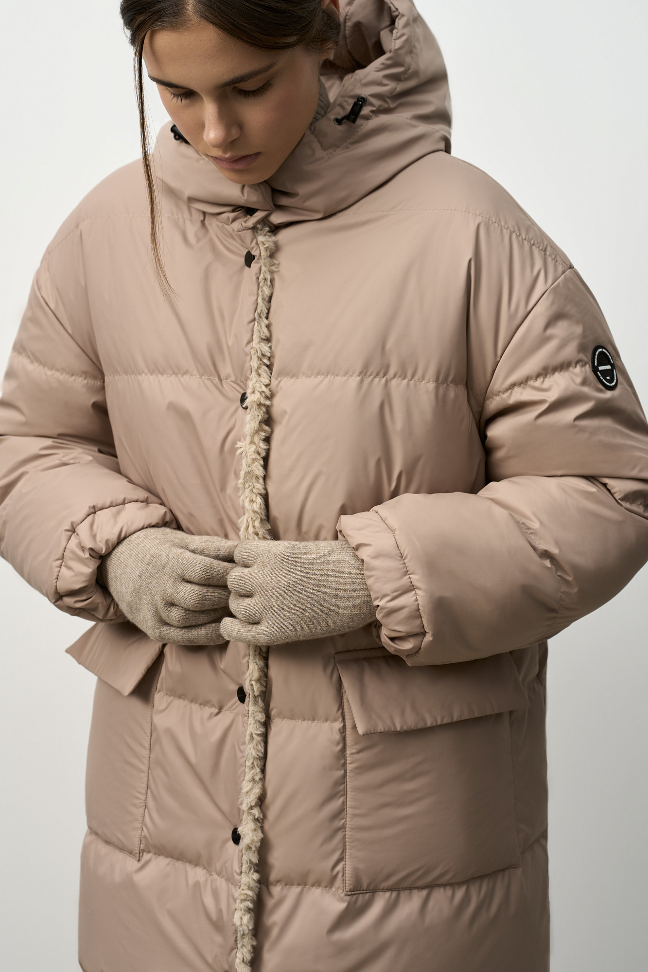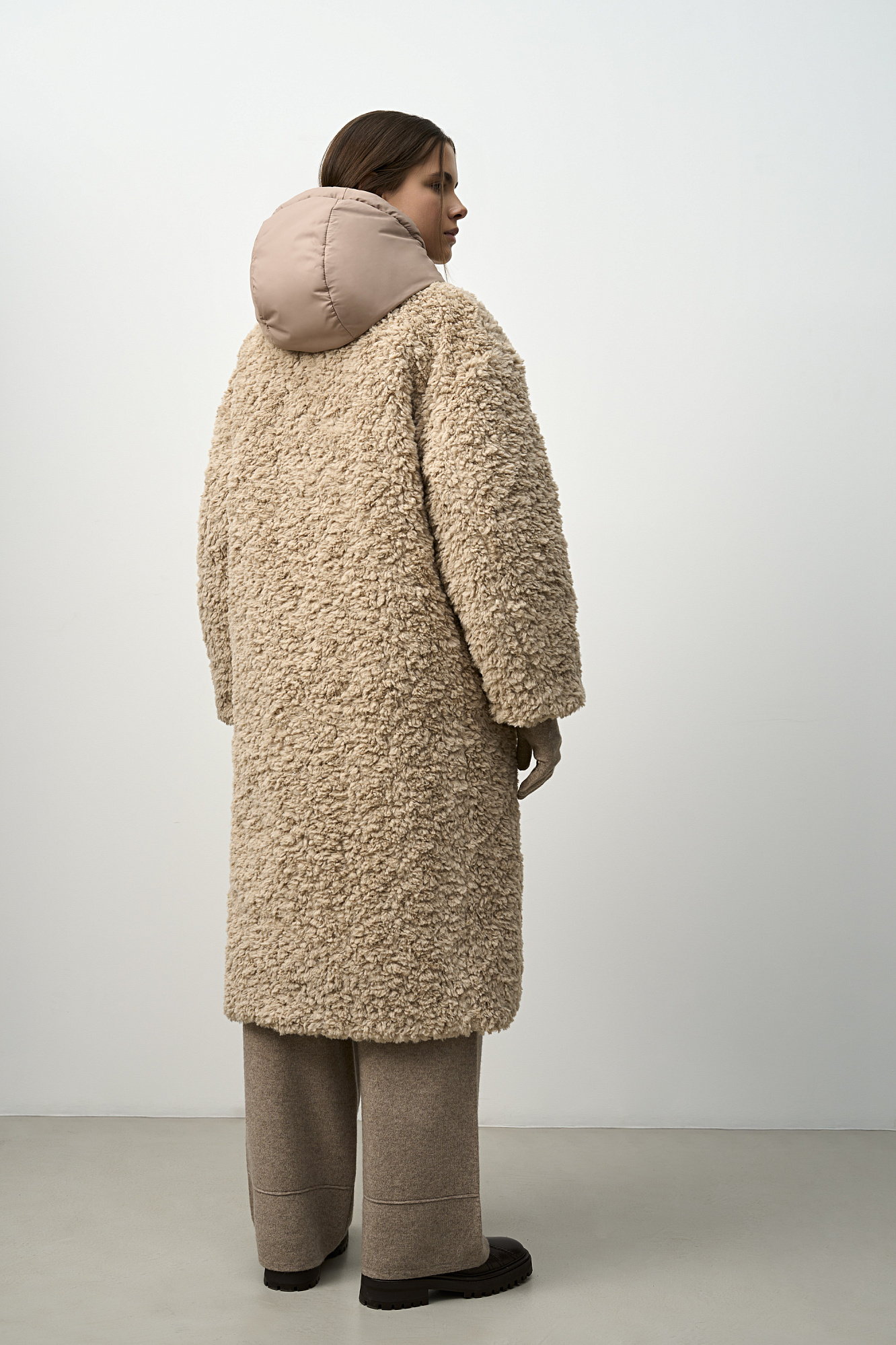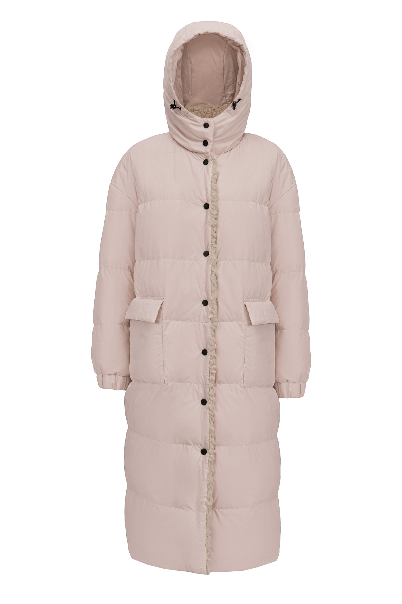 Двусторонний пуховик из плащевки и экомеха. Модель свободного силуэта с капюшоном на регулируемой кулиске с фиксатором, накладными карманами и брендированным ярлыком на рукаве. Застежка на кнопки.