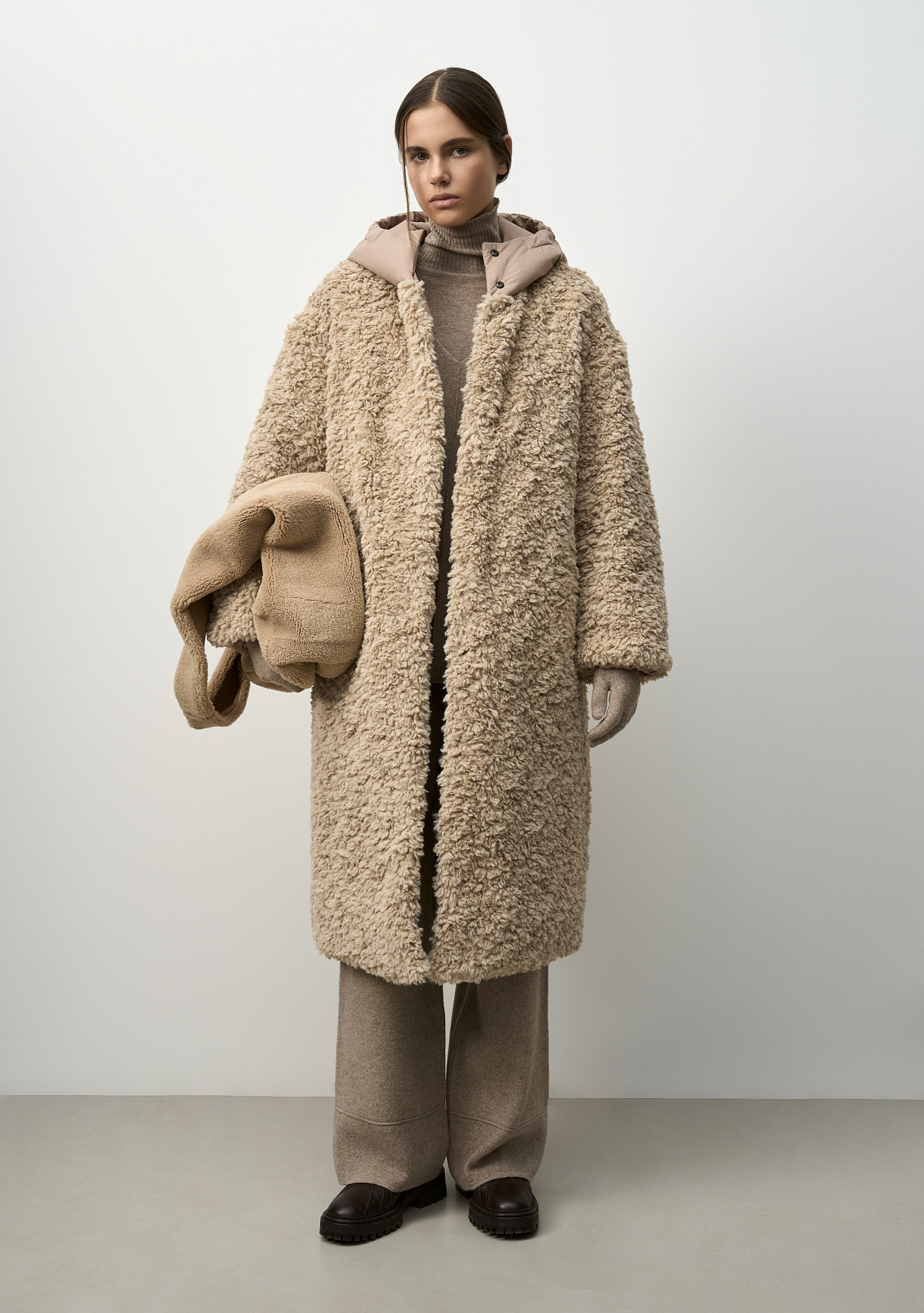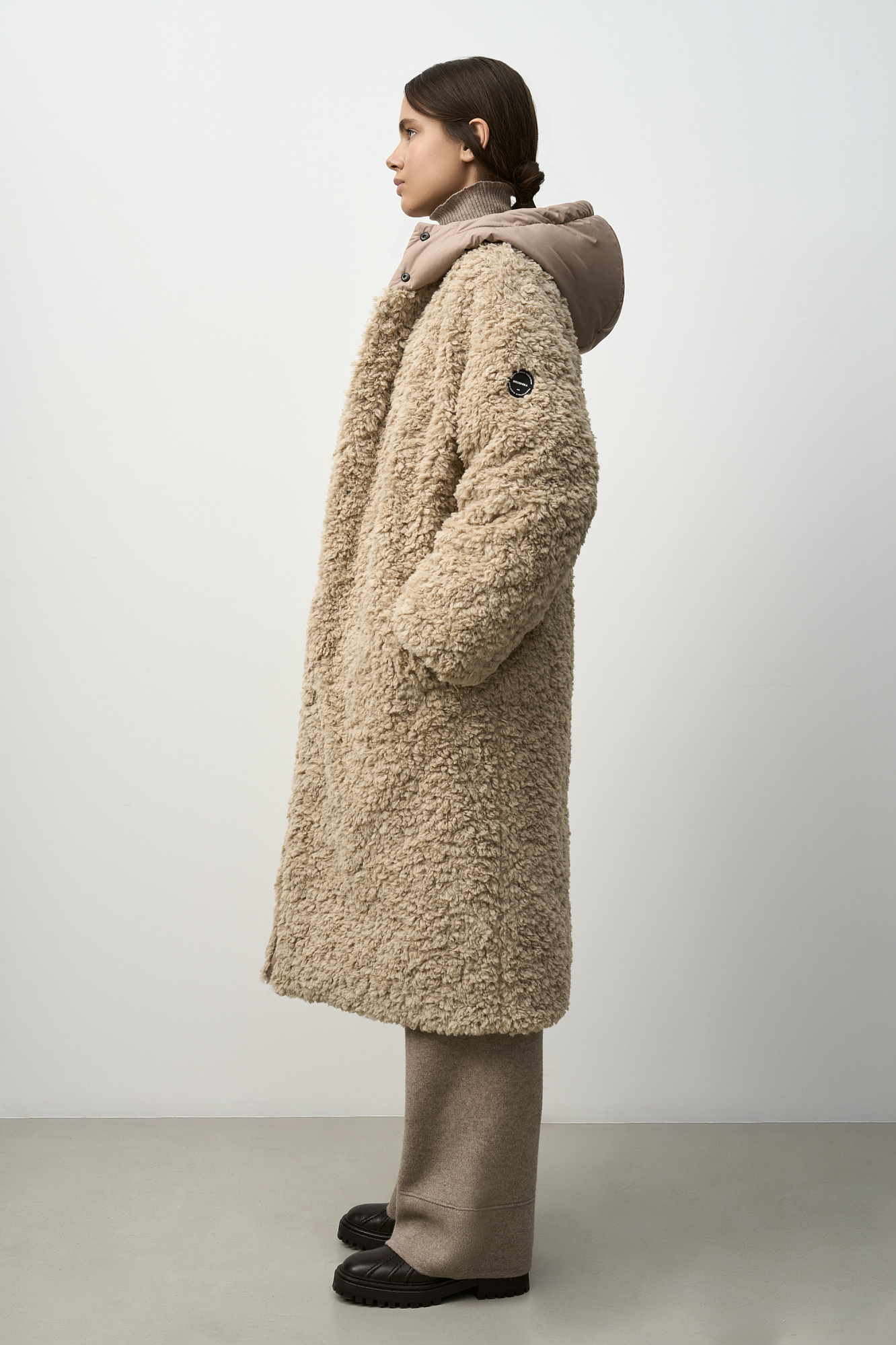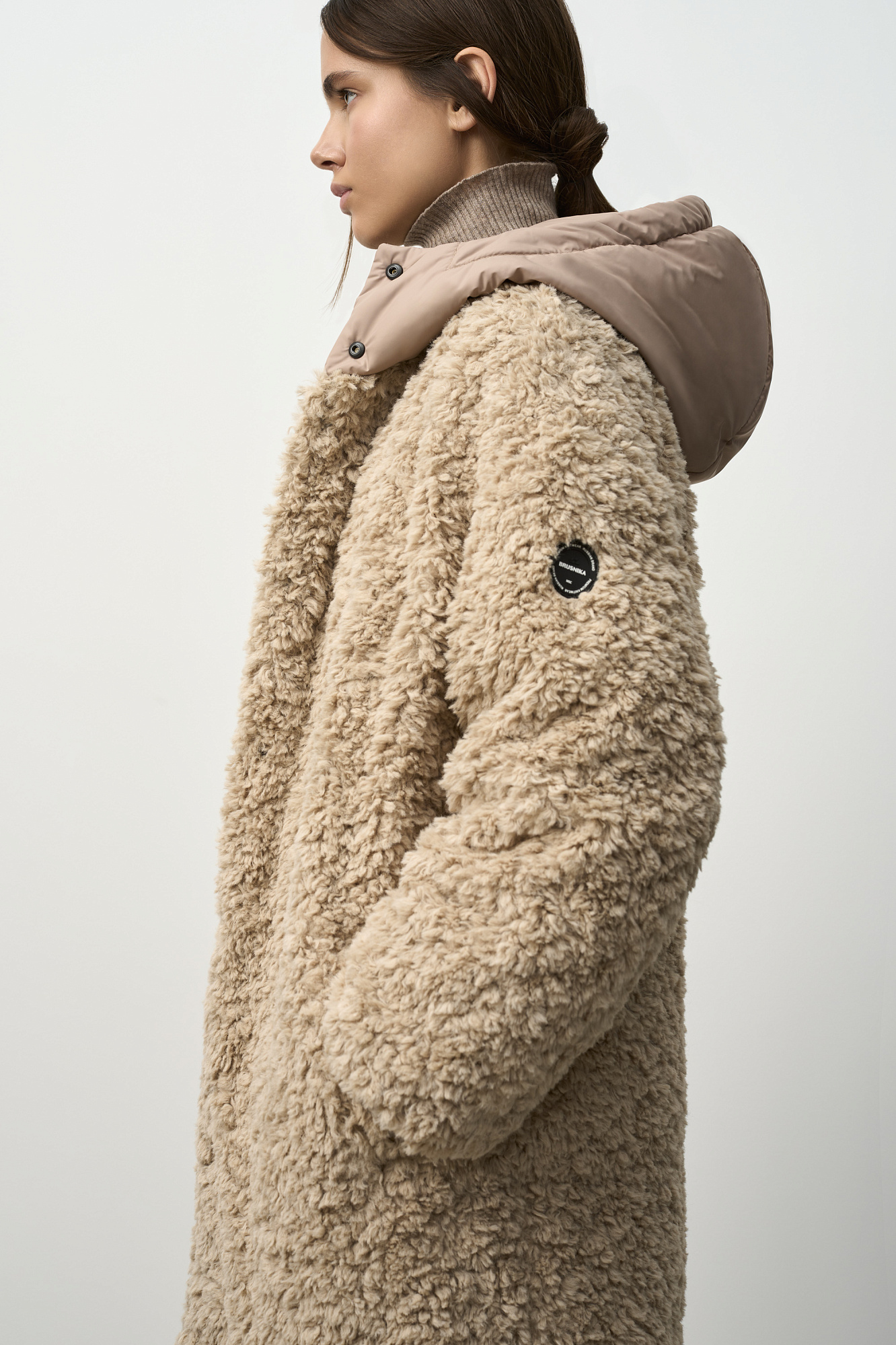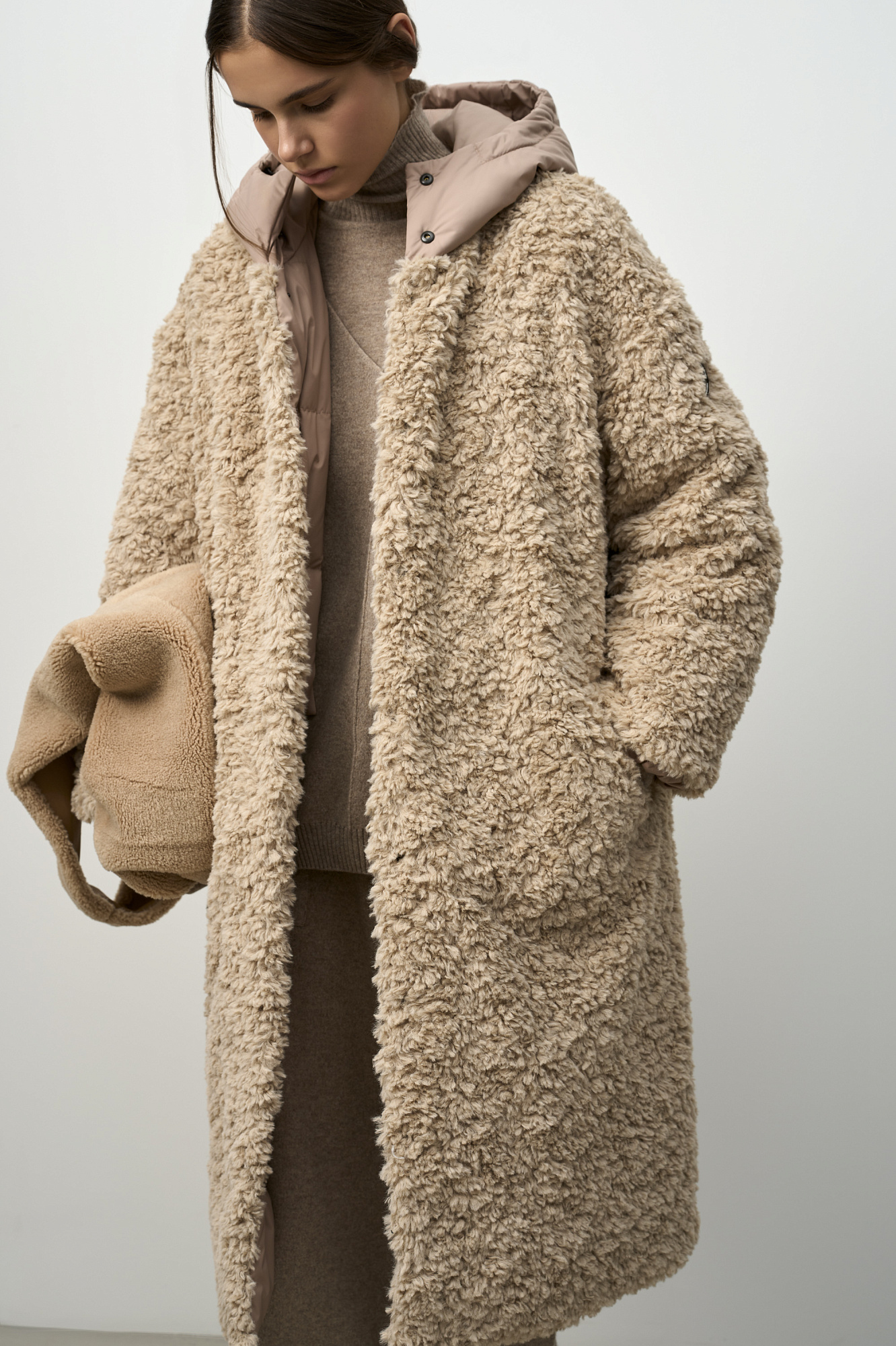 Двусторонний пуховик из плащевки и экомеха. Модель свободного силуэта с капюшоном на регулируемой кулиске с фиксатором, накладными карманами и брендированным ярлыком на рукаве. Застежка на кнопки.