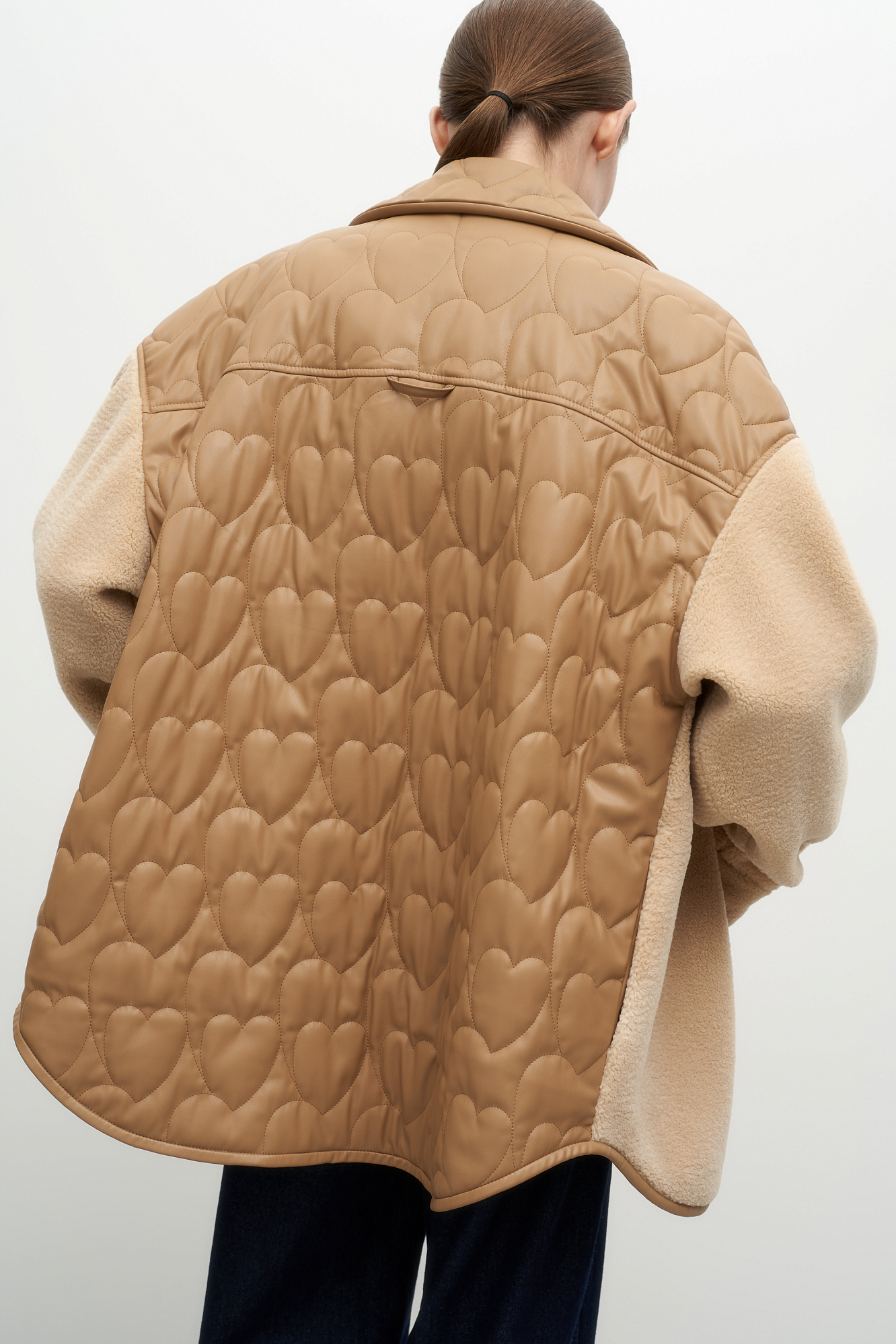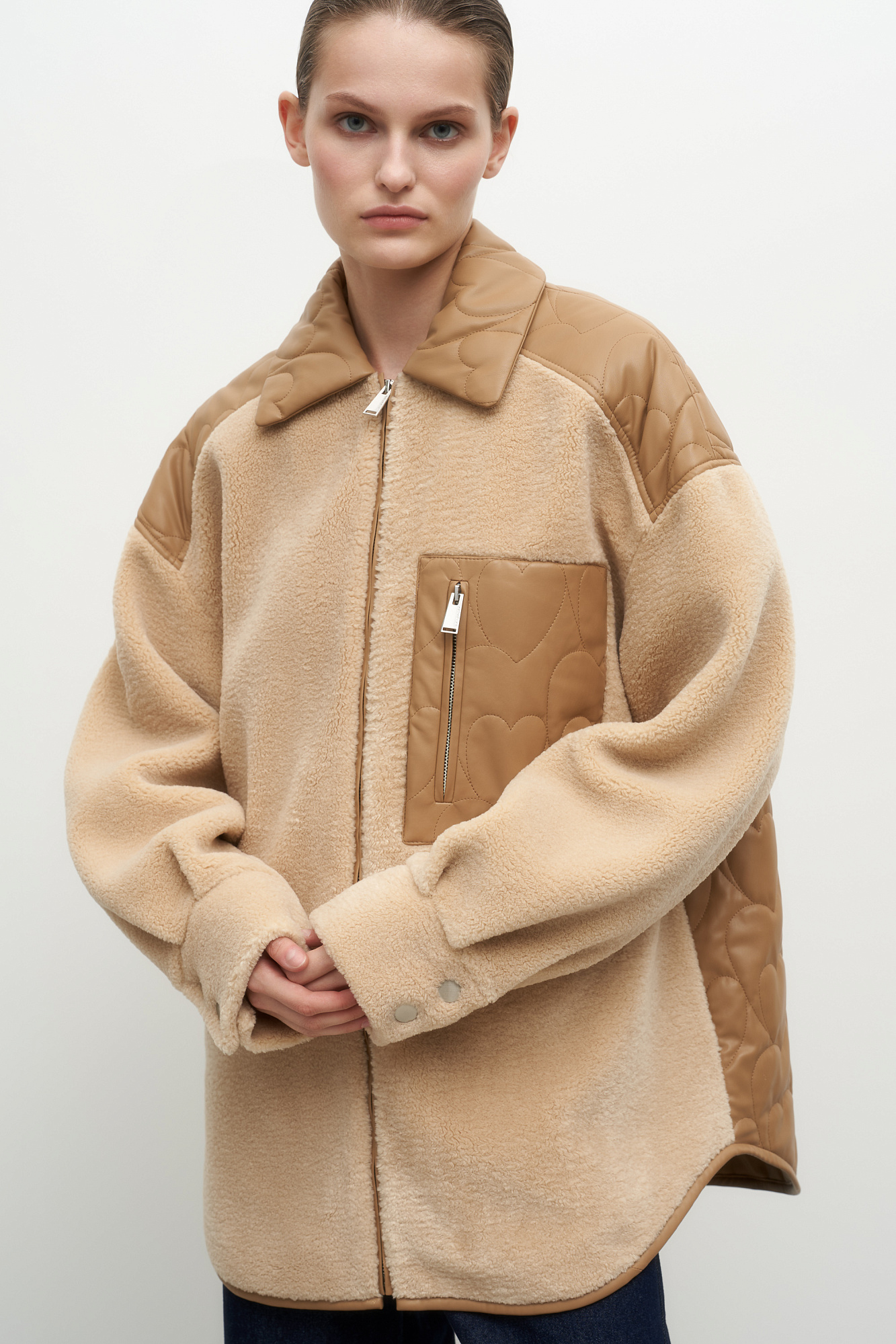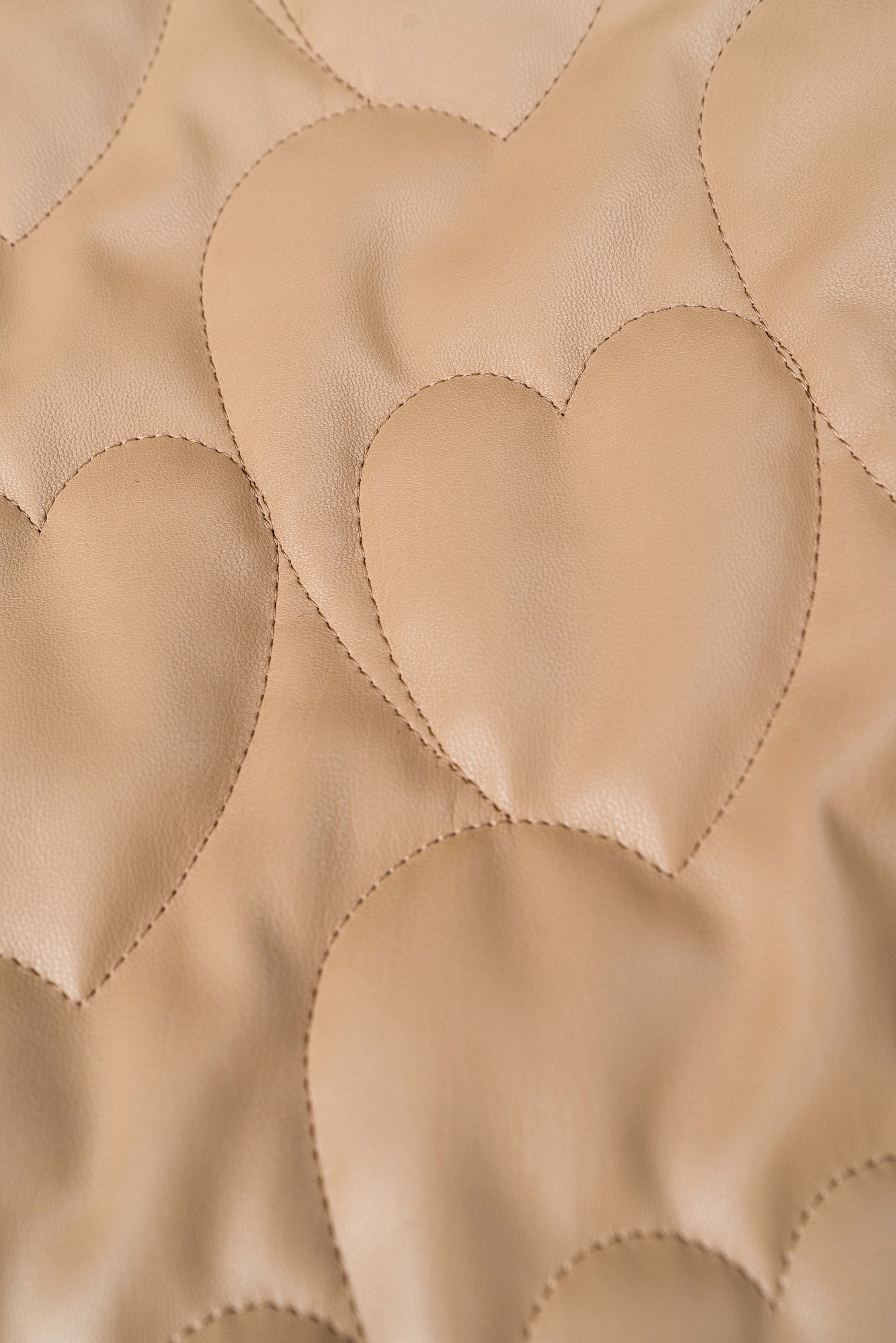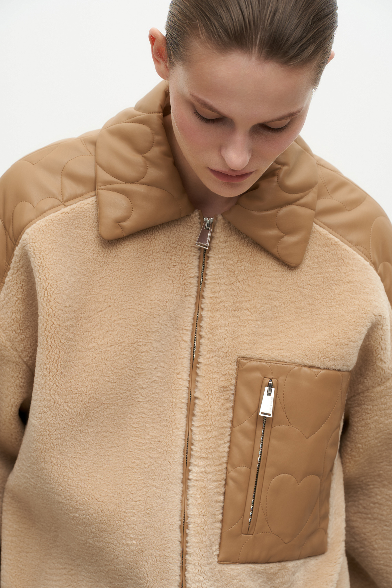 Утепленный бомбер из экомеха со спущеным плечом. Модель свободного силуэта с накладным карманом, отложным воротником и стежкой в виде сердец. На подкладке.